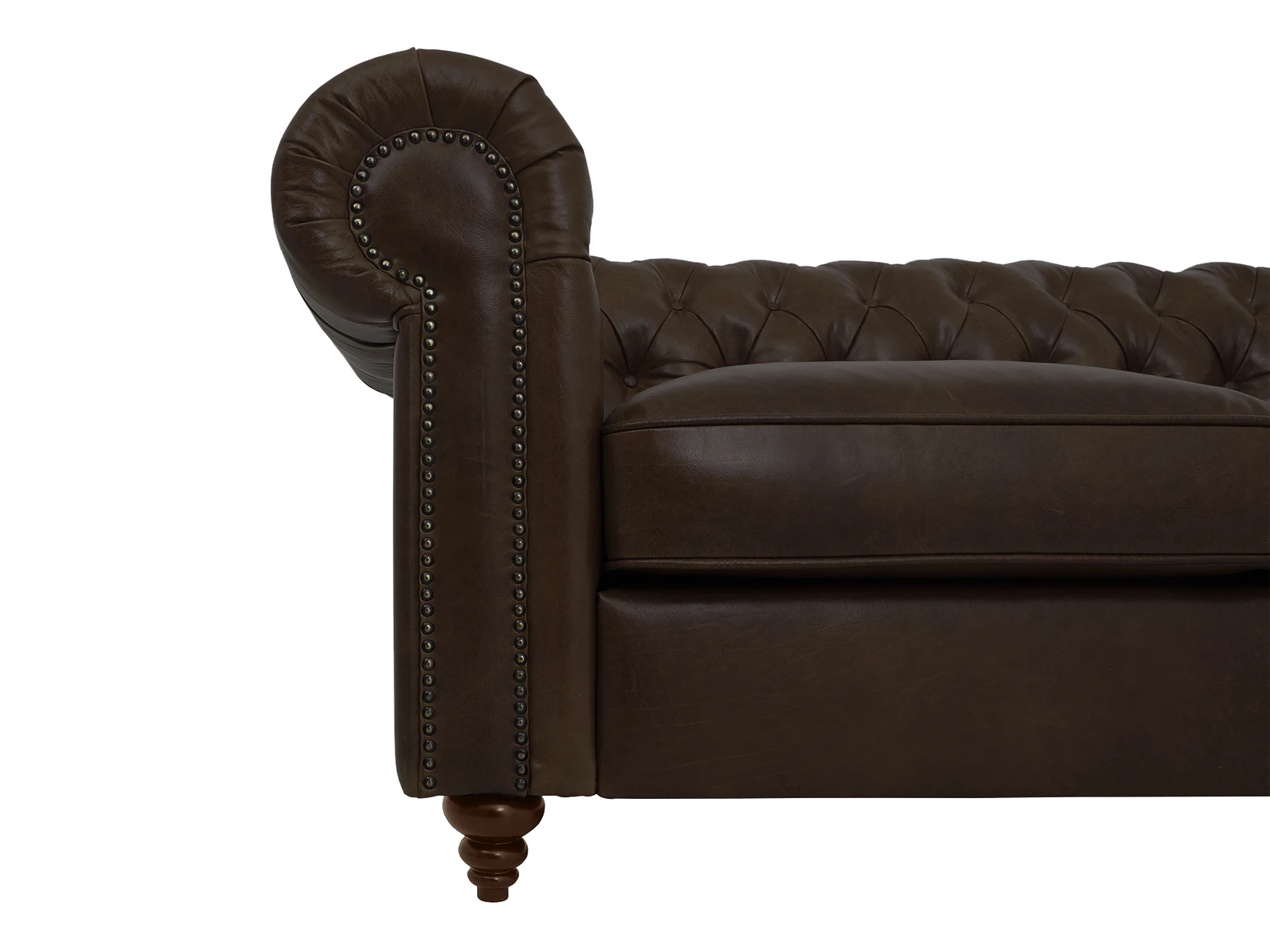 Линейка диванов «Chester Classic» представлена классическими моделями в английском стиле на ножках. Изделие может быть выполнено в натуральной коже или в другой обивке на ваш выбор. Отличительная черта диванов «Chester Classic» — спинка и подлокотники находятся на одном уровне и имеют одинаковую толщину. Благодаря наклону мягкой спинки и независимому пружинному блоку в основании сиденья, «Chester Classic» считается диваном повышенной комфортности. Подлокотники имеют форму свитков. Подобные элементы часто встречаются в архитектуре барокко. Они привносят экспрессию, ощущение королевского стиля. Ножки дивана выполнены из дерева, имеют форму завитка, их цвет может быть коричневым или чёрным — на ваш выбор.||Представленная на фото модель — двухместный диван. Натуральная качественная кожа, используемая для этой модели, имеет роскошную фактуру, не требует специального ухода, «дышит» - воздух и влага проходят сквозь неё, создавая циркуляцию. Долговечна, вызывает приятные тактильные ощущения, а эффект пулл-ап - кожа светлеет в местах натяжения - придаёт винтажный вид . В основании дивана - прочный каркас из бруса хвойных пород, мягкие комфортные подушки. Глубокая каретная стяжка в технике «капитоне» на спинке и подлокотниках. Которые украшены декоративными гвоздиками под состаренную бронзу, придающими изделию выразительный и аутентичный вид. «Chester Classic» - это респектабельность и высокое качество.