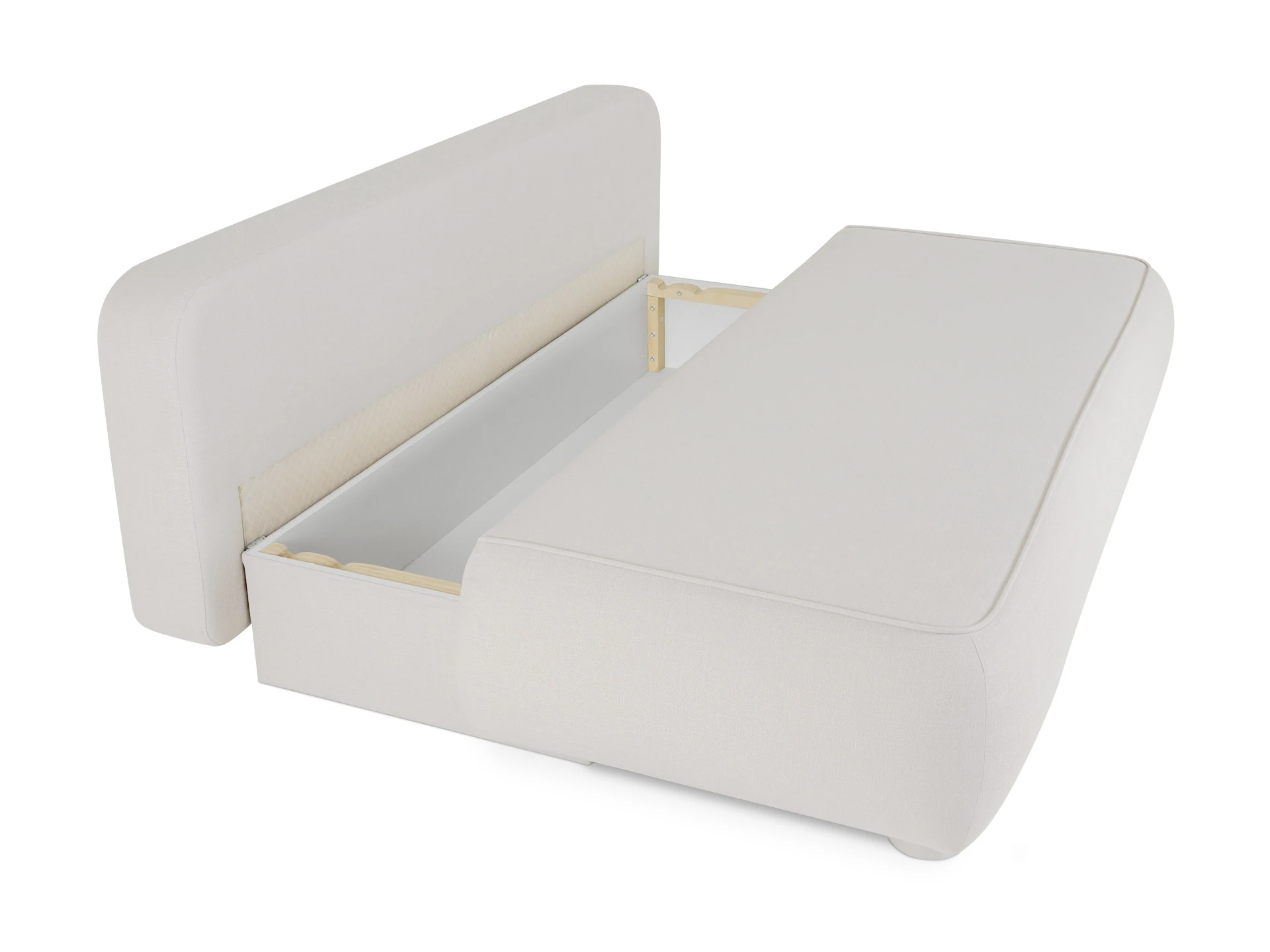 Диван комплектуется двумя спинными подушками в габаритных размерах: 850х500х200 мм. - 2 шт. Наполнитель подушек – синтетическое волокно «синтепух». Облицовочные чехлы дивана не съёмные. Олицовочные чехлы декоративных подушек - съемные на молнии. Внутренние чехлы декоративных подушек несъемные. На основание короба установлены подпятники с фетром на саморезе D 24 мм. Выкатная часть сидения опирается на декоративные, обтянутые тканью цилиндрические опоры h 100 мм., с установленными в них роликами. В диване используется механизм трансформации типа Еврокнижка. При раскладывании диван трансформируется в кровать с размером спального места 2060 х 1530 мм.