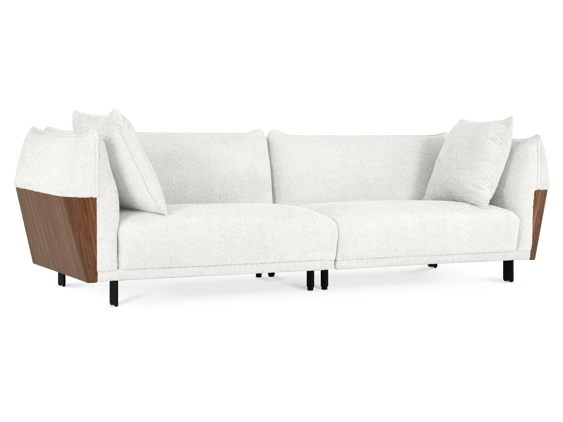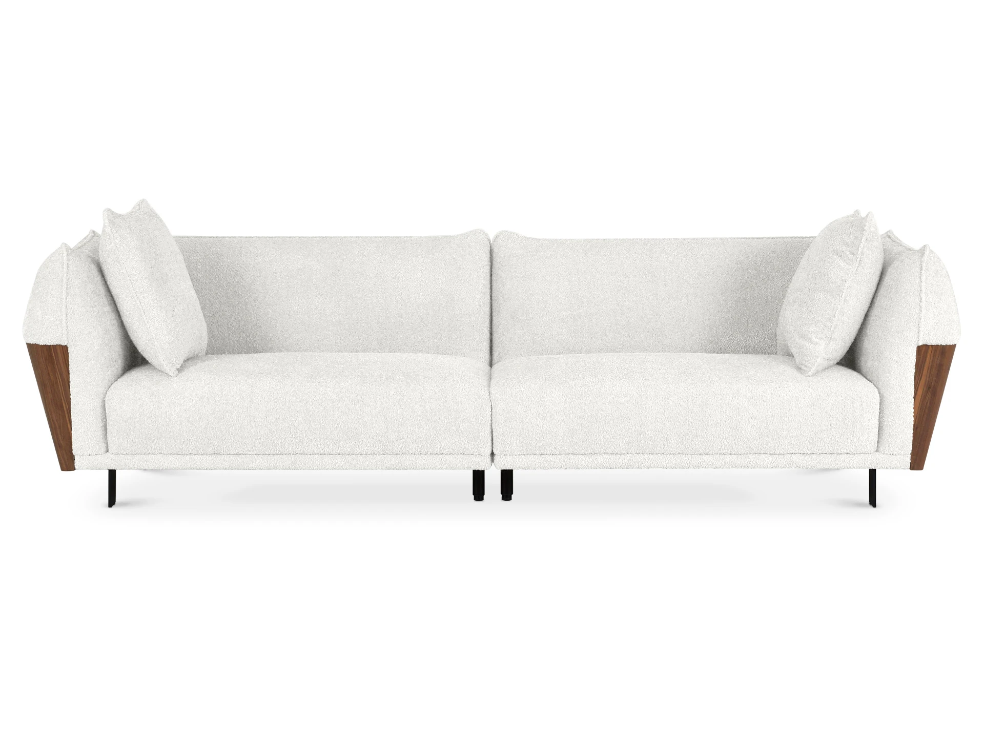 Изящный диван в минималистичном стиле с высокими подлокотниками. Смотрится легко, не перегружает пространство. Металлические ножки придают «парящее» настроение. Подлокотники находятся на одном уровне со спинкой, что создает ощущение уединённости, защиты, камерности. Выглядит компактно, но обрадует просторными и удобными подушками сиденья, спинки. Лаконичная форма позволяет использовать его для любой задачи: в составе мягкой группы в гостиной, для спальни, кабинета, кухни, офиса, бизнес-пространства. Сдержанный и практичный Dongo подойдет для обустройства стильного интерьера, который может быть как спокойным, строгим, так и динамичным, активным. Добавить индивидуальности ему можно при помощи интересного текстиля, декора, света. Диван состоит из двух секций (правой и левой), которые соединяются между собой зацепами типа «крокодил». Сидение дивана состоит из металлических пружин тип «змейка», войлока, настила из нескольких слоев пенополиуретана, холлофайбера. Спинка: резинотканевые ремни, настил из нескольких слоев пенополиуретана, холлофайбер. Наполнение декоративных подушек – синтепух в чехле из спанбонда. Боковые накладки подлокотников – плита МДФ облицованная натуральным шпоном ореха и покрытая прозрачным лаком. Материал обивки - рогожка 3 категории. Лицевой чехол дивана - несъемный. Лицевой чехол декоративных подушек – съемный. В основании дивана – четыре металлические Т-образные опоры матового черного цвета по углам, и четыре цилиндрические регулируемые опоры по центру. На торцы опор установлены пластиковые подпятники.