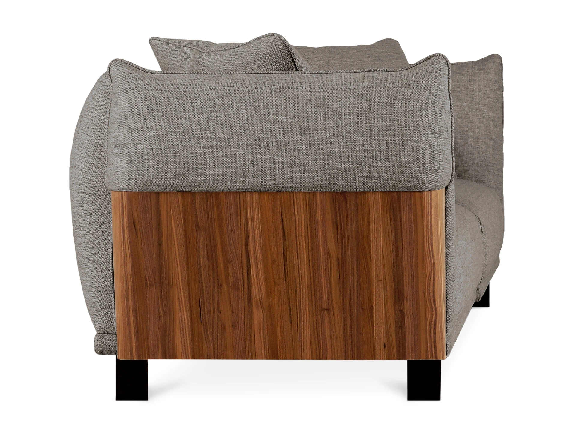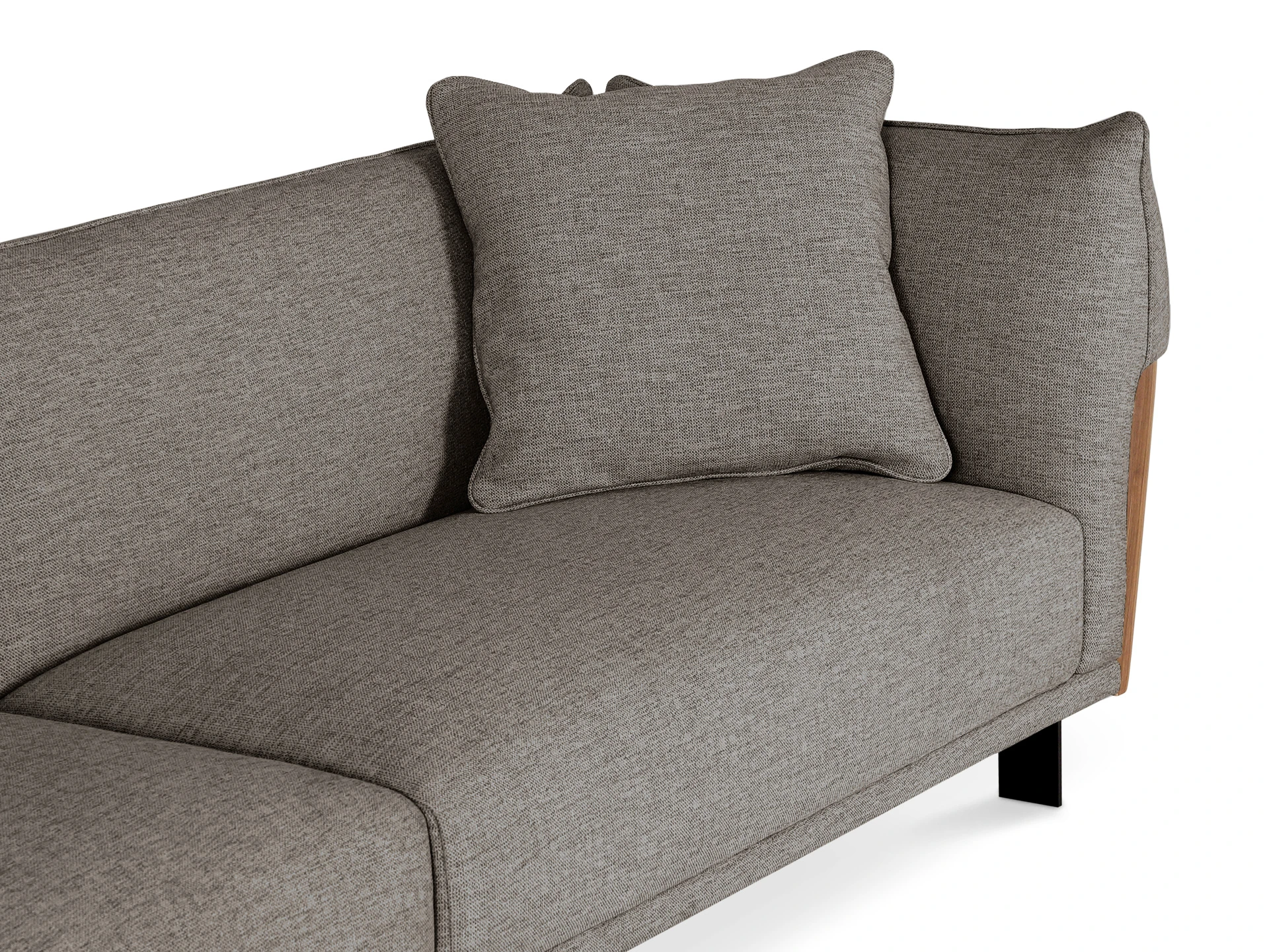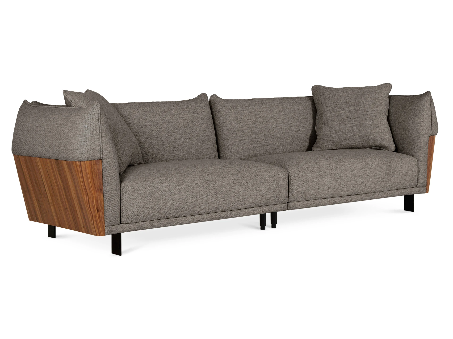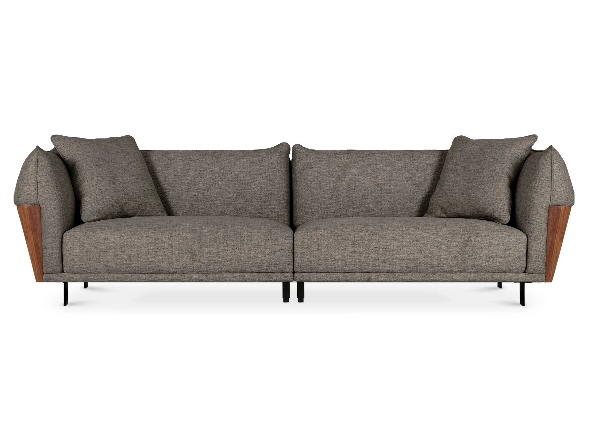 Изящный диван в минималистичном стиле с высокими подлокотниками. Смотрится легко, не перегружает пространство. Металлические ножки придают «парящее» настроение. Подлокотники находятся на одном уровне со спинкой, что создает ощущение уединённости, защиты, камерности. Выглядит компактно, но обрадует просторными и удобными подушками сиденья, спинки. Лаконичная форма позволяет использовать его для любой задачи: в составе мягкой группы в гостиной, для спальни, кабинета, кухни, офиса, бизнес-пространства. Сдержанный и практичный Dongo подойдет для обустройства стильного интерьера, который может быть как спокойным, строгим, так и динамичным, активным. Добавить индивидуальности ему можно при помощи интересного текстиля, декора, света. Диван состоит из двух секций (правой и левой), которые соединяются между собой зацепами типа «крокодил». Сидение дивана состоит из металлических пружин тип «змейка», войлока, настила из нескольких слоев пенополиуретана, холлофайбера. Спинка: резинотканевые ремни, настил из нескольких слоев пенополиуретана, холлофайбер. Наполнение декоративных подушек – синтепух в чехле из спанбонда. Боковые накладки подлокотников – плита МДФ облицованная натуральным шпоном ореха и покрытая прозрачным лаком. Материал обивки - рогожка 3 категории. Лицевой чехол дивана - несъемный. Лицевой чехол декоративных подушек – съемный. В основании дивана – четыре металлические Т-образные опоры матового черного цвета по углам, и четыре цилиндрические регулируемые опоры по центру. На торцы опор установлены пластиковые подпятники.