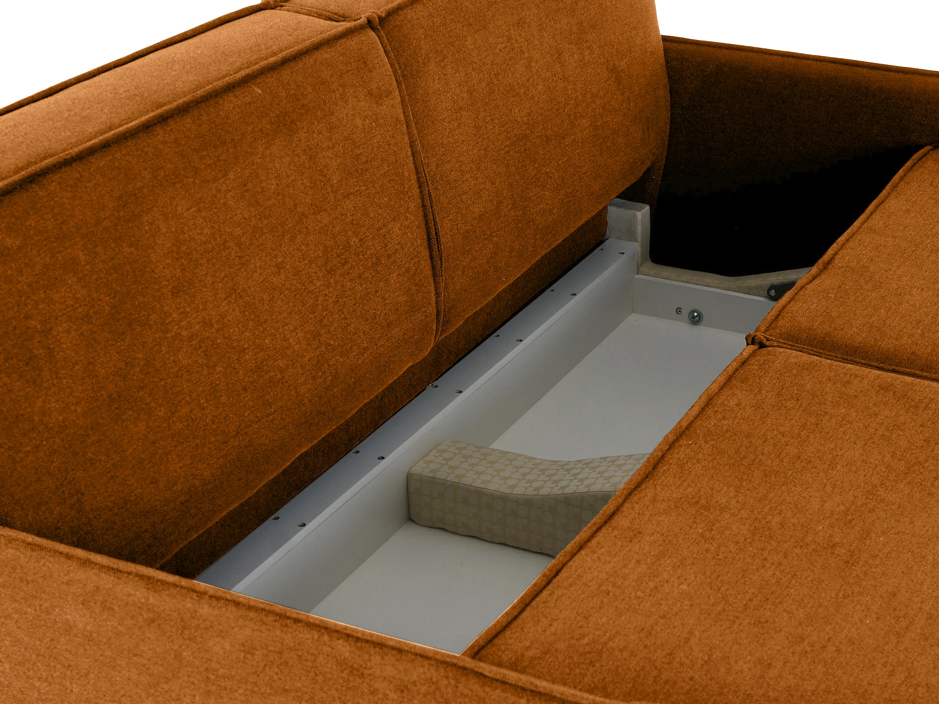 Внутренний короб имеет отделение для хранения белья и установлен на пластиковые опоры диаметром 50 мм. и высотой 30 мм. На основание каркаса также установлены черные пластиковые опоры диаметром 50 мм. и высотой 30 мм. Лицевой чехол дивана - несъемный. Чехлы подушек спинки – съемные. Наполнение подушек – синтепух в чехле из спанбонда. Тип механизма трансформации – «шагающая еврокнижка». Размер спального места - 150x198 см.