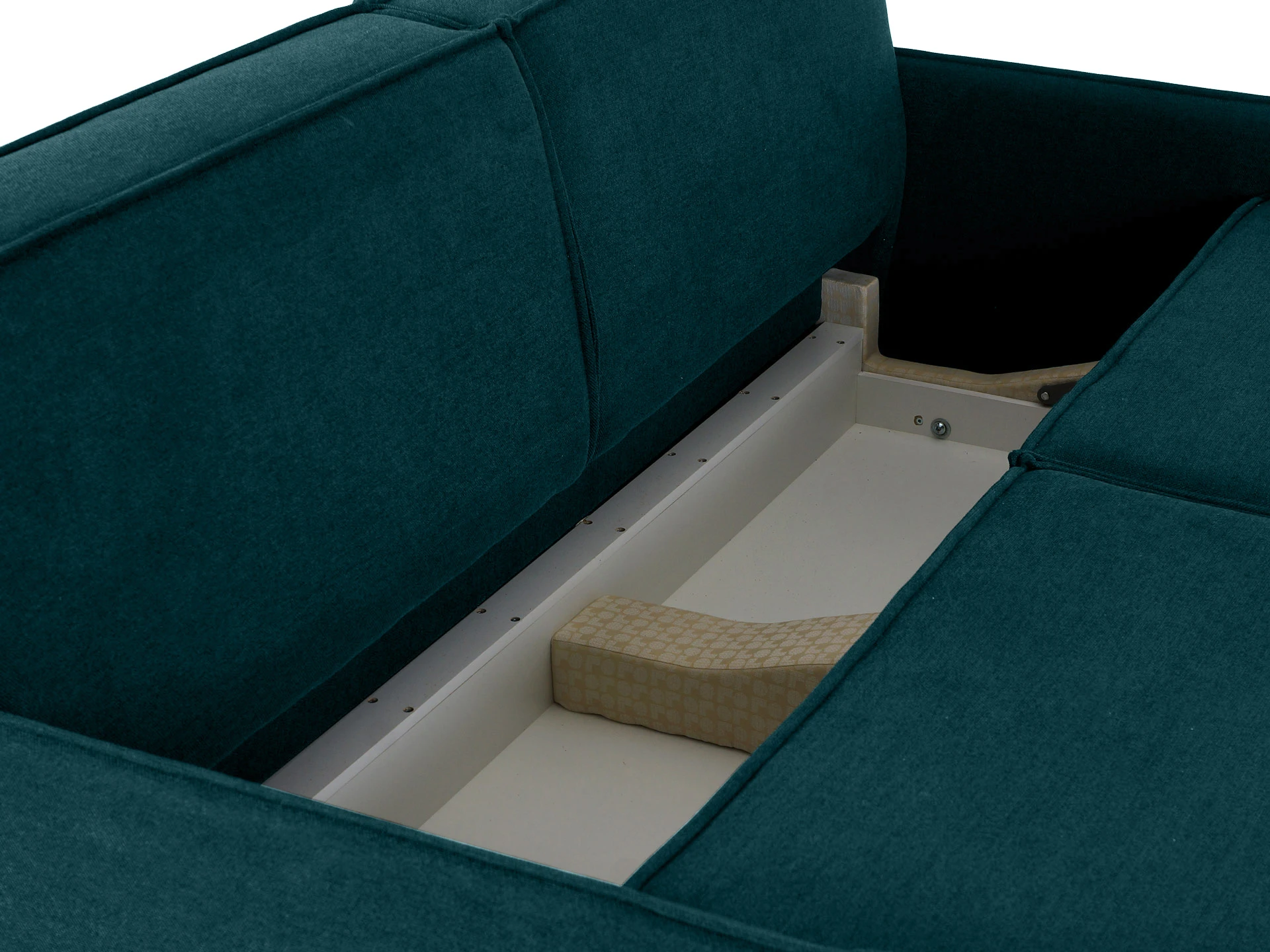 Внутренний короб имеет отделение для хранения белья и установлен на пластиковые опоры диаметром 50 мм. и высотой 30 мм. На основание каркаса также установлены черные пластиковые опоры диаметром 50 мм. и высотой 30 мм. Лицевой чехол дивана - несъемный. Чехлы подушек спинки – съемные. Наполнение подушек – синтепух в чехле из спанбонда. Тип механизма трансформации – «шагающая еврокнижка». Размер спального места - 150x198 см.