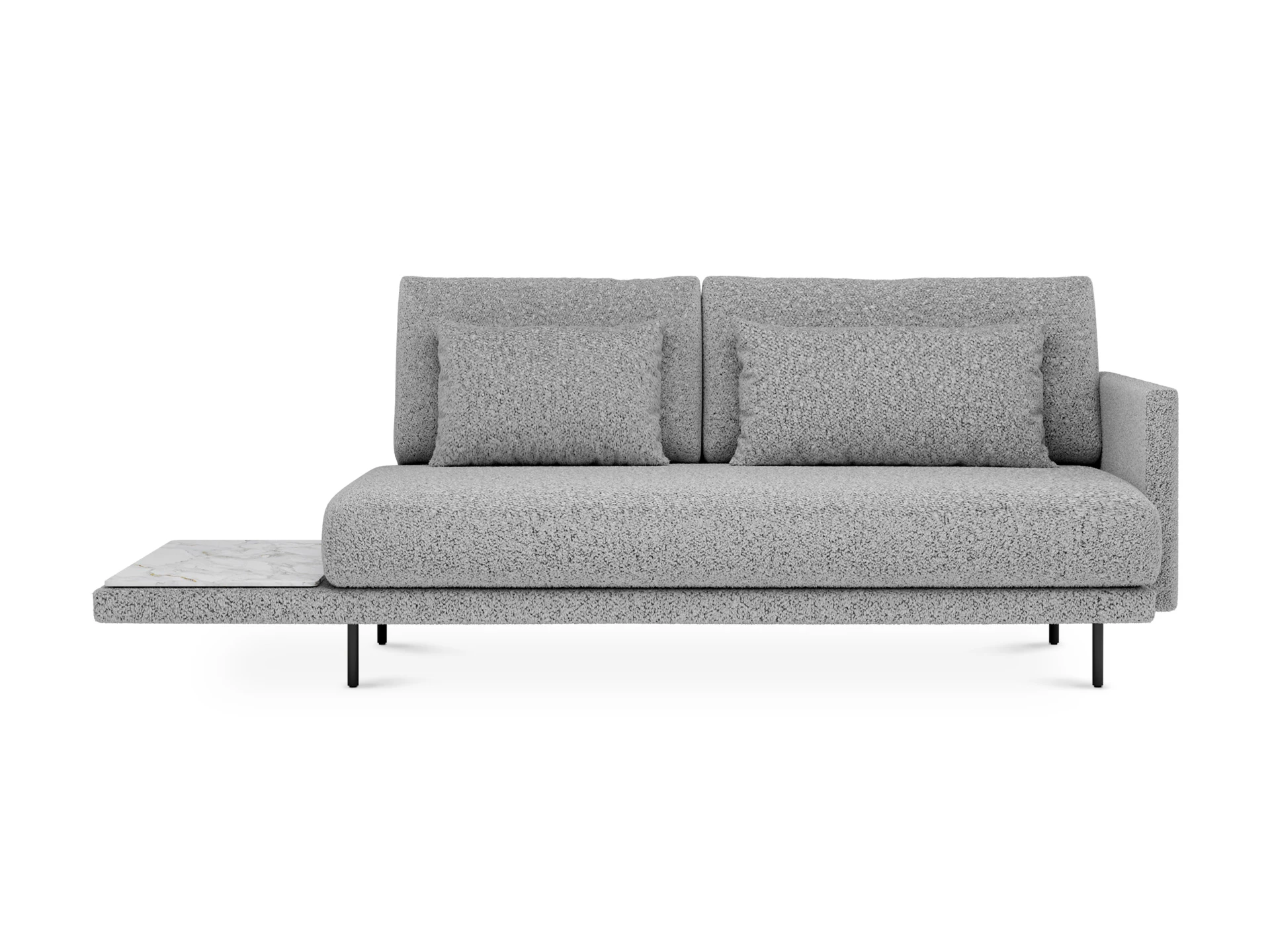 Каркас изделий состоит из деревянных брусков (хвойных пород), соединенных с помощью мебельных скоб и клея, березовой фанеры марки ФК (класс эмиссии формальдегида фанеры - Е1). На рамку каркаса сидения установлен ряд плоских пружин (тип – «змейка»), поверх пружин проложен слой войлока, сверху войлок закрыт лицевым чехлом из ткани с логотипом. Состав подушки сидения: настил из войлока, настил из двух слоев пенополиуретана (поролон марки Memory Foam и супермягкий), холлофайбер. Внутренний чехол выполнен из периотека на текстильной основе. Подушки фиксируются к основанию с помощью контактной ленты. Состав подушки спинки: синтепух в чехле из спанбонда. Лицевой чехол имеет внутренний слой из периотека на текстильной основе. Лицевой чехол подушек сидения и спинки – съемный. Лицевой чехол каркаса - несъемный, крепится к каркасу при помощи мебельных скоб. В основании изделий – металлические опоры высотой 160 мм, с пластиковыми подпятниками, окрашены черной матовой эмалью. Столешница изготовлена из полированного натурального камня (мрамор), толщиной 20мм. Подушки входят в стоимость.