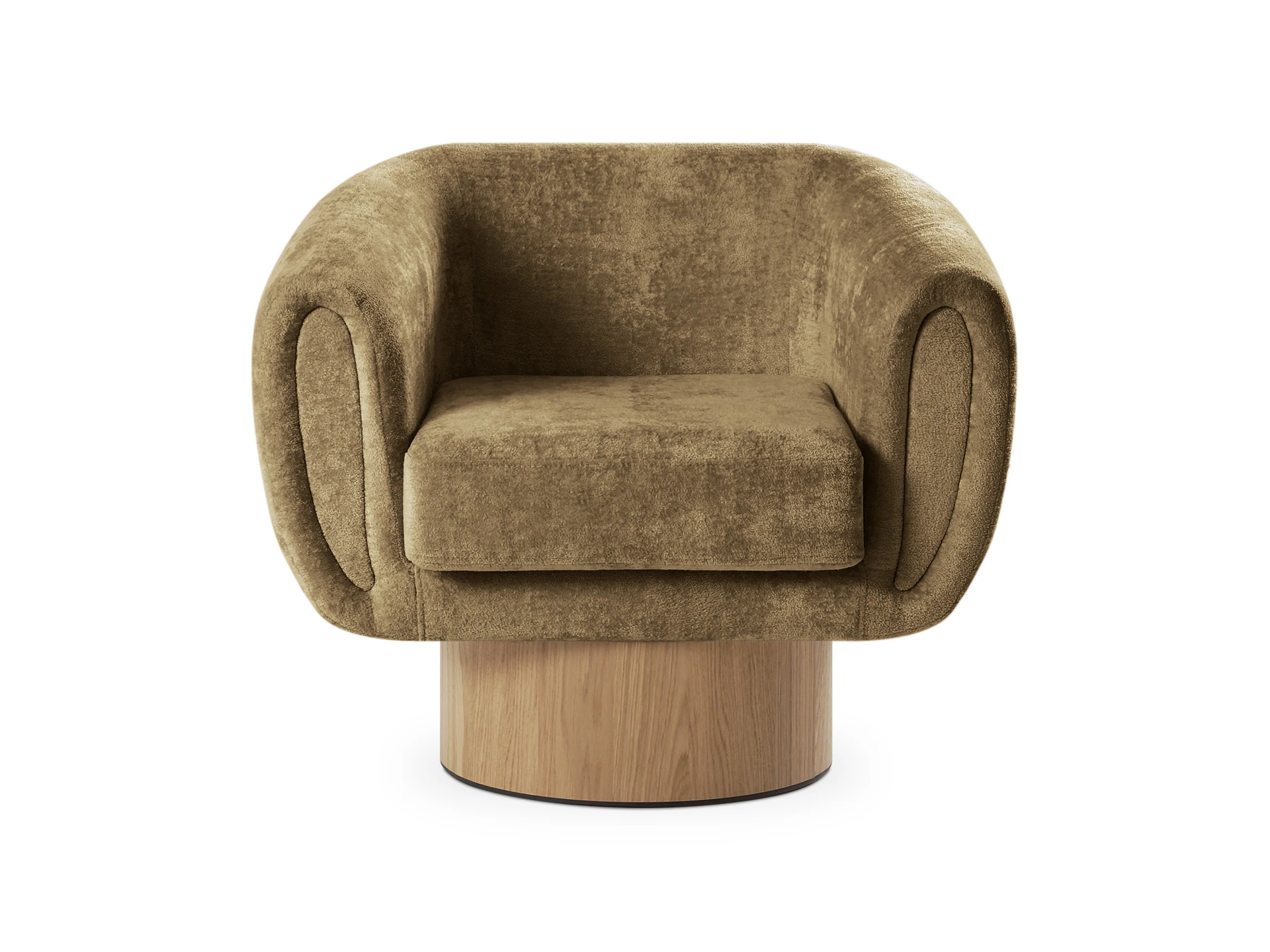 Кресло Guest с анатомическим объемным силуэтом и высокой спинкой обеспечивает эргономичную поддержку. Модель отличается скульптурной геометрией: цилиндрическое основание, квадратное сиденье и полукруглая спинка. Конструктив и материалы: • Каркас и основание: Цилиндрическое основание доступно в двух исполнениях: облицовка тканью или шпоном (дуб натуральный, дуб черный, орех). На нижней поверхности установлены войлочные подпятники. • Механизм:Доступна версия с вращением 360° (поворотная платформа с максимальной нагрузкой до 120 кг) и стационарная. Вращается блок «сиденье-спинка», основание неподвижно. • Наполнение:Многослойный ППУ повышенной мягкости. • Обивка:Чехол (несъемный на спинке/корпусе, съемный на подушке сиденья, фиксация — молния). Функциональность: Кресло адаптировано для жилых и общественных пространств (отели, бизнес-зоны). Поворотный механизм обеспечивает мобильность в компактных помещениях, позволяя легко менять положение относительно стола, окна или собеседника.