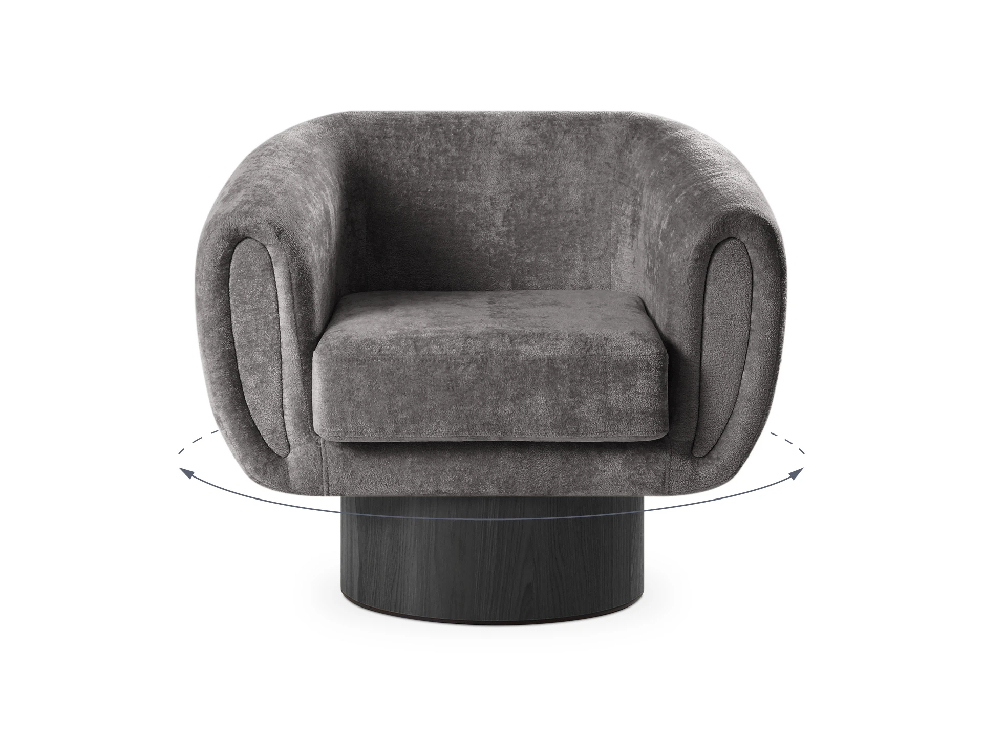 Кресло Guest с анатомическим объемным силуэтом и высокой спинкой обеспечивает эргономичную поддержку. Модель отличается скульптурной геометрией: цилиндрическое основание, квадратное сиденье и полукруглая спинка. Конструктив и материалы: • Каркас и основание: Цилиндрическое основание доступно в двух исполнениях: облицовка тканью или шпоном (дуб натуральный, дуб черный, орех). На нижней поверхности установлены войлочные подпятники. • Механизм:Доступна версия с вращением 360° (поворотная платформа с максимальной нагрузкой до 120 кг) и стационарная. Вращается блок «сиденье-спинка», основание неподвижно. • Наполнение:Многослойный ППУ повышенной мягкости. • Обивка:Чехол (несъемный на спинке/корпусе, съемный на подушке сиденья, фиксация — молния). Функциональность: Кресло адаптировано для жилых и общественных пространств (отели, бизнес-зоны). Поворотный механизм обеспечивает мобильность в компактных помещениях, позволяя легко менять положение относительно стола, окна или собеседника.