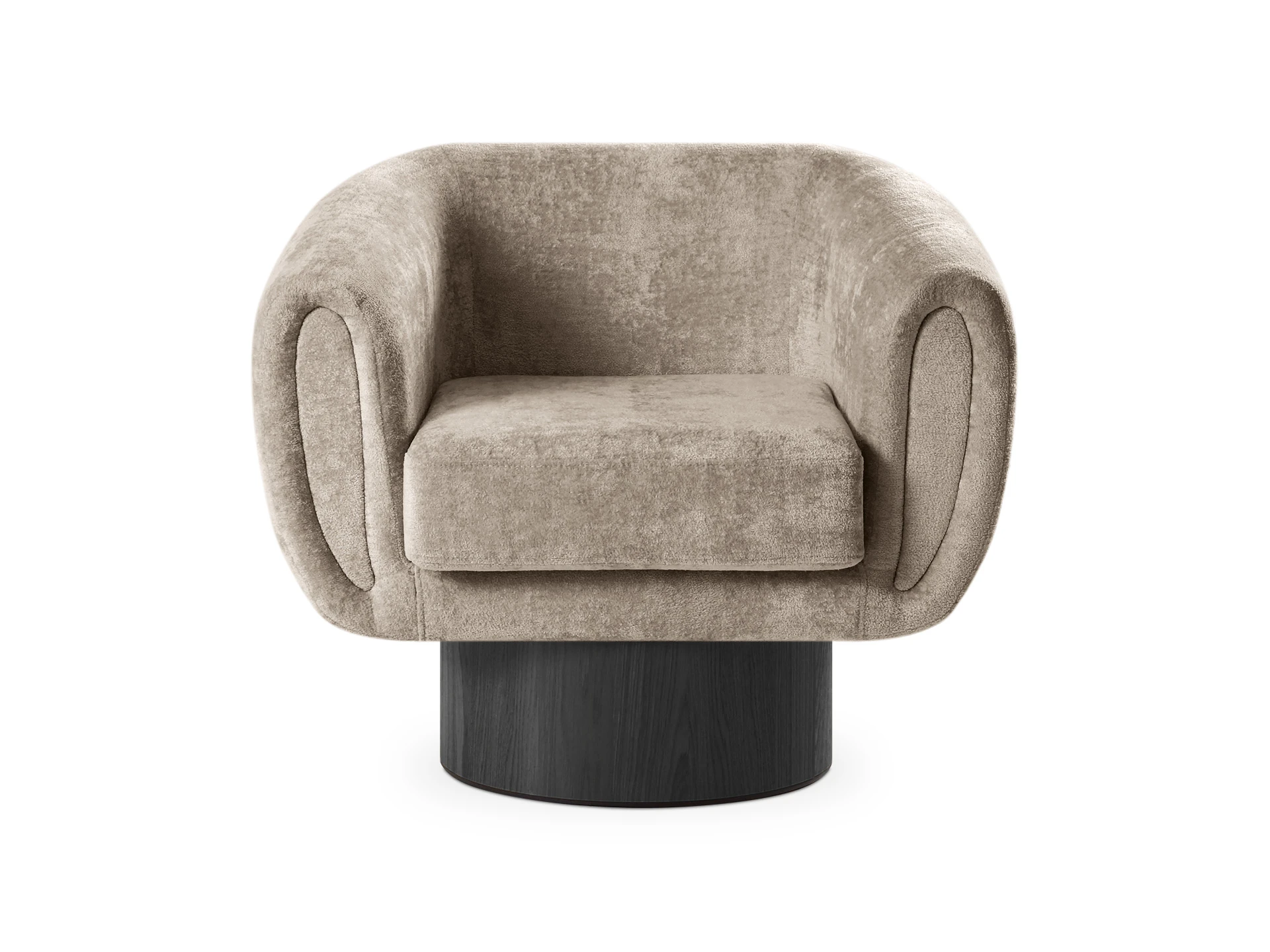 Кресло Guest с анатомическим объемным силуэтом и высокой спинкой обеспечивает эргономичную поддержку. Модель отличается скульптурной геометрией: цилиндрическое основание, квадратное сиденье и полукруглая спинка. Конструктив и материалы: • Каркас и основание: Цилиндрическое основание доступно в двух исполнениях: облицовка тканью или шпоном (дуб натуральный, дуб черный, орех). На нижней поверхности установлены войлочные подпятники. • Механизм:Доступна версия с вращением 360° (поворотная платформа с максимальной нагрузкой до 120 кг) и стационарная. Вращается блок «сиденье-спинка», основание неподвижно. • Наполнение:Многослойный ППУ повышенной мягкости. • Обивка:Чехол (несъемный на спинке/корпусе, съемный на подушке сиденья, фиксация — молния). Функциональность: Кресло адаптировано для жилых и общественных пространств (отели, бизнес-зоны). Поворотный механизм обеспечивает мобильность в компактных помещениях, позволяя легко менять положение относительно стола, окна или собеседника.
