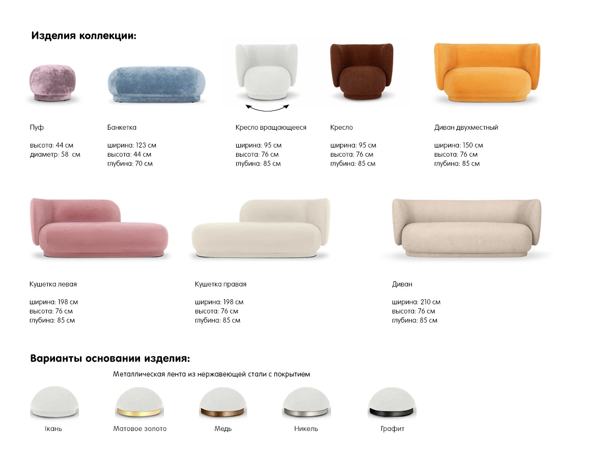Коллекция диванов, кресел, кушеток, пуфов, дизайн которых сфокусирован на округлых мягких формах. Это и дань актуальным трендам, и стремление к позитивному «обволакивающему» пространству, располагающему к уютному отдыху. Смелые объемы, плавные линии привнесут в интерьер динамику, свежесть, пластичность. Закругленные элементы, фактурные обивки, естественные оттенки создают атмосферу комфорта и дружелюбного притяжения. Высокие спинки, плавно перетекающие в подлокотники, обеспечивают эргономичную поддержку и чувство безопасности, уединения. Эти великолепные модели подарят теплые тактильные ощущения. С помощью Lucca можно стильно оформить как домашнюю гостиную, спальню, детскую, так и креативное пространство, творческую студию, галерею, салон, лаундж-зону, бутик. Настоящее олицетворение гедонизма, красоты и элегантности. Предметы из коллекции гармонично комбинируются между собой, а также хорошо дружат с другими элементами разных стилистических направлений. Лицевой чехол изделия - несъемный. В качестве механизма вращения используется металлическая поворотная площадка размером 245х245мм. В основании изделия - металлическая лента из нержавеющей стали с разными цветами покрытий: матовое золото, медь, графит, никель. Опоры – пластиковые подпятники с фетровыми накладками.