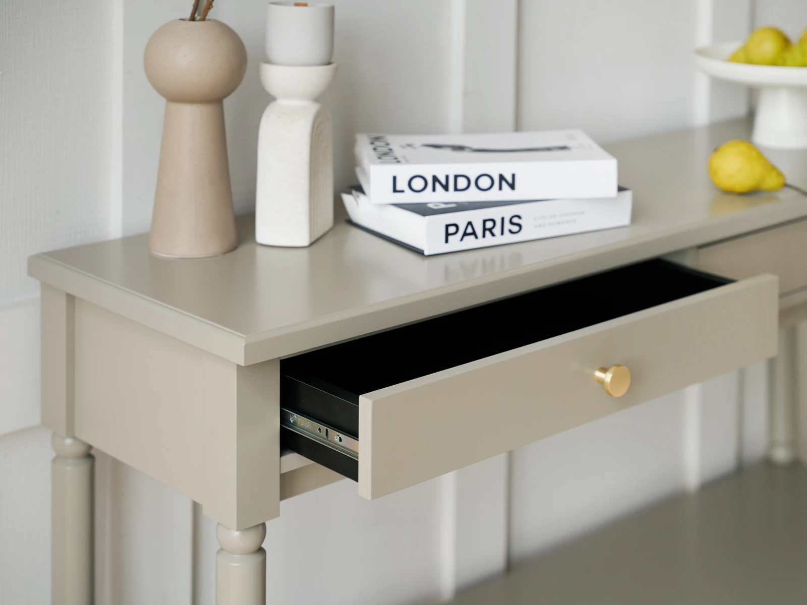 Коллекция Music — респектабельная мебель с классической основой. Обладает притягательной энергетикой изящных форм, поэтичного черного цвета и безупречным исполнением. Комоды, тумбы, банкетки, консольные и журнальные столики подходят для оформления гостиной, спальни, прихожей, мастерской, студии, бьюти-зоны. Идеально вписывается в стилистику неоклассики, арт-деко, минимализма, эклектики. Лейтмотив коллекции — барочные элементы: фигурные ножки из массива дерева, каретная стяжка «капитоне», акцентные детали в бронзовом и золотистом цвете. Изделия подчеркнут в интерьере смелость, выразительность, спокойствие. Они надежно сохранят ваши секреты, помогут разложить вещи по местам и поддержат настроение «тихой роскоши». Могут выступать на контрасте с главенствующим светлым оттенком или быть частью ненавязчивого темного фона. Приставной стол с 2-мя выдвижными ящиками. Ручки включены в стоимость.