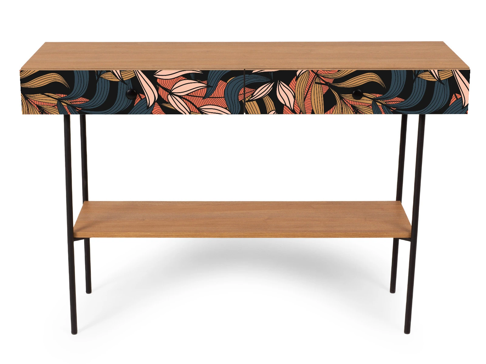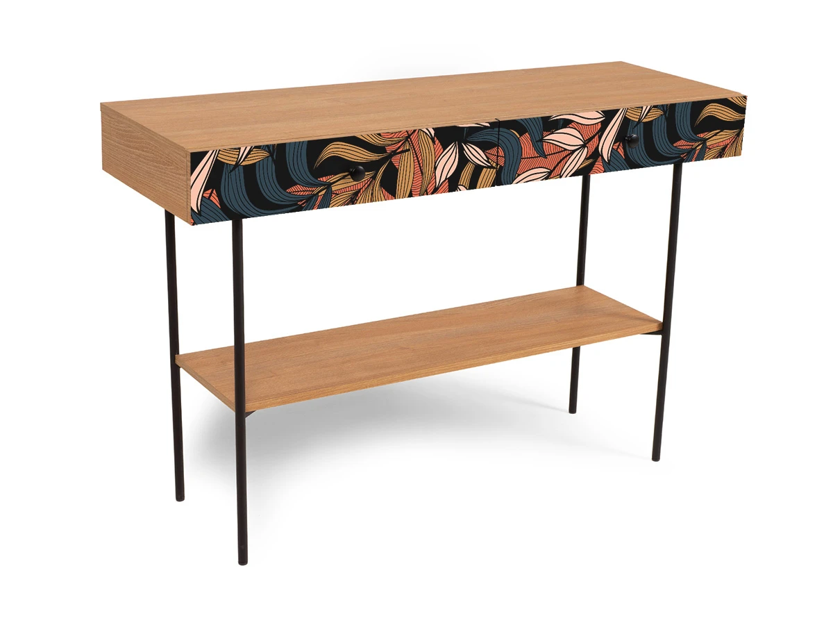 Корпусная мебель, с которой можно составить множество решений для гостиной, детской, кухни, спальни, прихожей, рабочей зоны. Комоды, шкафы, тумбы, столы, витрины, полки, серванты характеризуются универсальностью, многозадачностью, надёжными устойчивыми конструкциями. Имеют выразительный внешний вид, вдохновленный направлением ретро. Смотрятся легко и воздушно за счет деревянных ножек, минимального количества декоративных элементов, спокойных природных оттенков. Их можно использовать в качестве систем хранения, элементов для зонирования, фокусных точек. В дизайне ярко выражена доминанта прямых форм, графичности, лаконичных линий и элегантного исполнения. Что даёт пространству ощущение размеренности, сбалансированности, упорядоченности. Подходят интерьерам как с нейтральной базой, так и локациям с интенсивными цветовыми блоками. Индивидуальности добавят модели с оригинальными паттернами на фасадах. Предметы коллекции Frida гармонично впишутся в эклектичные и стилизованные интерьеры. Стол консольный установлен на высокое металлическое основание окрашенное черной эмалью из круглой трубы d 20 мм. и высотой 674 мм, с пластиковыми подпятниками. В столе два ящика на скрытых направляющих. В нижней части основания установлена полка. Соединительная фурнитура – Hettich. Материалы корпуса и фасада – ЛДСтП толщиной 16 мм.. Стол консольный рекомендуется крепить к стене для защиты от опрокидывания (крепежи входят в комплект). Высота опор 160 мм. Изображение, нанесенное на фасады, устойчиво к выцветанию, истиранию и влаге. Однако длительное воздействие воды, различных растворителей, спиртосодержащих жидкостей и высоких температур, увеличивают риск повреждения целостности покрытия. Поэтому при использовании необходимо соблюдать ряд правил: 1. Протирайте поверхность с рисунком влажной (но не мокрой) тканью. 2. Используйте мягкие ткани, например, салфетки для стекла или зеркал. 3. Не используйте для обработки поверхности с нанесенным на нее рисунком чистящие порошки и средства, в состав которых входят ацетон, растворитель или спирт. 4. Не используйте металлические губки и щетки с жесткой щетиной. 5. Избегайте ударов, падения, царапания, трения изделий с фотопечатью.