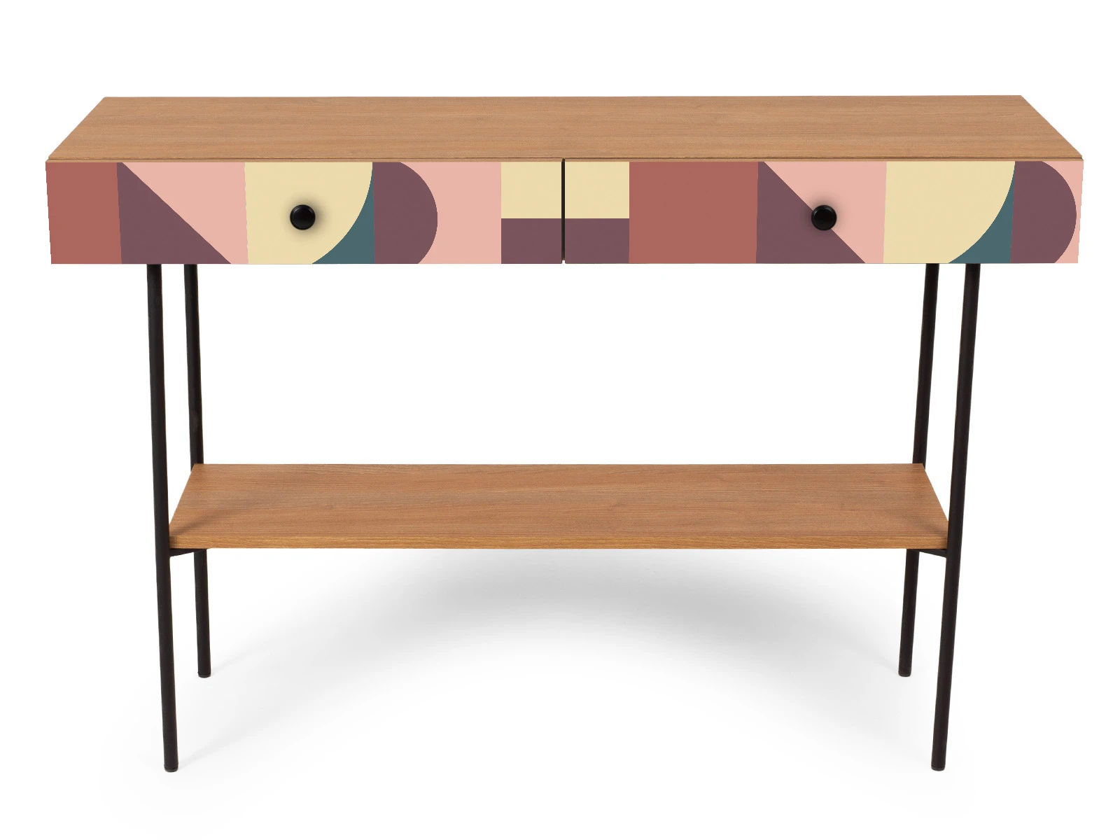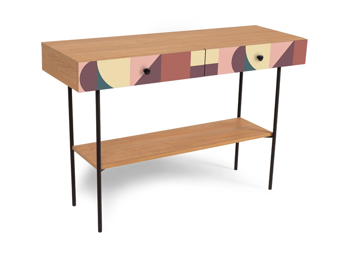 Корпусная мебель, с которой можно составить множество решений для гостиной, детской, кухни, спальни, прихожей, рабочей зоны. Комоды, шкафы, тумбы, столы, витрины, полки, серванты характеризуются универсальностью, многозадачностью, надёжными устойчивыми конструкциями. Имеют выразительный внешний вид, вдохновленный направлением ретро. Смотрятся легко и воздушно за счет деревянных ножек, минимального количества декоративных элементов, спокойных природных оттенков. Их можно использовать в качестве систем хранения, элементов для зонирования, фокусных точек. В дизайне ярко выражена доминанта прямых форм, графичности, лаконичных линий и элегантного исполнения. Что даёт пространству ощущение размеренности, сбалансированности, упорядоченности. Подходят интерьерам как с нейтральной базой, так и локациям с интенсивными цветовыми блоками. Индивидуальности добавят модели с оригинальными паттернами на фасадах. Предметы коллекции Frida гармонично впишутся в эклектичные и стилизованные интерьеры. Стол консольный установлен на высокое металлическое основание окрашенное черной эмалью из круглой трубы d 20 мм. и высотой 674 мм, с пластиковыми подпятниками. В столе два ящика на скрытых направляющих. В нижней части основания установлена полка. Соединительная фурнитура – Hettich. Материалы корпуса и фасада – ЛДСтП толщиной 16 мм.. Стол консольный рекомендуется крепить к стене для защиты от опрокидывания (крепежи входят в комплект). Высота опор 160 мм. Изображение, нанесенное на фасады, устойчиво к выцветанию, истиранию и влаге. Однако длительное воздействие воды, различных растворителей, спиртосодержащих жидкостей и высоких температур, увеличивают риск повреждения целостности покрытия. Поэтому при использовании необходимо соблюдать ряд правил: 1. Протирайте поверхность с рисунком влажной (но не мокрой) тканью. 2. Используйте мягкие ткани, например, салфетки для стекла или зеркал. 3. Не используйте для обработки поверхности с нанесенным на нее рисунком чистящие порошки и средства, в состав которых входят ацетон, растворитель или спирт. 4. Не используйте металлические губки и щетки с жесткой щетиной. 5. Избегайте ударов, падения, царапания, трения изделий с фотопечатью.