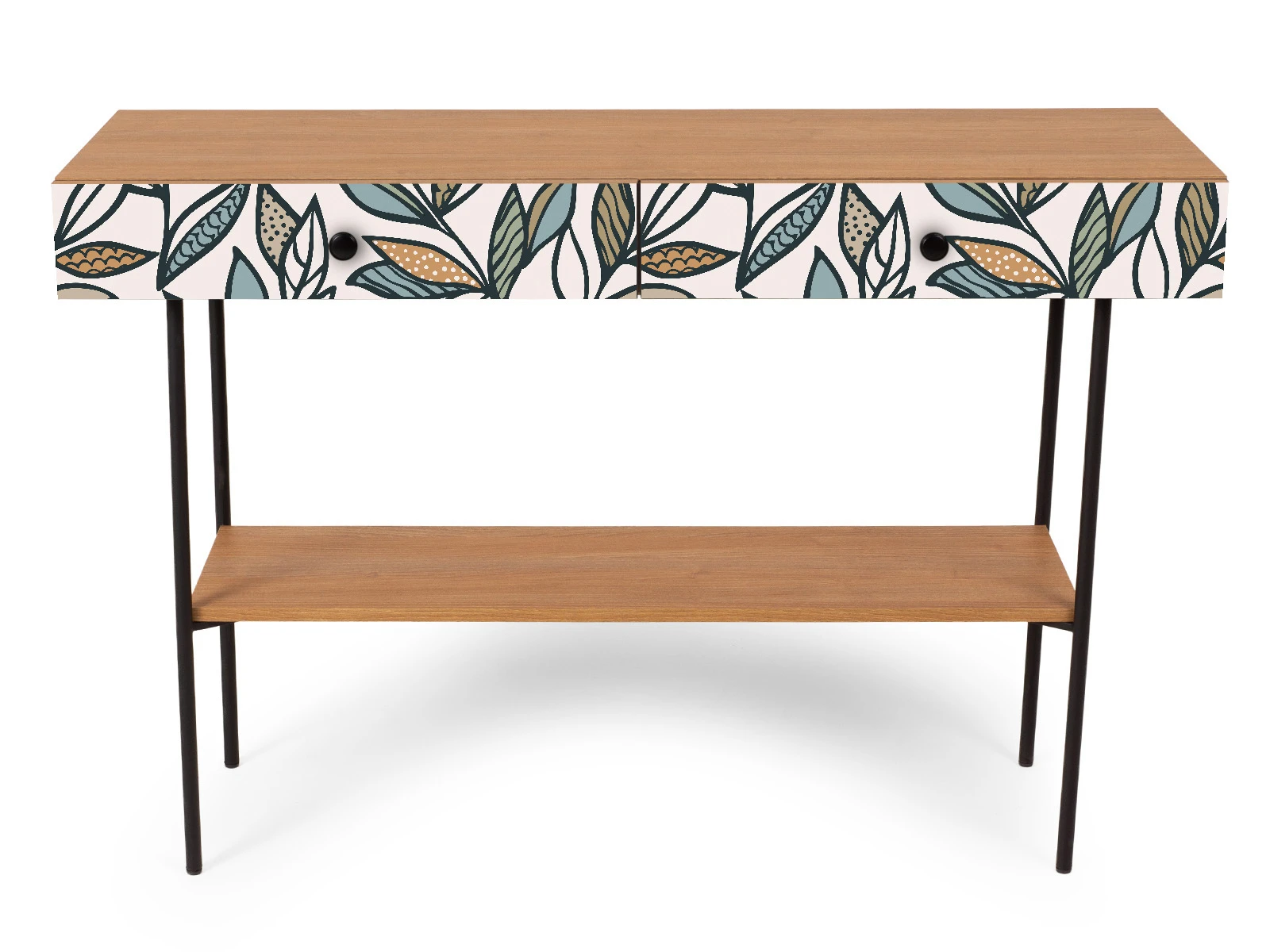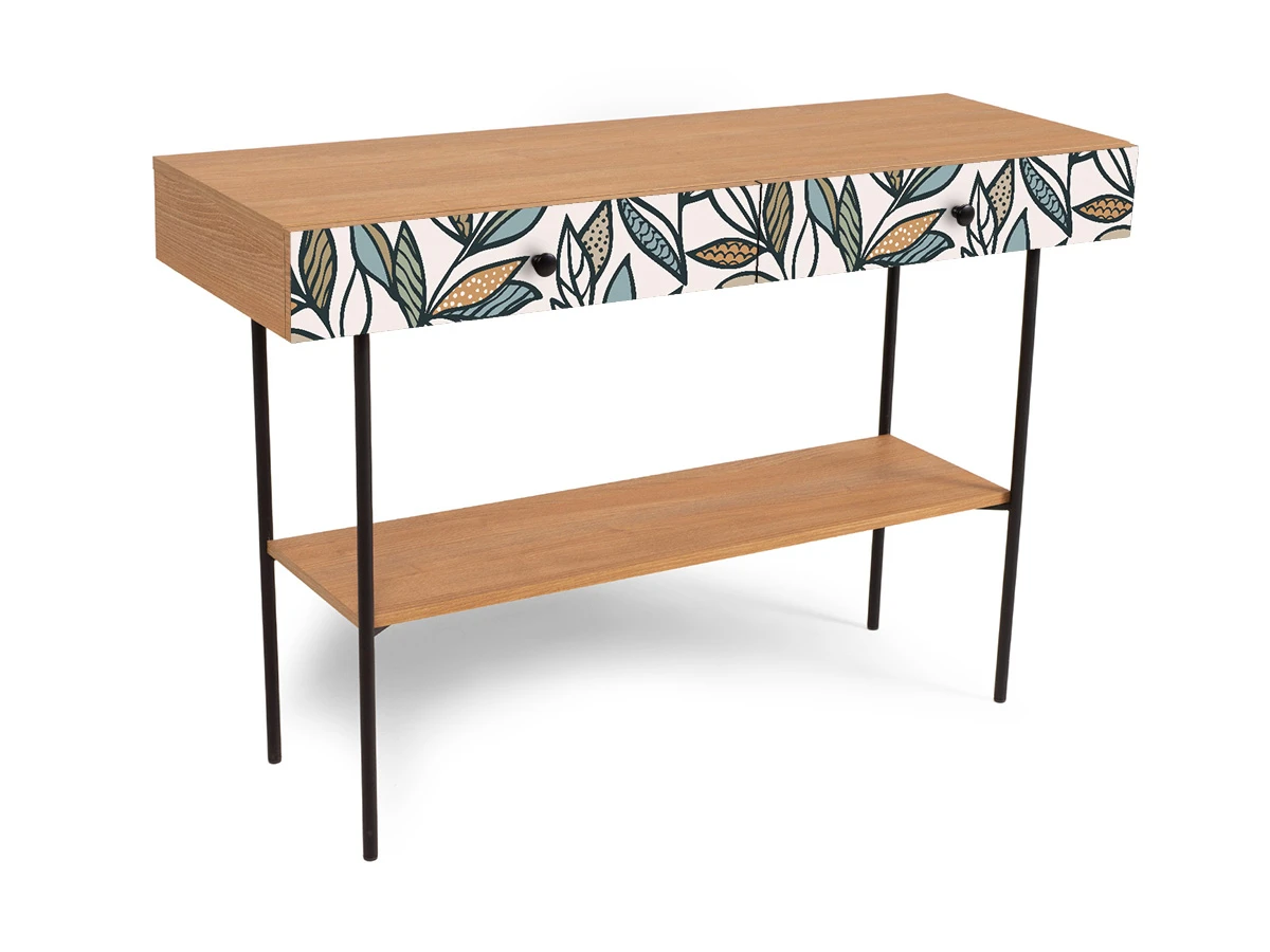 Корпусная мебель, с которой можно составить множество решений для гостиной, детской, кухни, спальни, прихожей, рабочей зоны. Комоды, шкафы, тумбы, столы, витрины, полки, серванты характеризуются универсальностью, многозадачностью, надёжными устойчивыми конструкциями. Имеют выразительный внешний вид, вдохновленный направлением ретро. Смотрятся легко и воздушно за счет деревянных ножек, минимального количества декоративных элементов, спокойных природных оттенков. Их можно использовать в качестве систем хранения, элементов для зонирования, фокусных точек. В дизайне ярко выражена доминанта прямых форм, графичности, лаконичных линий и элегантного исполнения. Что даёт пространству ощущение размеренности, сбалансированности, упорядоченности. Подходят интерьерам как с нейтральной базой, так и локациям с интенсивными цветовыми блоками. Индивидуальности добавят модели с оригинальными паттернами на фасадах. Предметы коллекции Frida гармонично впишутся в эклектичные и стилизованные интерьеры. Стол консольный установлен на высокое металлическое основание окрашенное черной эмалью из круглой трубы d 20 мм. и высотой 674 мм, с пластиковыми подпятниками. В столе два ящика на скрытых направляющих. В нижней части основания установлена полка. Соединительная фурнитура – Hettich. Материалы корпуса и фасада – ЛДСтП толщиной 16 мм.. Стол консольный рекомендуется крепить к стене для защиты от опрокидывания (крепежи входят в комплект). Высота опор 160 мм. Изображение, нанесенное на фасады, устойчиво к выцветанию, истиранию и влаге. Однако длительное воздействие воды, различных растворителей, спиртосодержащих жидкостей и высоких температур, увеличивают риск повреждения целостности покрытия. Поэтому при использовании необходимо соблюдать ряд правил: 1. Протирайте поверхность с рисунком влажной (но не мокрой) тканью. 2. Используйте мягкие ткани, например, салфетки для стекла или зеркал. 3. Не используйте для обработки поверхности с нанесенным на нее рисунком чистящие порошки и средства, в состав которых входят ацетон, растворитель или спирт. 4. Не используйте металлические губки и щетки с жесткой щетиной. 5. Избегайте ударов, падения, царапания, трения изделий с фотопечатью.
