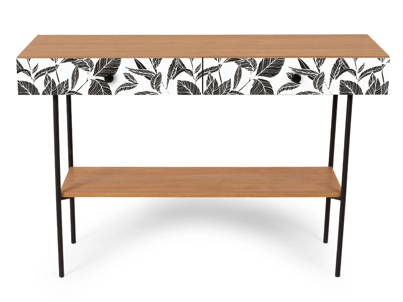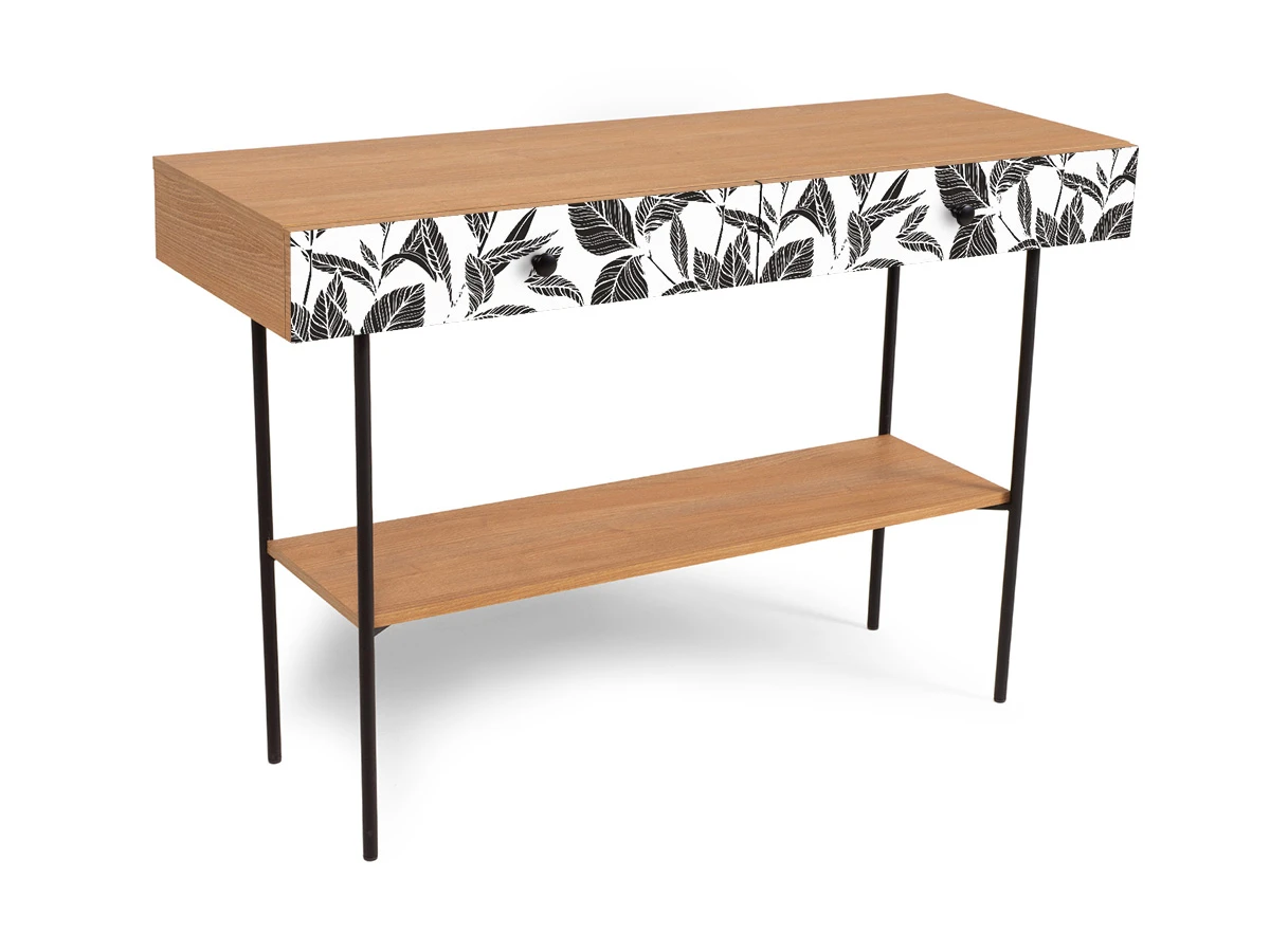 Корпусная мебель, с которой можно составить множество решений для гостиной, детской, кухни, спальни, прихожей, рабочей зоны. Комоды, шкафы, тумбы, столы, витрины, полки, серванты характеризуются универсальностью, многозадачностью, надёжными устойчивыми конструкциями. Имеют выразительный внешний вид, вдохновленный направлением ретро. Смотрятся легко и воздушно за счет деревянных ножек, минимального количества декоративных элементов, спокойных природных оттенков. Их можно использовать в качестве систем хранения, элементов для зонирования, фокусных точек. В дизайне ярко выражена доминанта прямых форм, графичности, лаконичных линий и элегантного исполнения. Что даёт пространству ощущение размеренности, сбалансированности, упорядоченности. Подходят интерьерам как с нейтральной базой, так и локациям с интенсивными цветовыми блоками. Индивидуальности добавят модели с оригинальными паттернами на фасадах. Предметы коллекции Frida гармонично впишутся в эклектичные и стилизованные интерьеры. Стол консольный установлен на высокое металлическое основание окрашенное черной эмалью из круглой трубы d 20 мм. и высотой 674 мм, с пластиковыми подпятниками. В столе два ящика на скрытых направляющих. В нижней части основания установлена полка. Соединительная фурнитура – Hettich. Материалы корпуса и фасада – ЛДСтП толщиной 16 мм.. Стол консольный рекомендуется крепить к стене для защиты от опрокидывания (крепежи входят в комплект). Высота опор 160 мм. Изображение, нанесенное на фасады, устойчиво к выцветанию, истиранию и влаге. Однако длительное воздействие воды, различных растворителей, спиртосодержащих жидкостей и высоких температур, увеличивают риск повреждения целостности покрытия. Поэтому при использовании необходимо соблюдать ряд правил: 1. Протирайте поверхность с рисунком влажной (но не мокрой) тканью. 2. Используйте мягкие ткани, например, салфетки для стекла или зеркал. 3. Не используйте для обработки поверхности с нанесенным на нее рисунком чистящие порошки и средства, в состав которых входят ацетон, растворитель или спирт. 4. Не используйте металлические губки и щетки с жесткой щетиной. 5. Избегайте ударов, падения, царапания, трения изделий с фотопечатью.