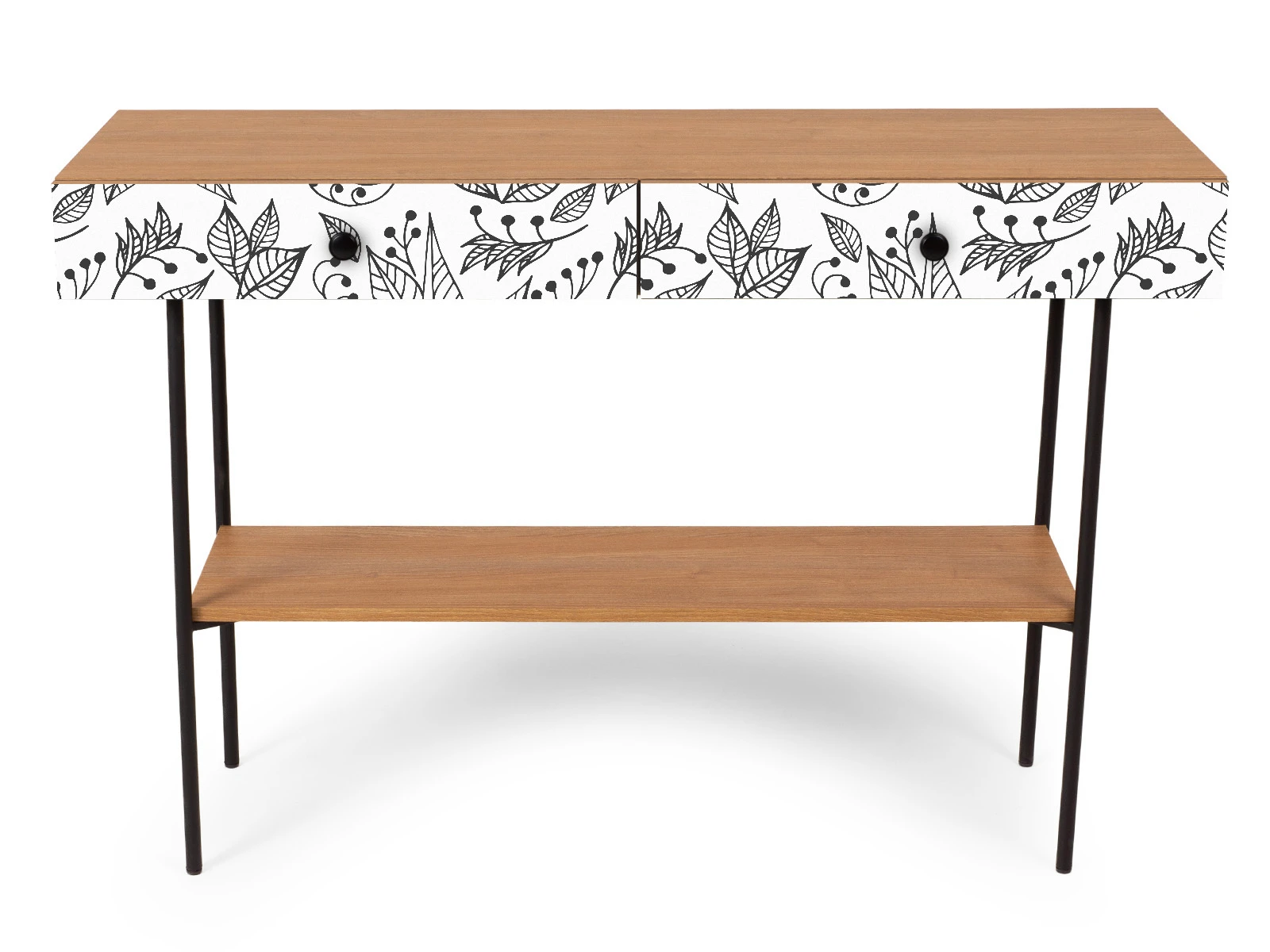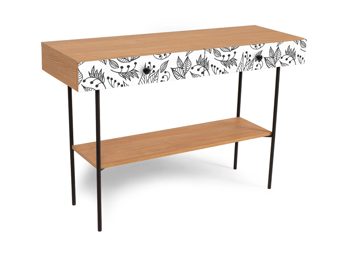 Корпусная мебель, с которой можно составить множество решений для гостиной, детской, кухни, спальни, прихожей, рабочей зоны. Комоды, шкафы, тумбы, столы, витрины, полки, серванты характеризуются универсальностью, многозадачностью, надёжными устойчивыми конструкциями. Имеют выразительный внешний вид, вдохновленный направлением ретро. Смотрятся легко и воздушно за счет деревянных ножек, минимального количества декоративных элементов, спокойных природных оттенков. Их можно использовать в качестве систем хранения, элементов для зонирования, фокусных точек. В дизайне ярко выражена доминанта прямых форм, графичности, лаконичных линий и элегантного исполнения. Что даёт пространству ощущение размеренности, сбалансированности, упорядоченности. Подходят интерьерам как с нейтральной базой, так и локациям с интенсивными цветовыми блоками. Индивидуальности добавят модели с оригинальными паттернами на фасадах. Предметы коллекции Frida гармонично впишутся в эклектичные и стилизованные интерьеры. Стол консольный установлен на высокое металлическое основание окрашенное черной эмалью из круглой трубы d 20 мм. и высотой 674 мм, с пластиковыми подпятниками. В столе два ящика на скрытых направляющих. В нижней части основания установлена полка. Соединительная фурнитура – Hettich. Материалы корпуса и фасада – ЛДСтП толщиной 16 мм.. Стол консольный рекомендуется крепить к стене для защиты от опрокидывания (крепежи входят в комплект). Высота опор 160 мм. Изображение, нанесенное на фасады, устойчиво к выцветанию, истиранию и влаге. Однако длительное воздействие воды, различных растворителей, спиртосодержащих жидкостей и высоких температур, увеличивают риск повреждения целостности покрытия. Поэтому при использовании необходимо соблюдать ряд правил: 1. Протирайте поверхность с рисунком влажной (но не мокрой) тканью. 2. Используйте мягкие ткани, например, салфетки для стекла или зеркал. 3. Не используйте для обработки поверхности с нанесенным на нее рисунком чистящие порошки и средства, в состав которых входят ацетон, растворитель или спирт. 4. Не используйте металлические губки и щетки с жесткой щетиной. 5. Избегайте ударов, падения, царапания, трения изделий с фотопечатью.