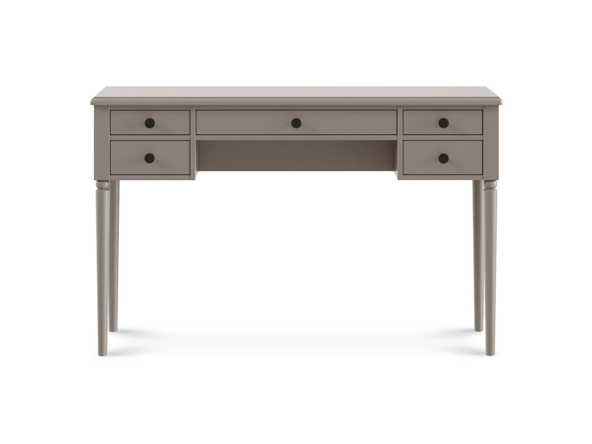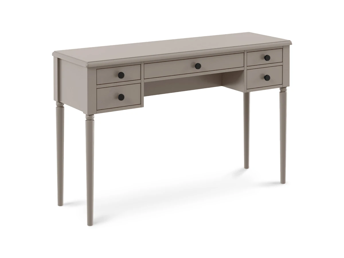 Коллекция Music — респектабельная мебель с классической основой. Обладает притягательной энергетикой изящных форм, поэтичного черного цвета и безупречным исполнением. Комоды, тумбы, банкетки, консольные и журнальные столики подходят для оформления гостиной, спальни, прихожей, мастерской, студии, бьюти-зоны. Идеально вписывается в стилистику неоклассики, арт-деко, минимализма, эклектики. Лейтмотив коллекции — барочные элементы: фигурные ножки из массива дерева, каретная стяжка «капитоне», акцентные детали в бронзовом и золотистом цвете. Изделия подчеркнут в интерьере смелость, выразительность, спокойствие. Они надежно сохранят ваши секреты, помогут разложить вещи по местам и поддержат настроение «тихой роскоши». Могут выступать на контрасте с главенствующим светлым оттенком или быть частью ненавязчивого темного фона. Туалетный столик с пятью выдвижными ящиками. Столик необходимо крепить к стене. Ручки включены в стоимость. RAL DESIGN 080 60 05 Gloss 20 «Серая фланель».