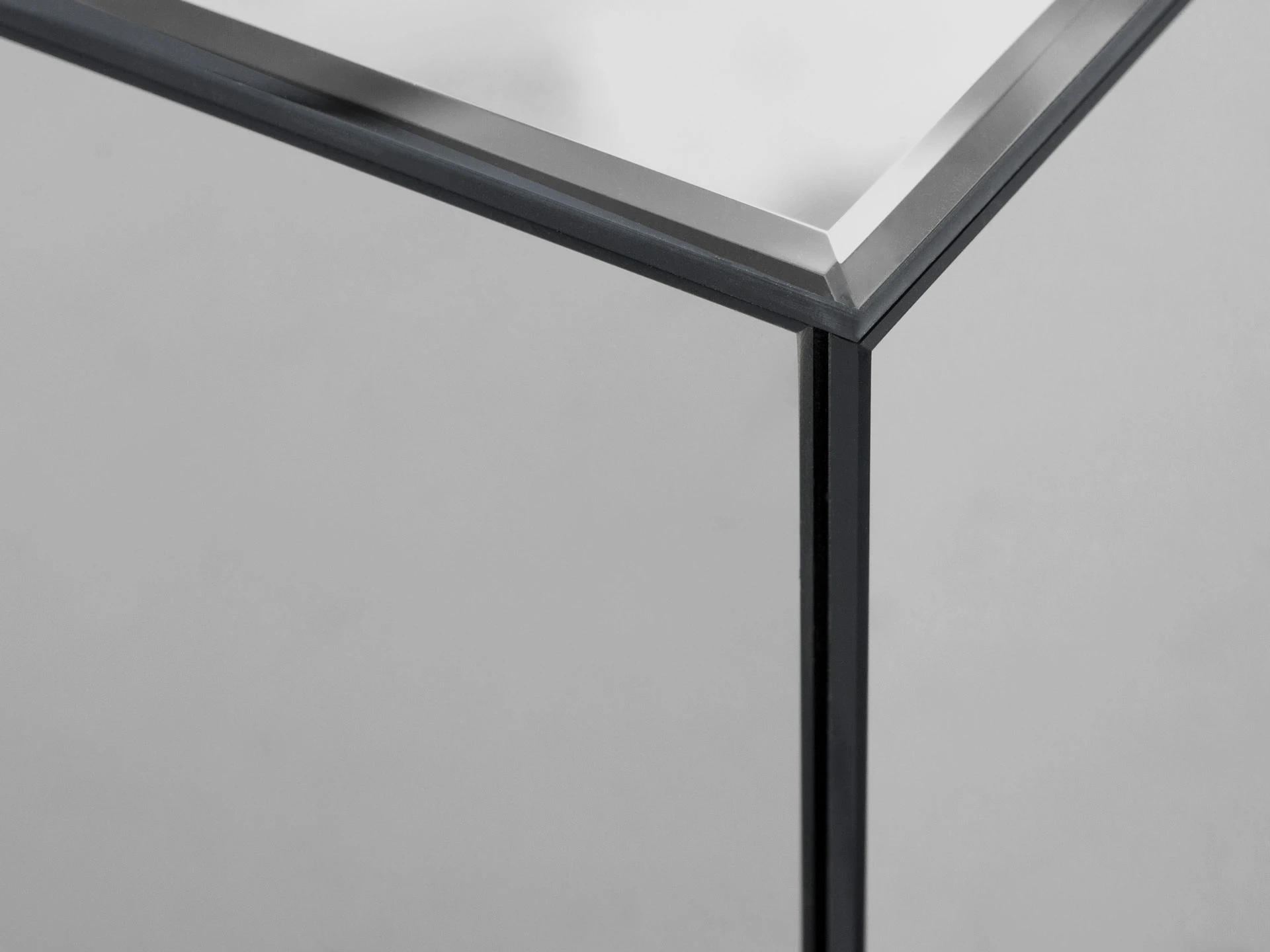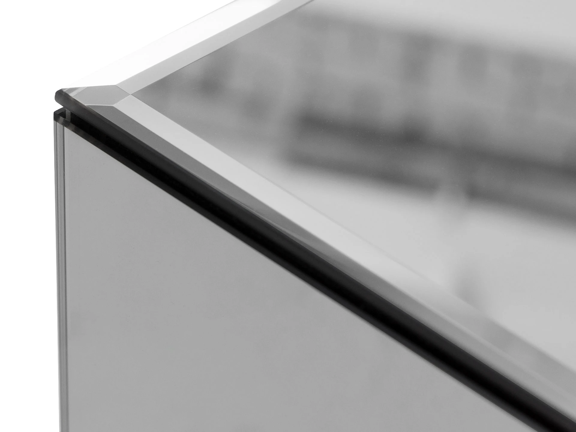 Стильный компактный стол Lucky. Зеркальный со всех сторон, что делает его оригинальной деталью интерьера. Основа стола – ламинированная плита черная шагрень толщиной 16 мм. Кромки зеркала крышки – фацет. Другие элементы окантованы еврокромкой. Выдерживает нагрузки до 15 кг Размер крышки: 800х800 мм Высота стола: 270 мм Высота цокольной коробки 65 мм.