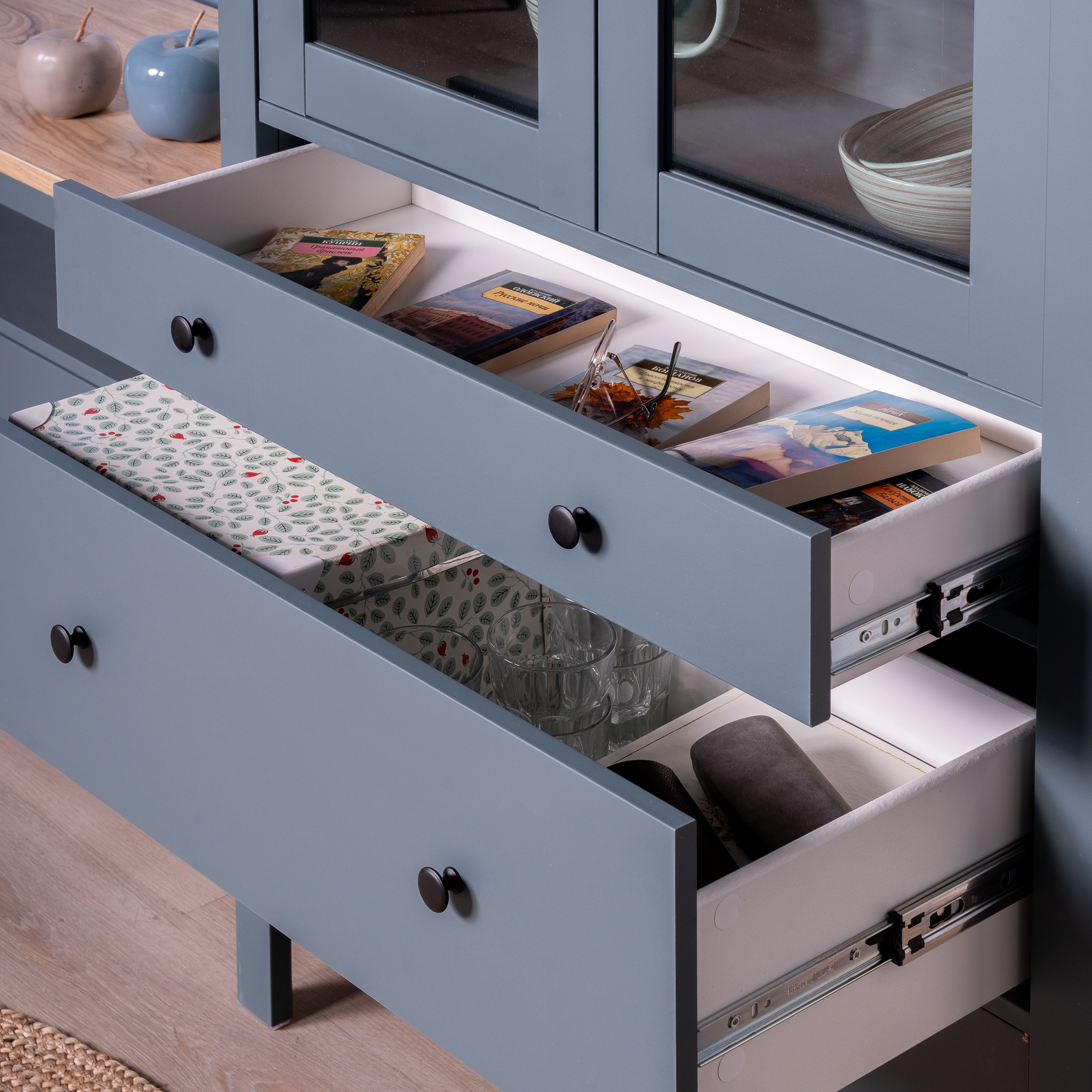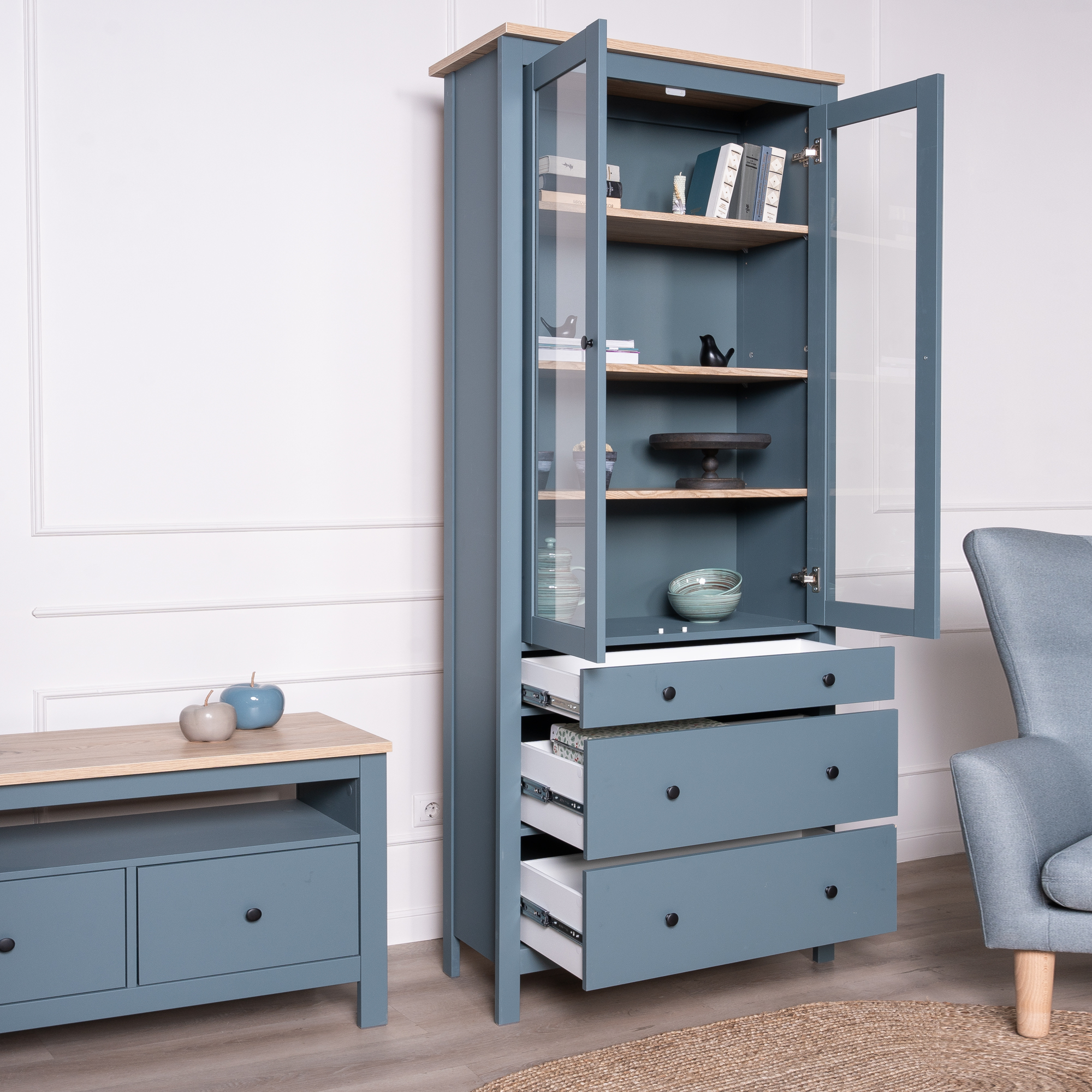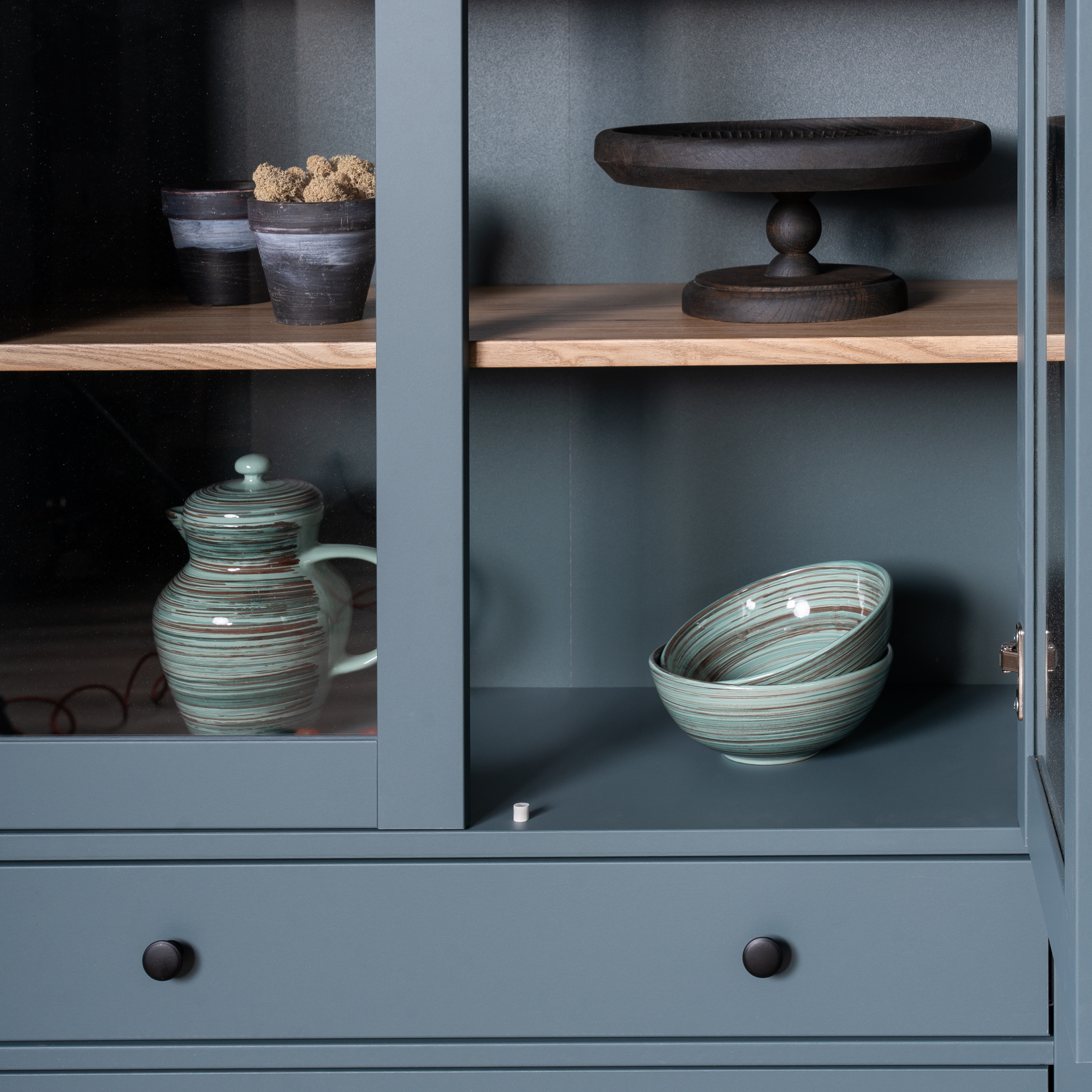 Дополнительная информация по мебели — САГА шкаф с витриной 90 темно-бирюзовый/ясень RU