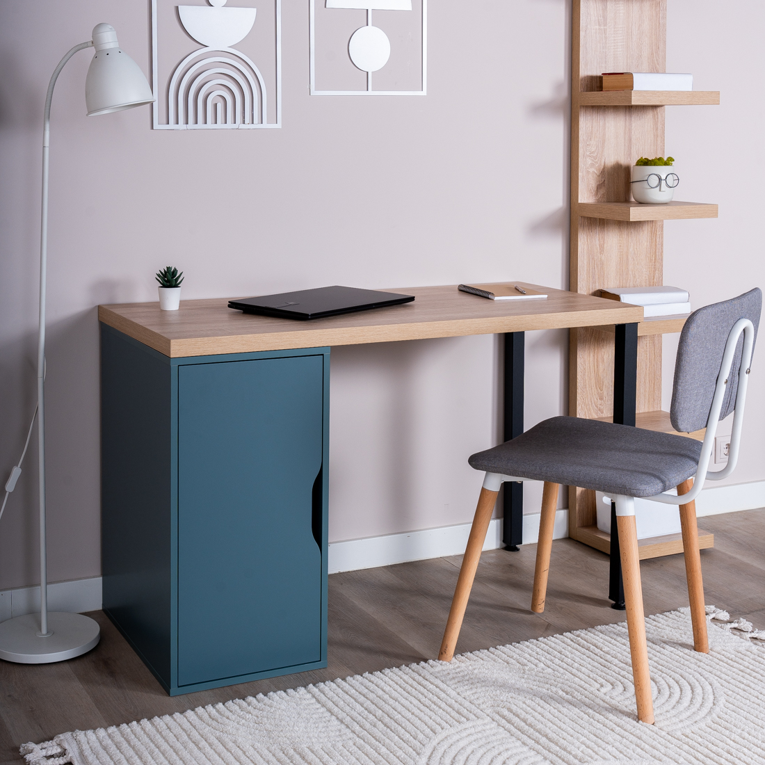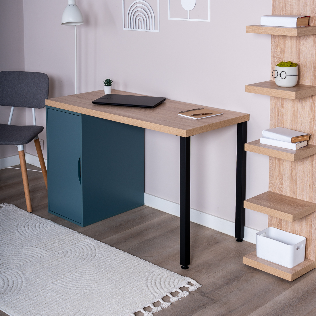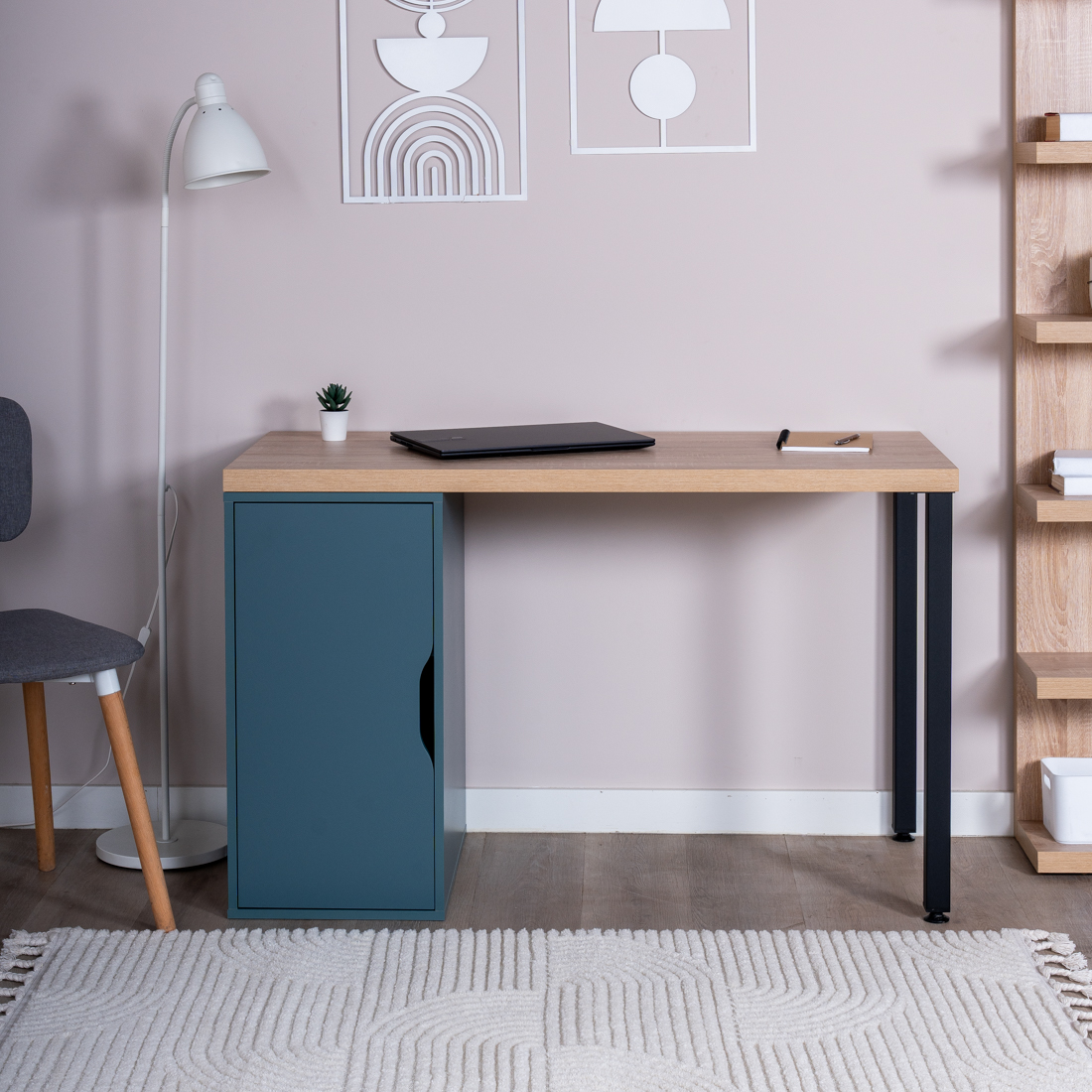 Ингар 2/ДВ/T стол письменный 140x75x55, дуб беленый/серо-бирюзовый/черный