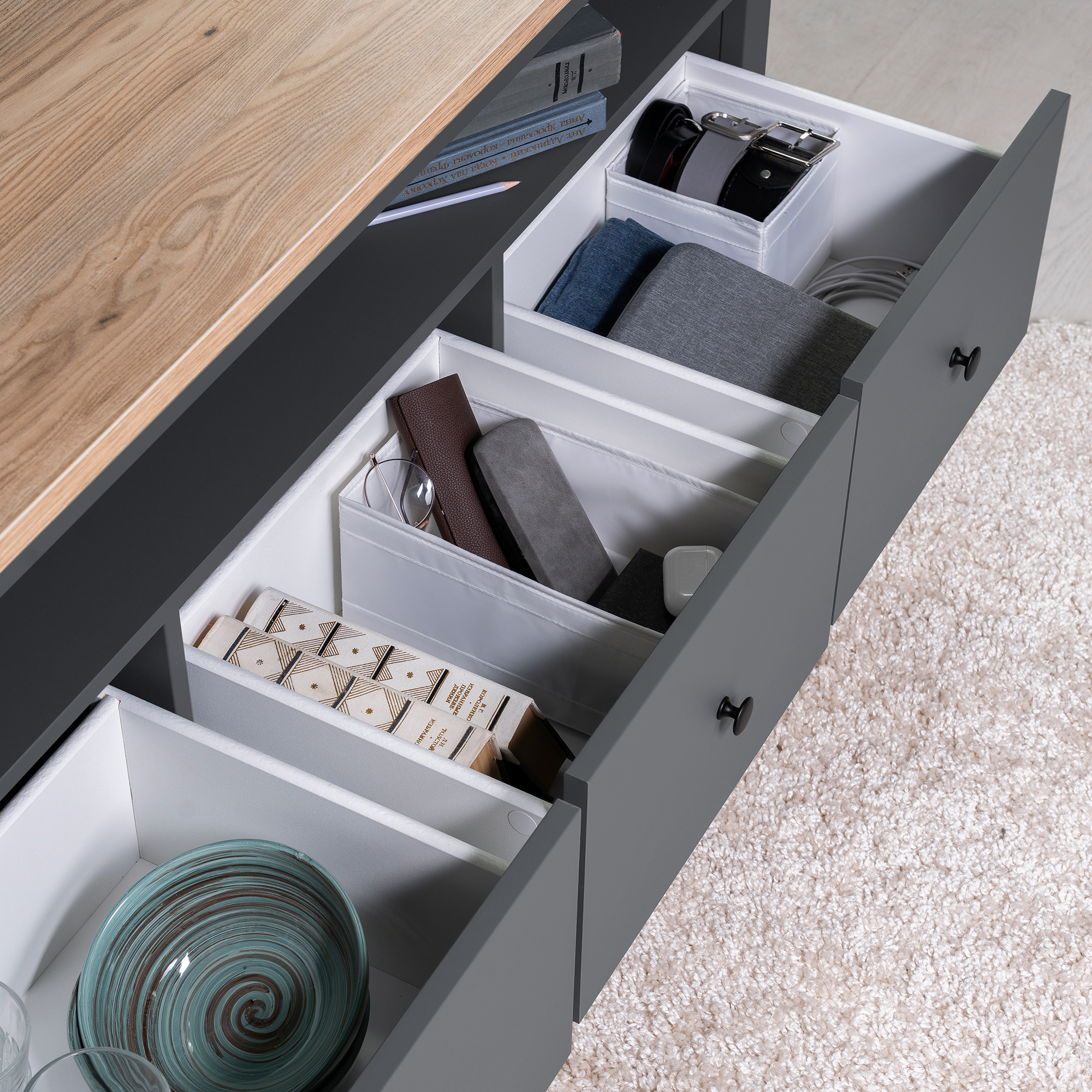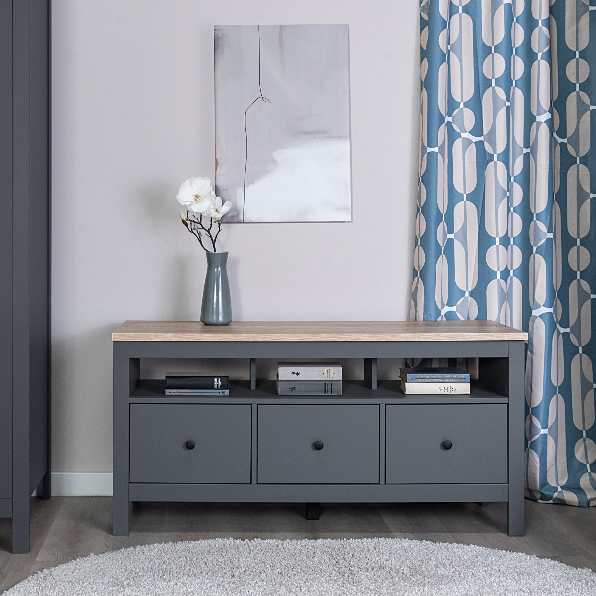 Дополнительная информация по мебели — САГА тумба 3 ящика серая/ясень RU