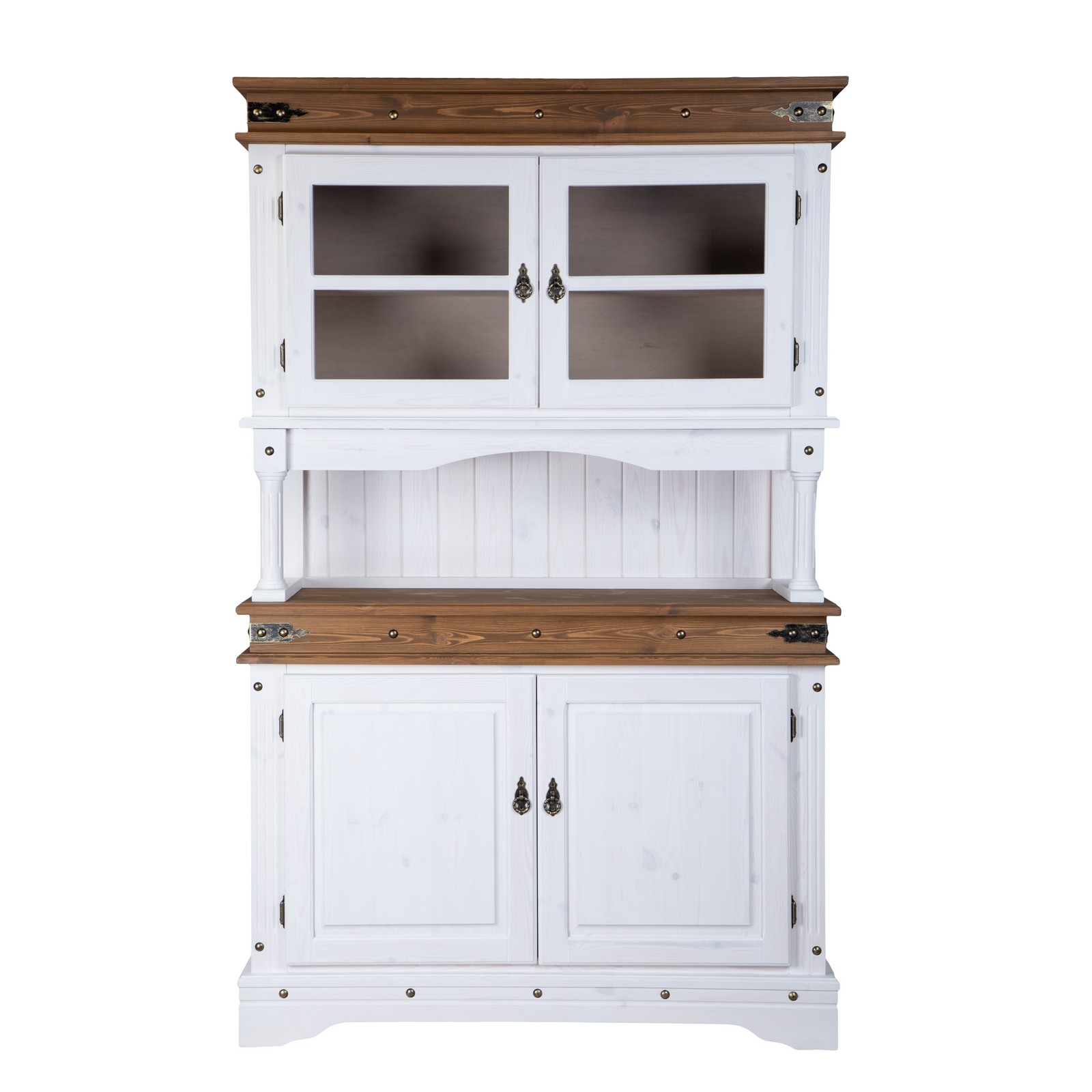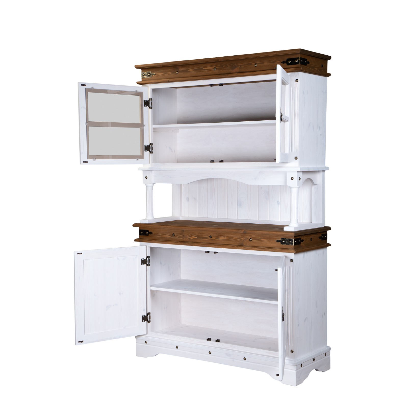 Буфет Викинг - 01 белый воск/антик изготовлен из сосны. В верхней части буфета Викинг обширная открытая ниша с остекленной витриной для размещения столовых приборов, сервизов, сувениров.