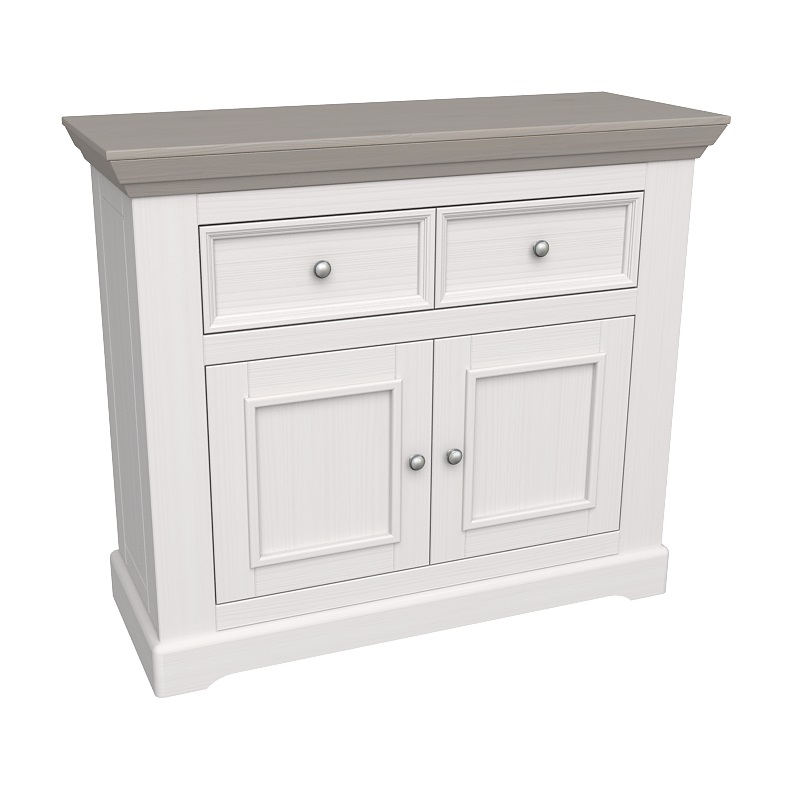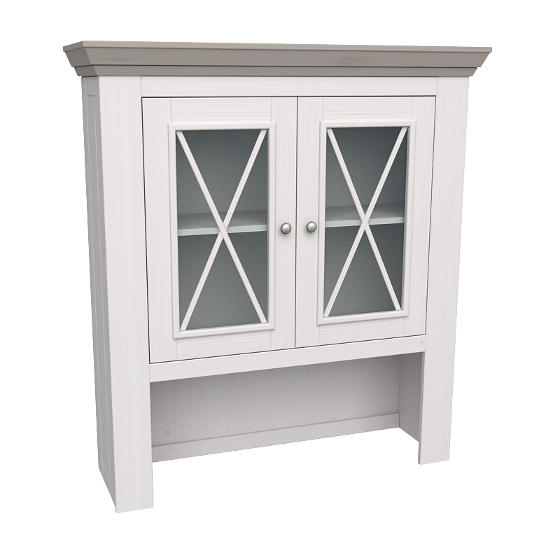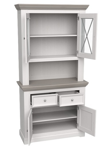 Малый буфет белорусской коллекции Форест из соснового массива в белом цвете. Включает в себя двухдверный нижний комод, который есть возможность приобрести отдельно и верхней надстройки буфета с двумя витринного типа дверцами.. Немецкая фурнитура обеспечивает плавное движение ящиков и бесшумное движение фасадов.