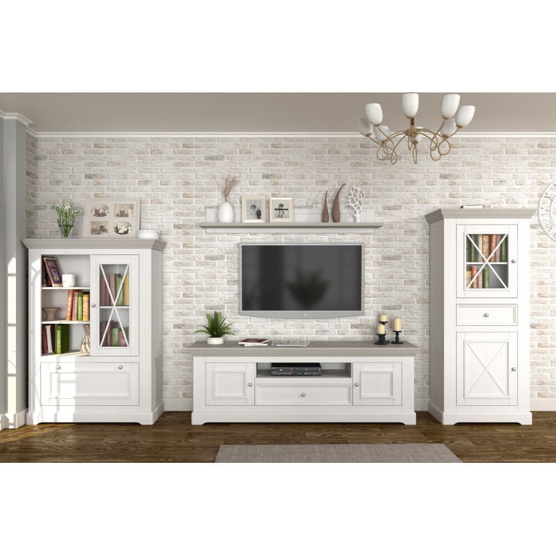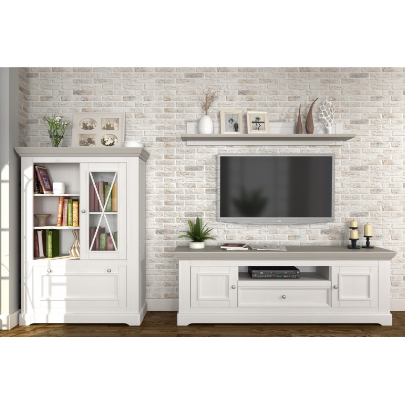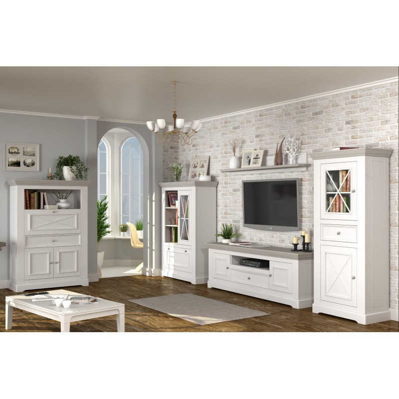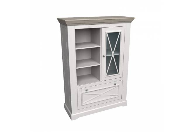 В конструкции комод - 2 дверки (нижняя откидная закрытая и верхняя витринного типа) и 2 открытые полочки для размещения предметов интерьера, книг - сосновый массив.
