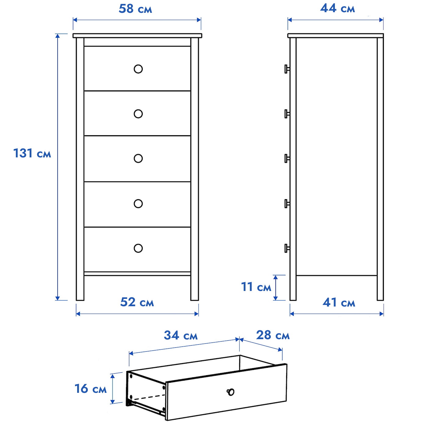 Комод с 5 ящиками КАНТРИ (ХЕМНЭС) белый. Корпус изготовлен из массива сосны. Дно ящиков и задняя стенка из оргалита.