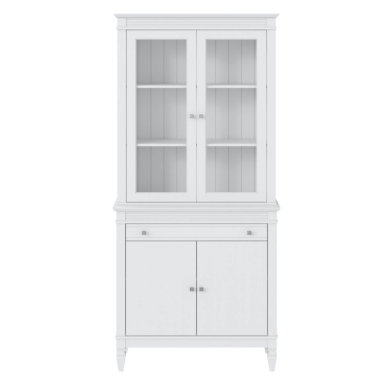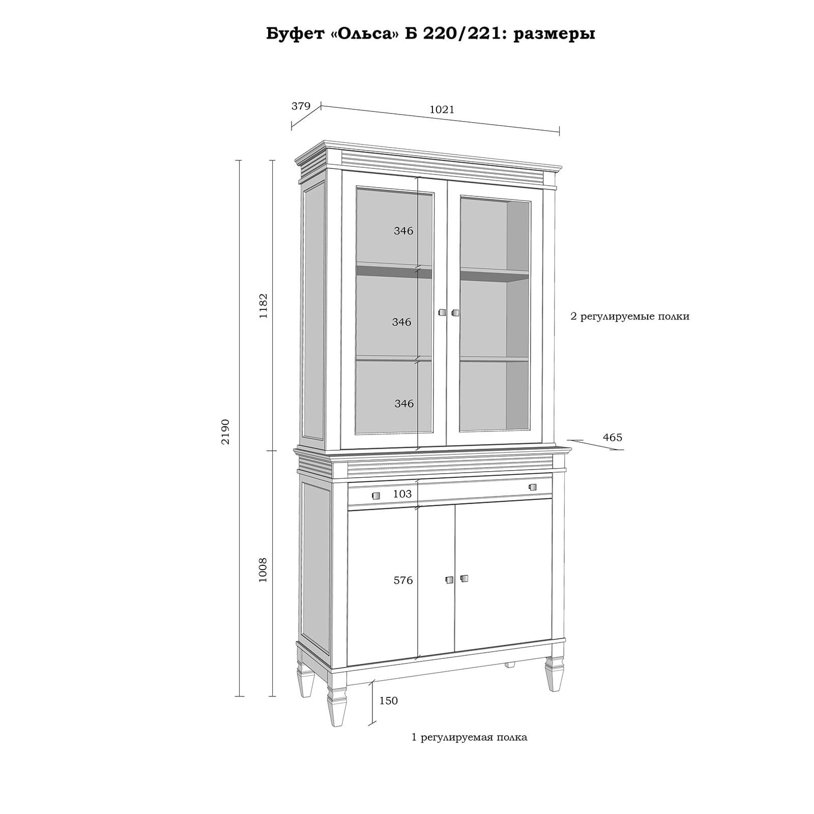 Буфет Ольса 220/221 Белый лак изготовлен из массива сосны. В буфете 2 внутренние полки сверху и одна полка внизу, 2 стеклянные дверцу сверху, 2 глухие внизу, 1 ящик.