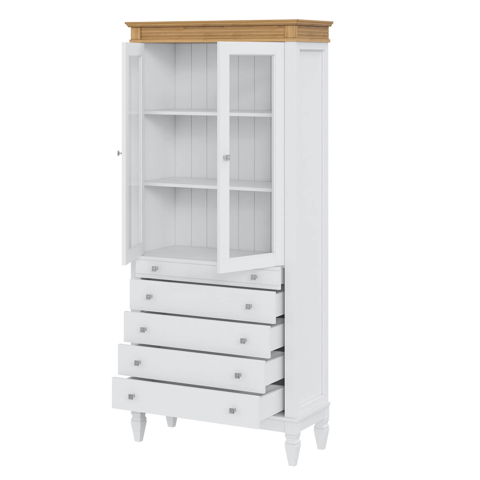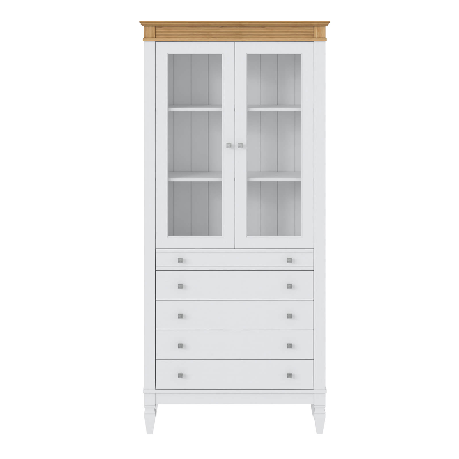 Деревянный стеллаж из сосны / кухонный буфет Ольса-202/014 Белый лак + антик №24 массив сосны, 2 стеклянные двери , 5 ящиков.