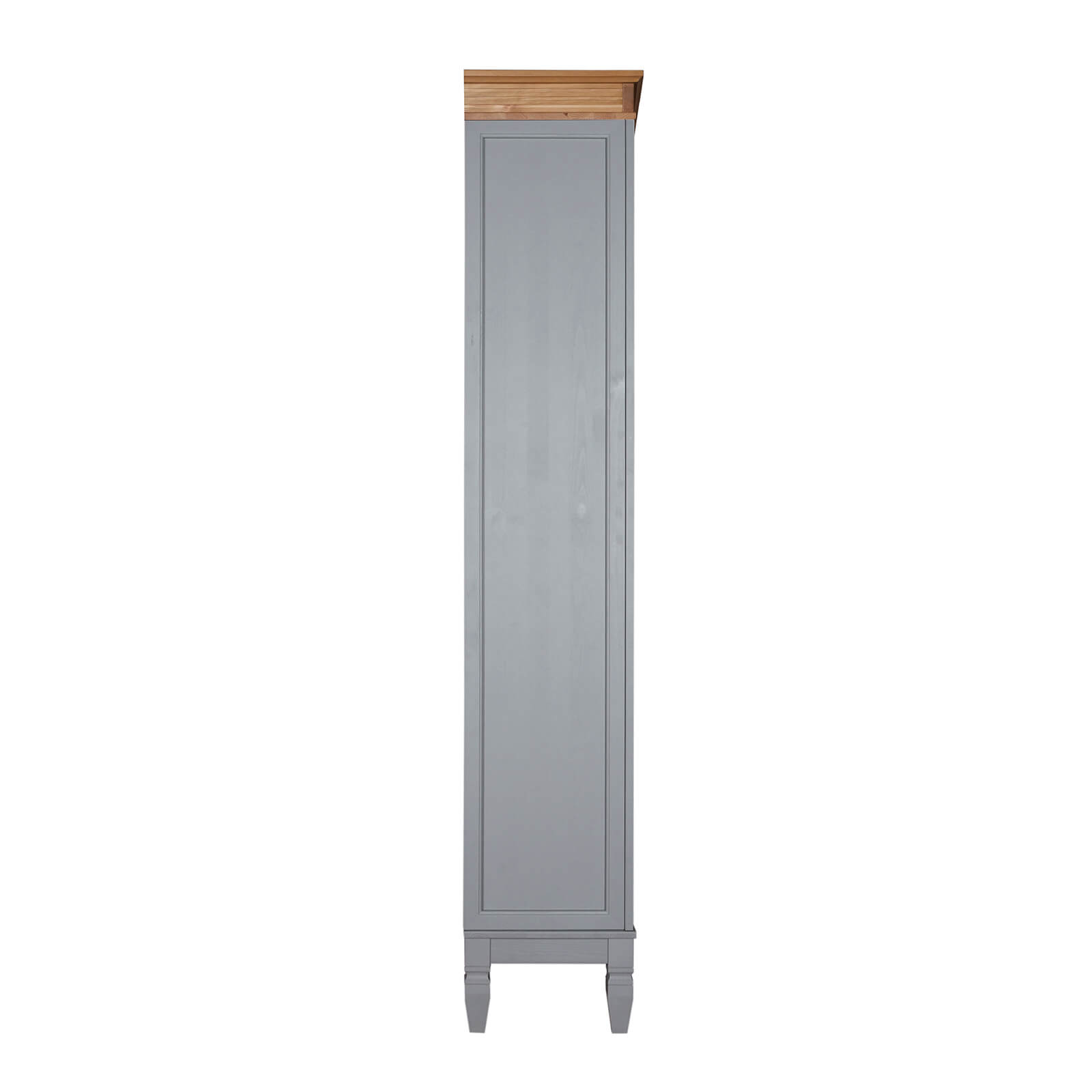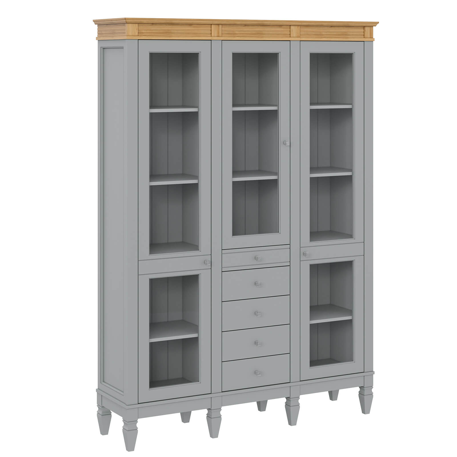 Деревянный стеллаж из сосны / кухонный буфет Ольса-321/014 серый №7042 + антик №24 массив сосны, 3 вертикальные секции , 3 стеклянные двери и 5 ящиков - верхний ящик меньше по высоте .