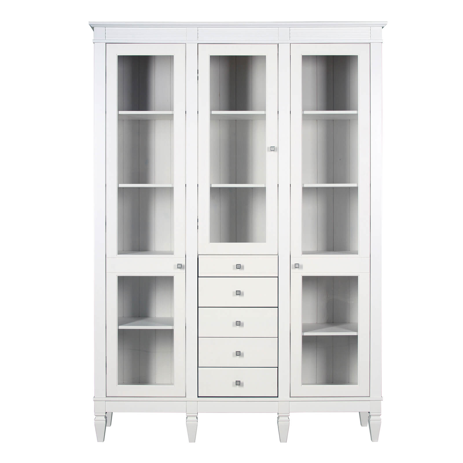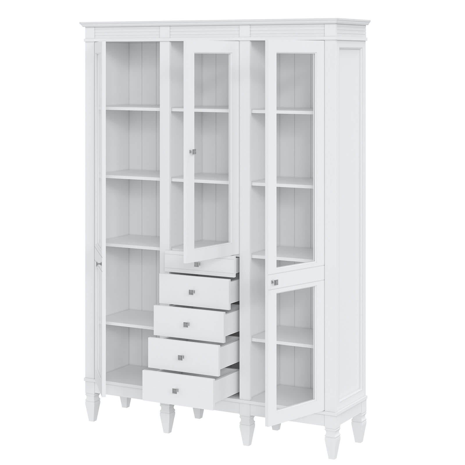 Деревянный стеллаж из сосны / кухонный буфет Ольса-321/014 Белый лак массив сосны, 3 вертикальные секции , 3 стеклянные двери и 5 ящиков - верхний ящик меньше по высоте .
