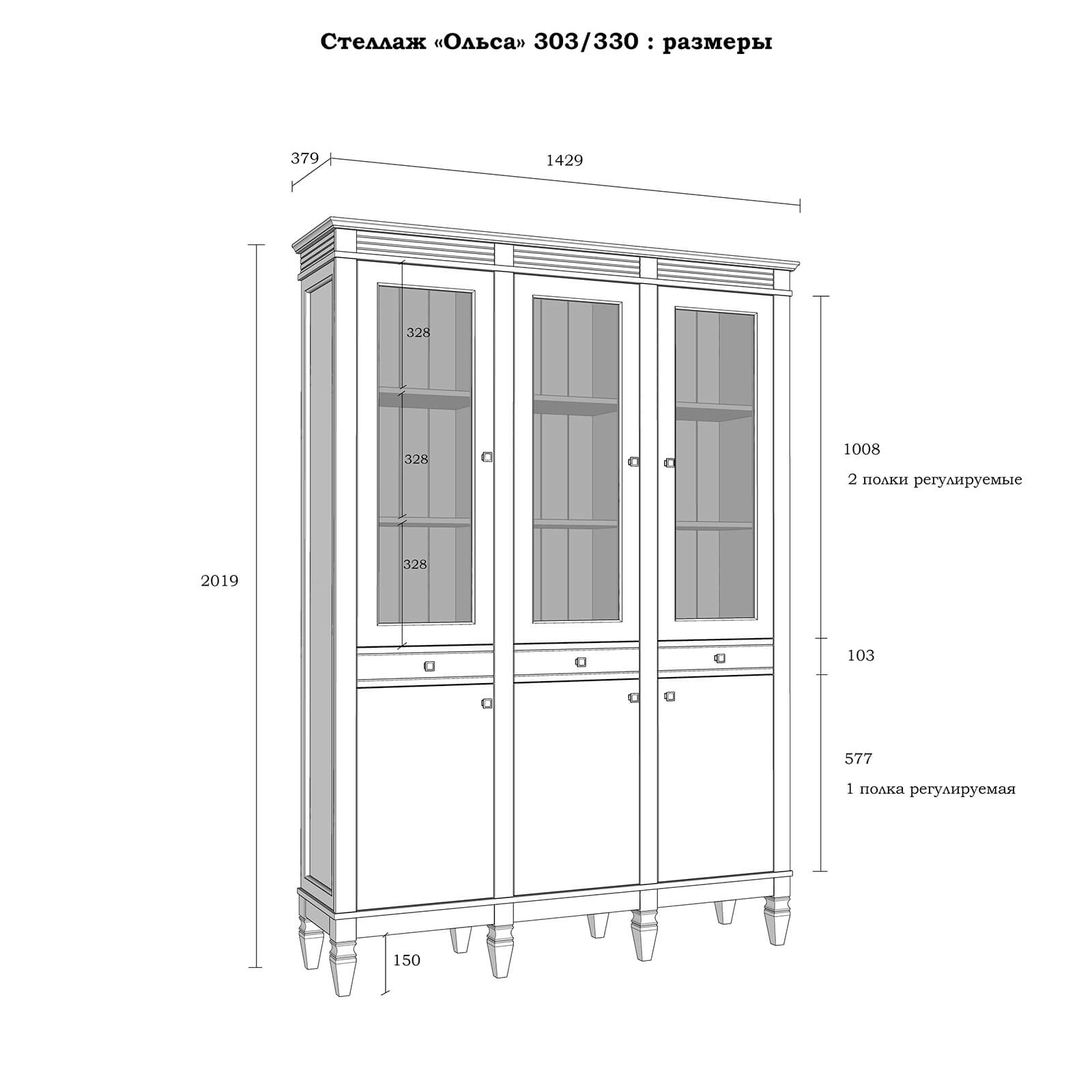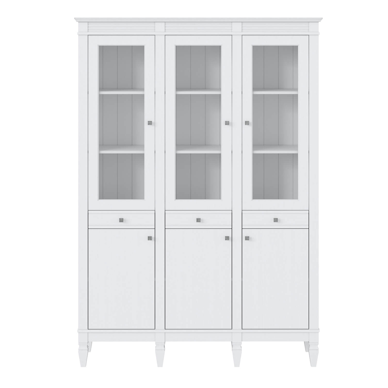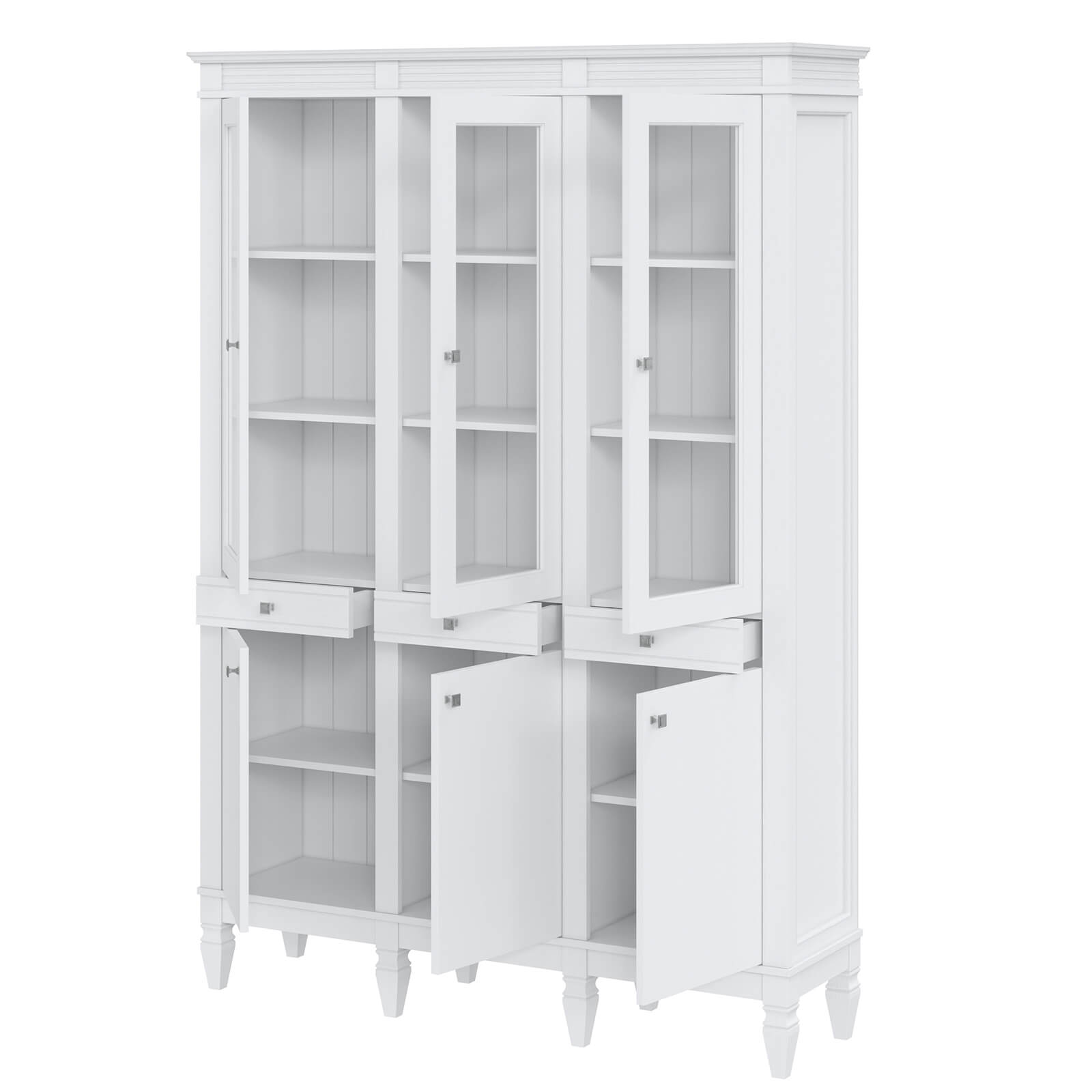 Деревянный стеллаж из сосны / кухонный буфет Ольса-303/330 Белый лак массив сосны, 3 вертикальные секции , в каждой по 4 полки и 3 стеклянные двери и 3 глухие дверцы, 3 ящика над ними.
