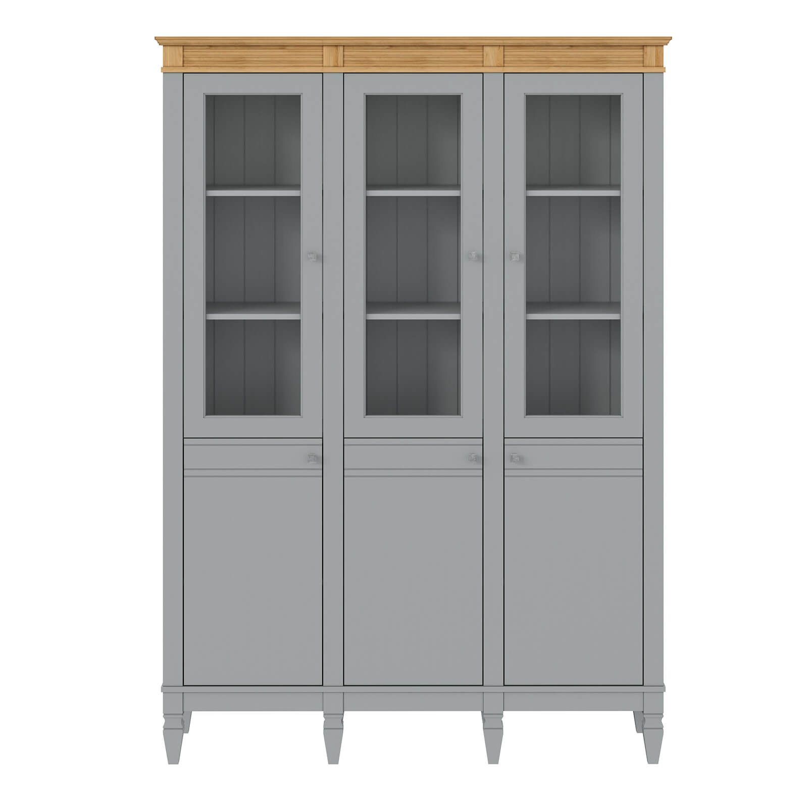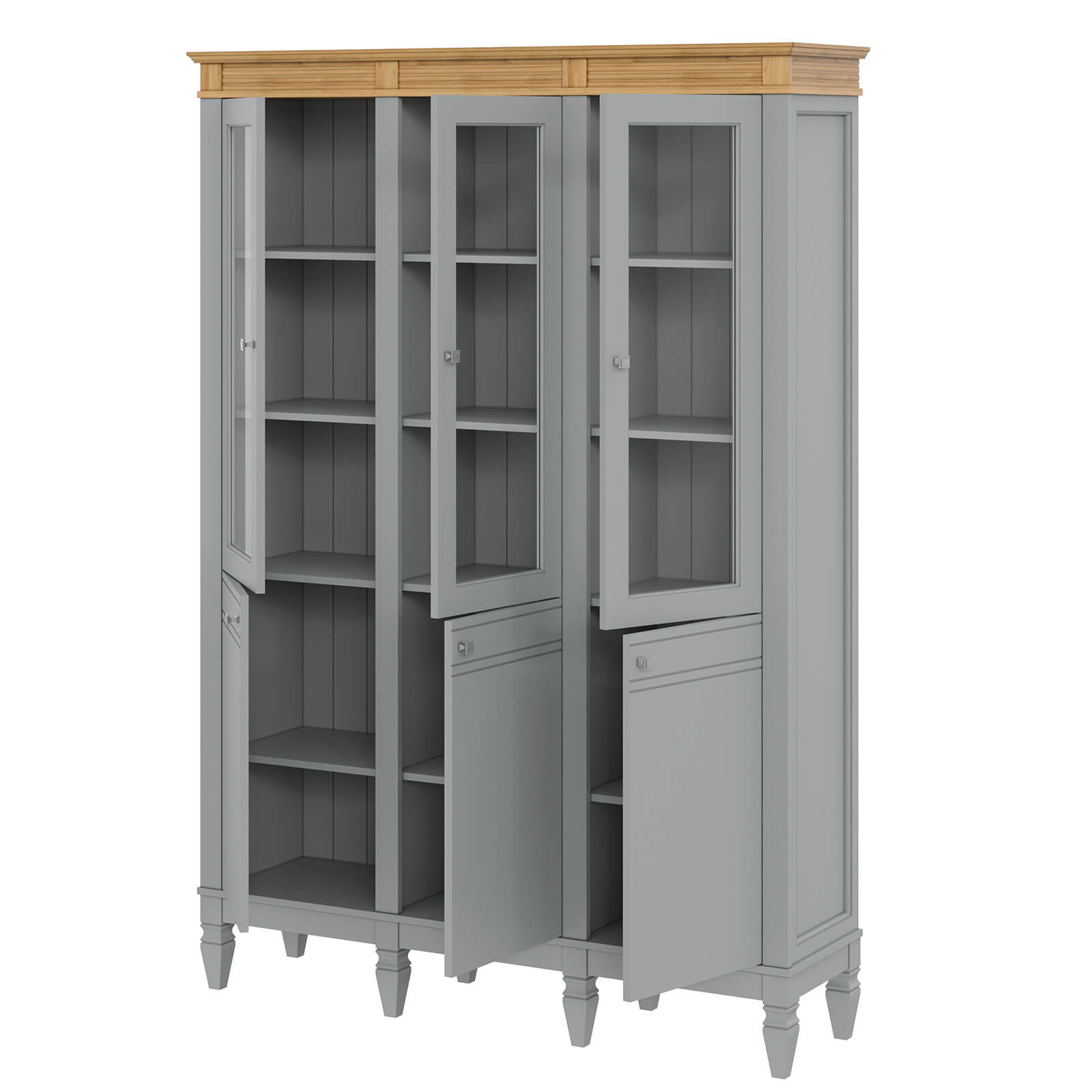 Деревянный стеллаж из сосны / кухонный буфет Ольса-303/300 серый №7042 + антик №24 массив сосны, 3 вертикальные секции , в каждой по 4 полки и 3 стеклянные двери и 3 глухие дверцы.