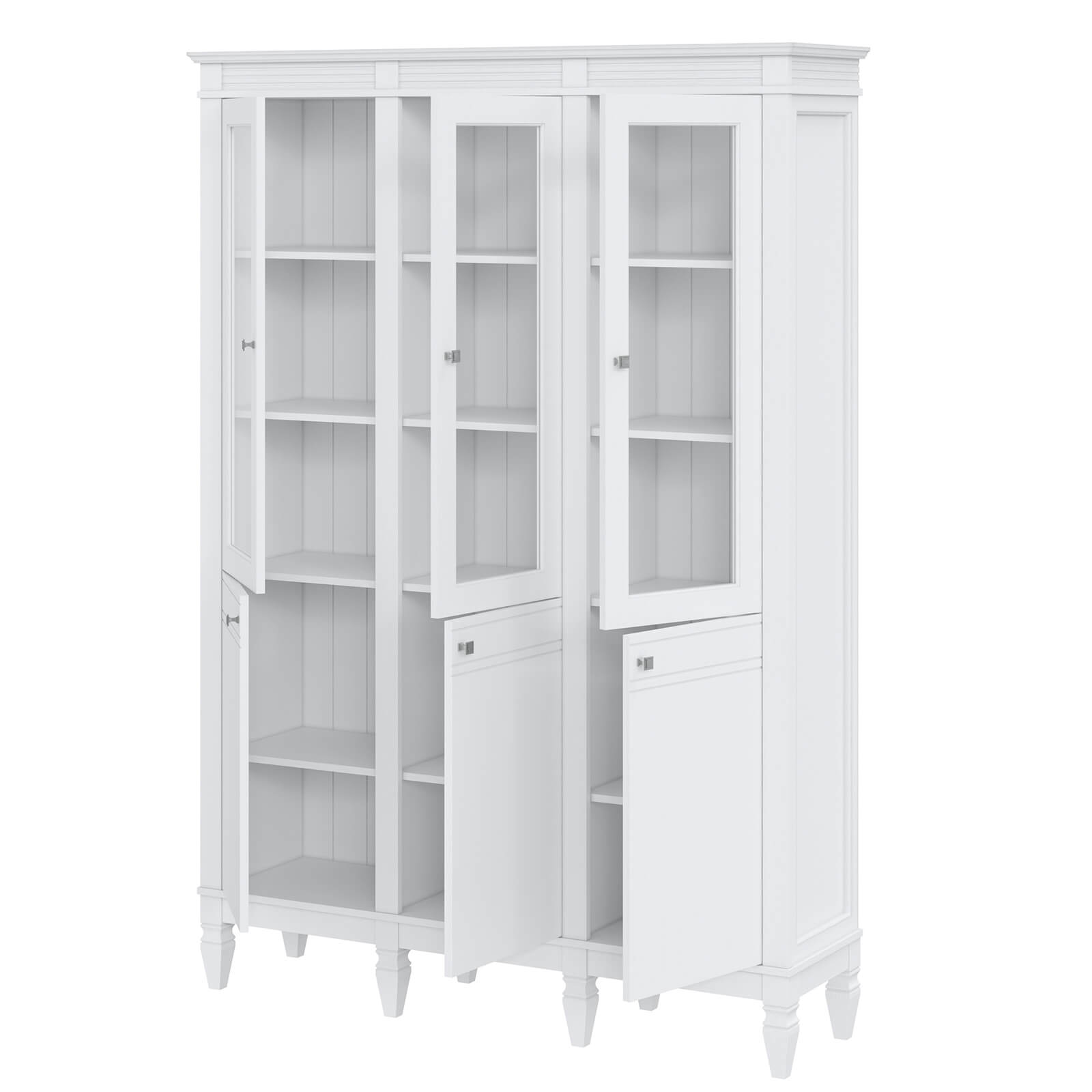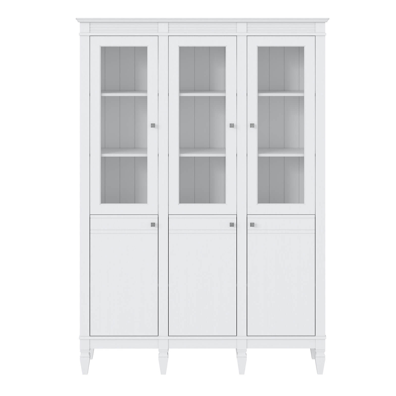 Деревянный стеллаж из сосны / кухонный буфет Ольса-303/300 Белый лак массив сосны, 3 вертикальные секции , в каждой по 4 полки и 3 стеклянные двери и 3 глухие дверцы.