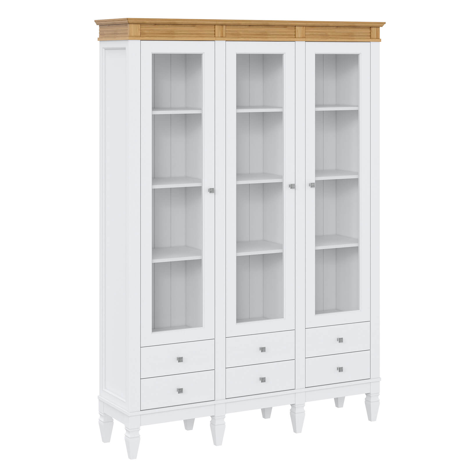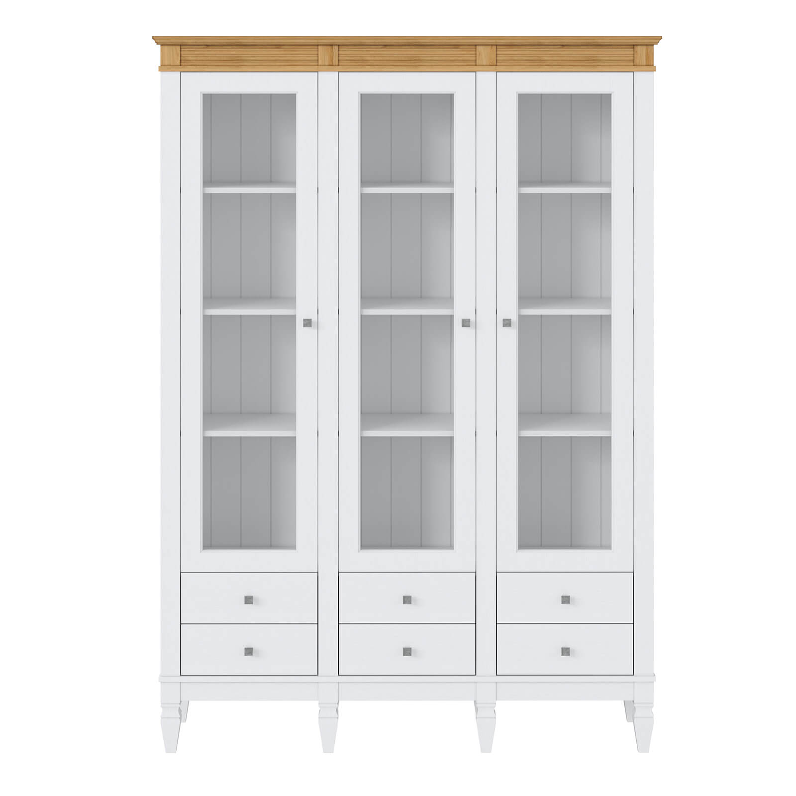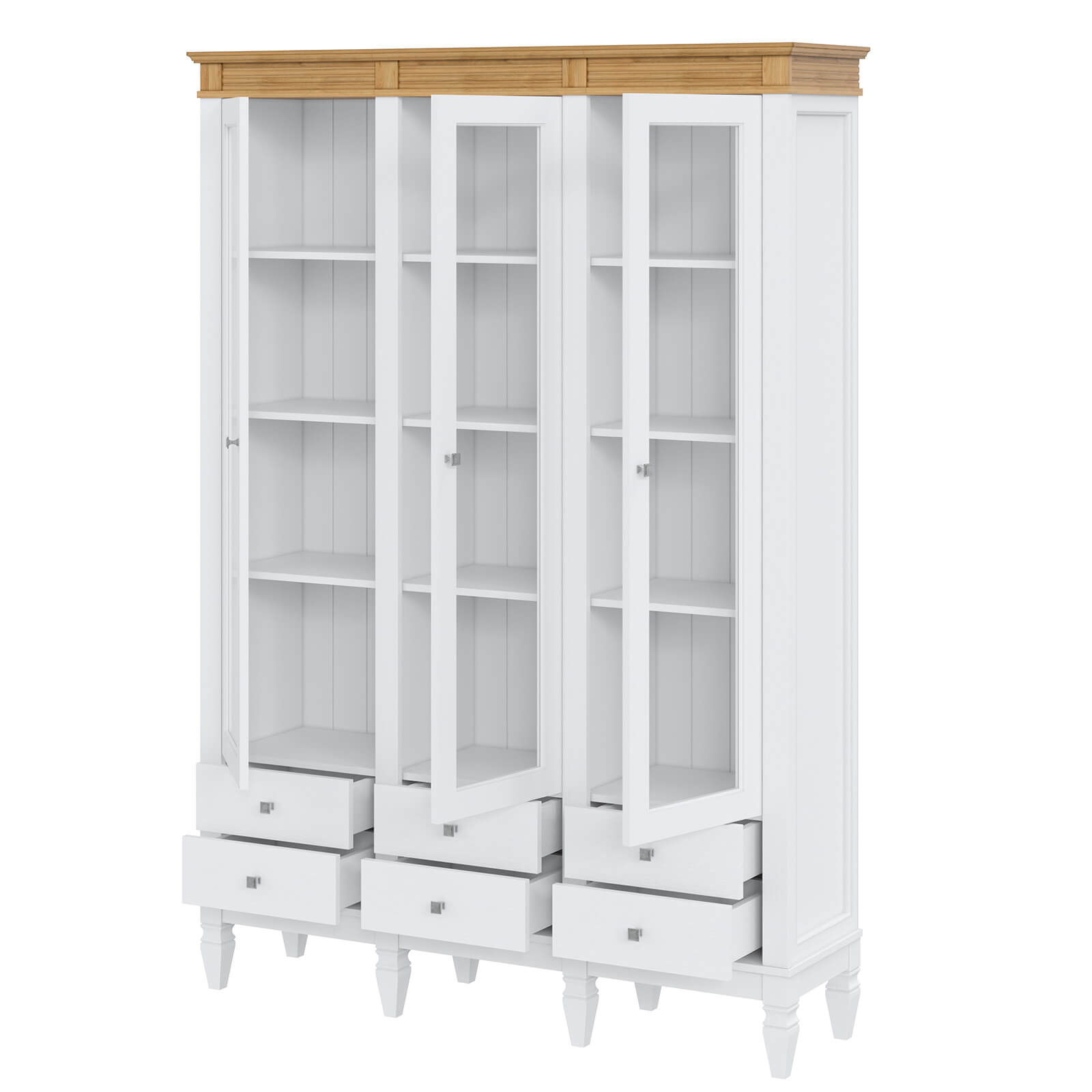Деревянный стеллаж из сосны / кухонный буфет Ольса-303/006 Белый лак + антик №24 массив сосны, 3 вертикальные секции , 3 двери и 5 ящиков.