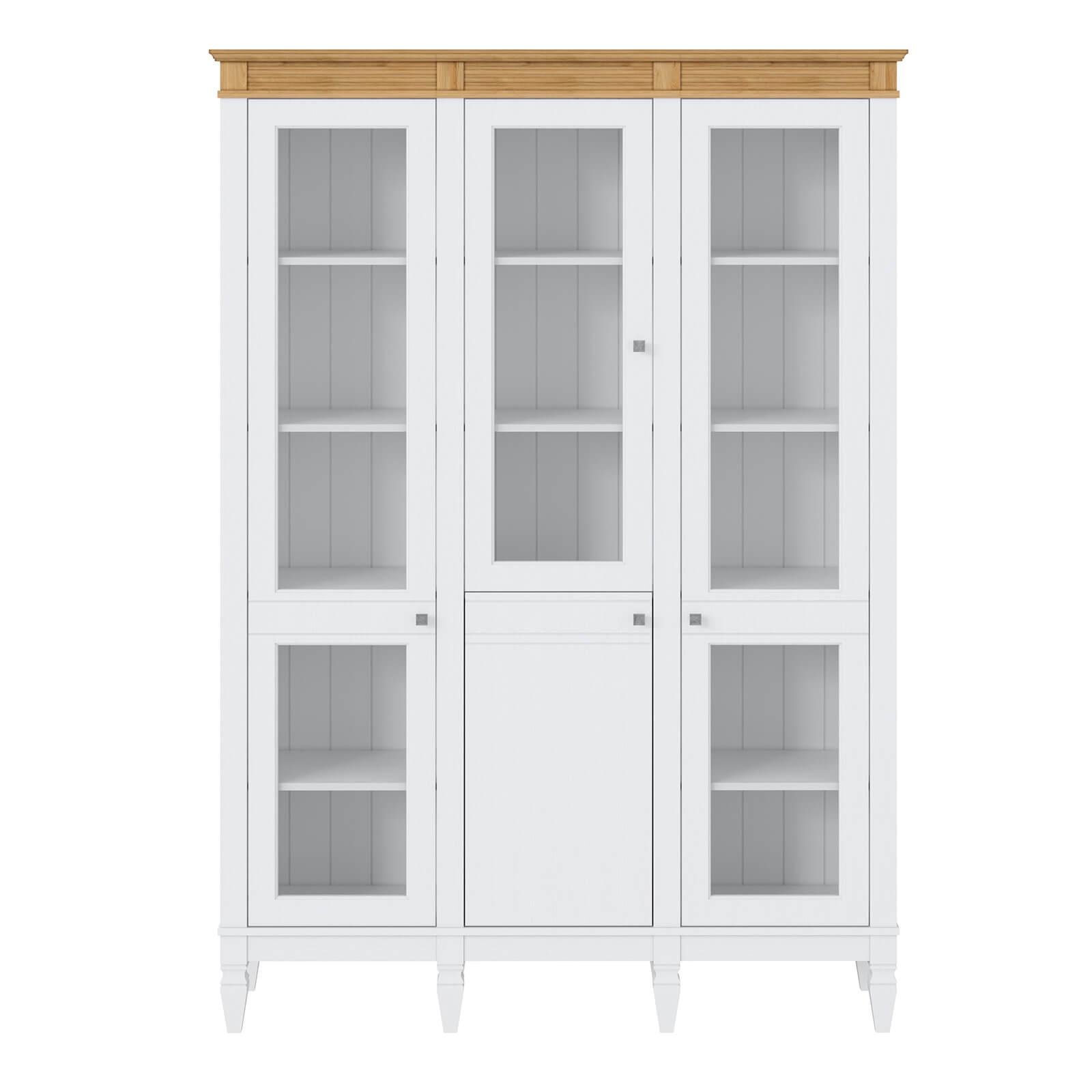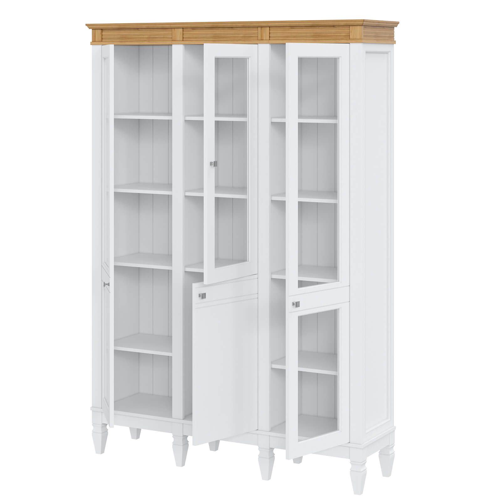 Деревянный стеллаж из сосны / кухонный буфет Ольса-321/100 Белый лак + антик №24 массив сосны, 3 вертикальные секции ,  3 стеклянные двери  и глхая дверь.