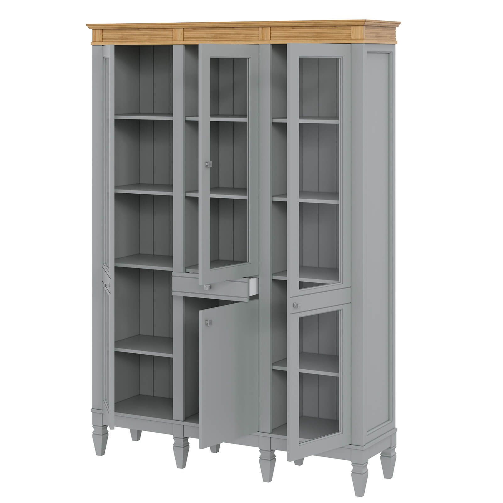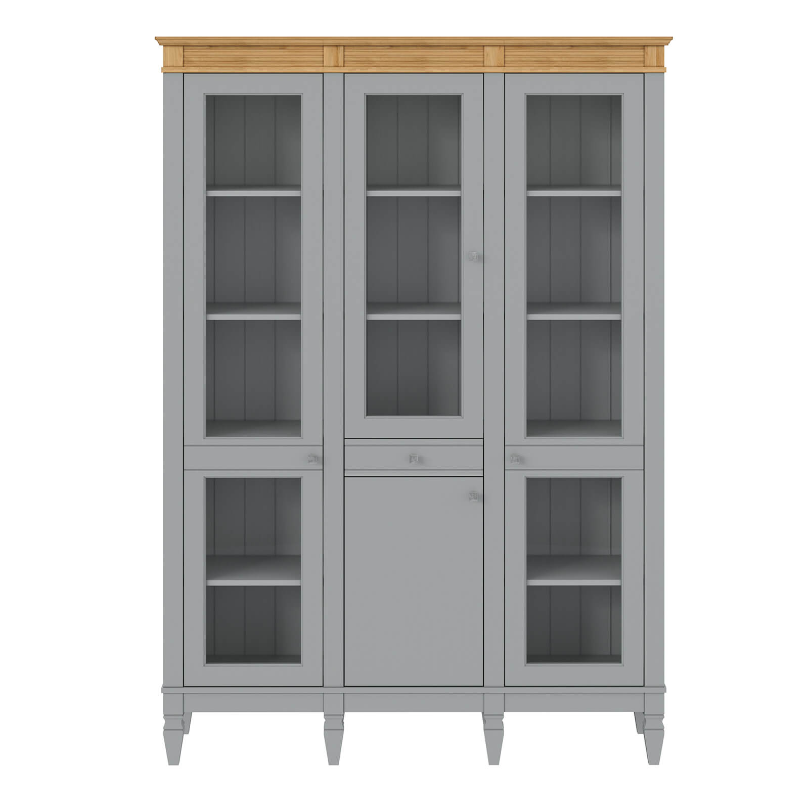 Деревянный стеллаж из сосны / кухонный буфет Ольса-321/110 серый №7042 + антик №24 массив сосны, 3 вертикальные секции , 3 стеклянные двери и глухая дверь, один ящик.