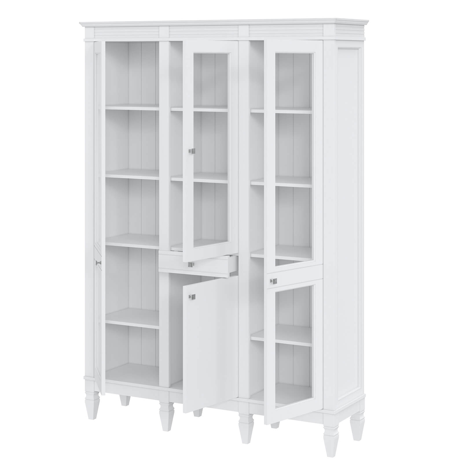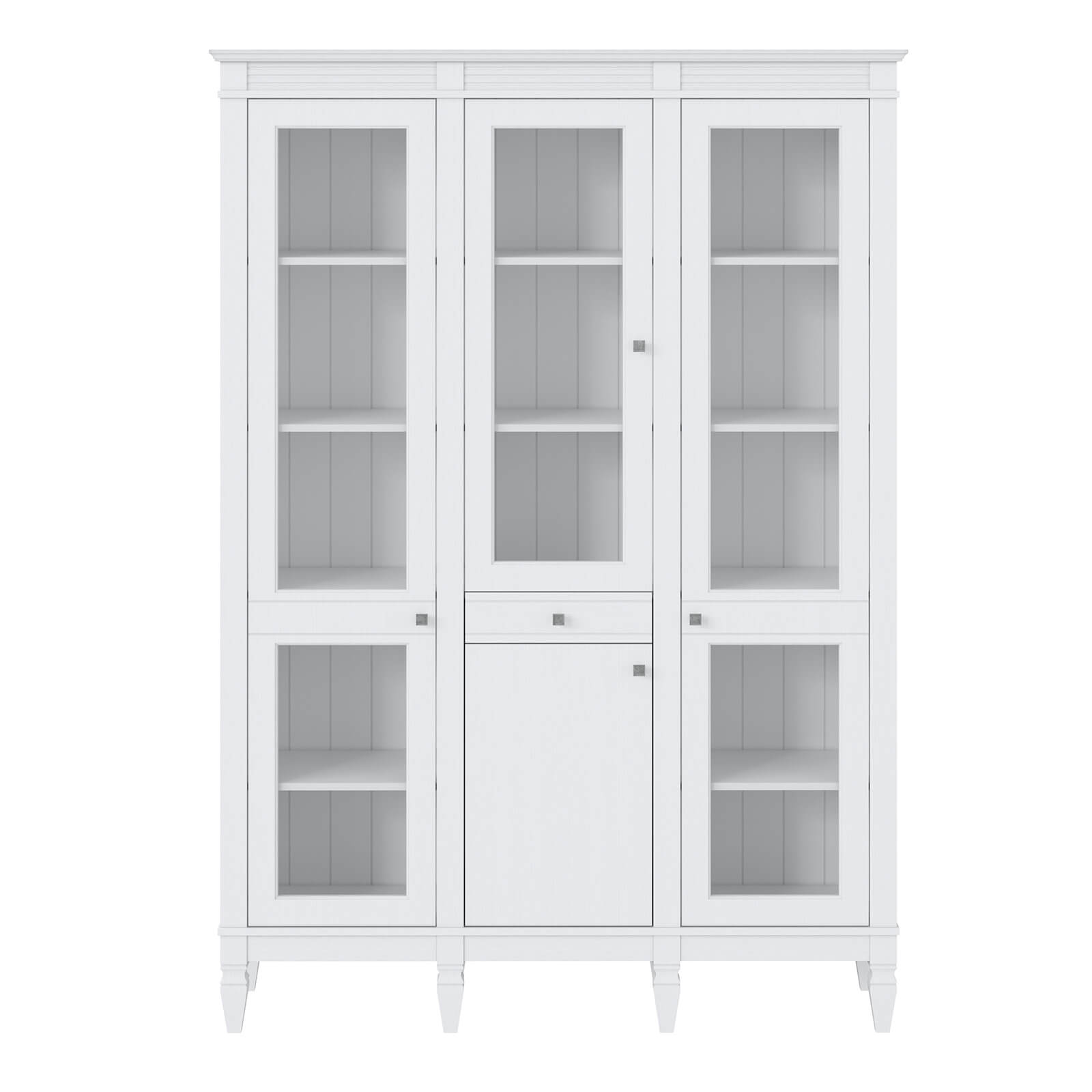 Деревянный стеллаж из сосны / кухонный буфет Ольса-321/110 Белый лак массив сосны, 3 вертикальные секции , 3 стеклянные двери и глухая дверь, один ящик.