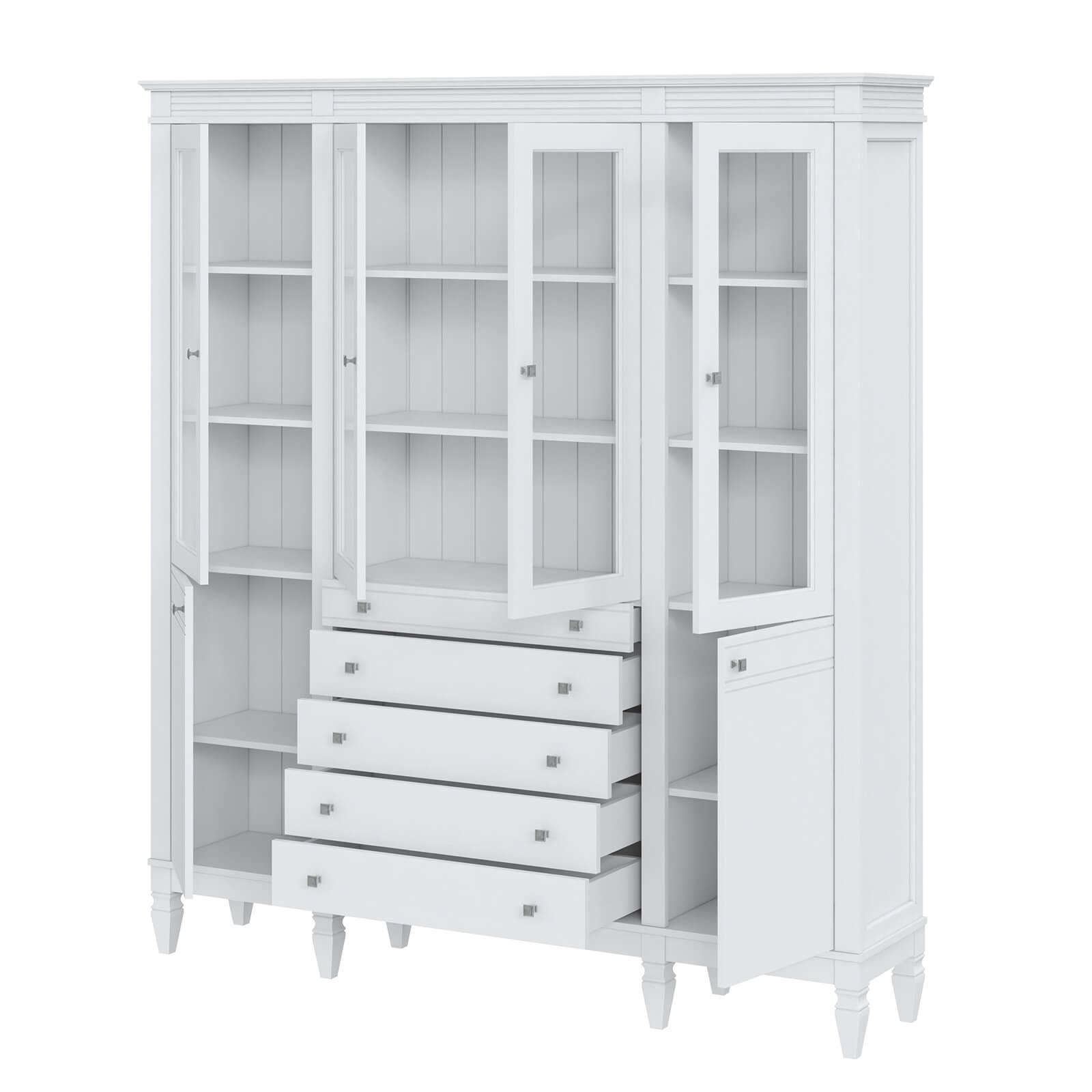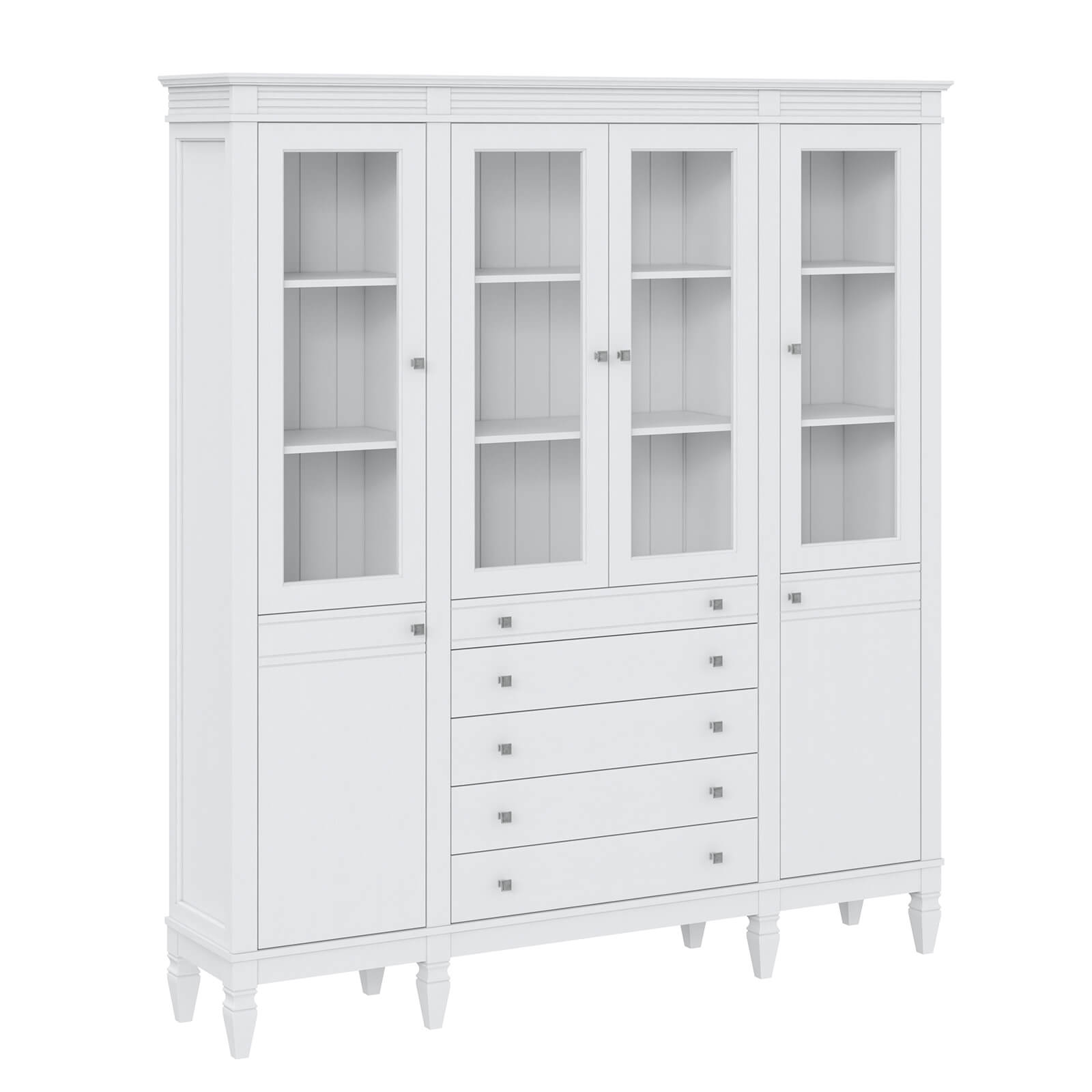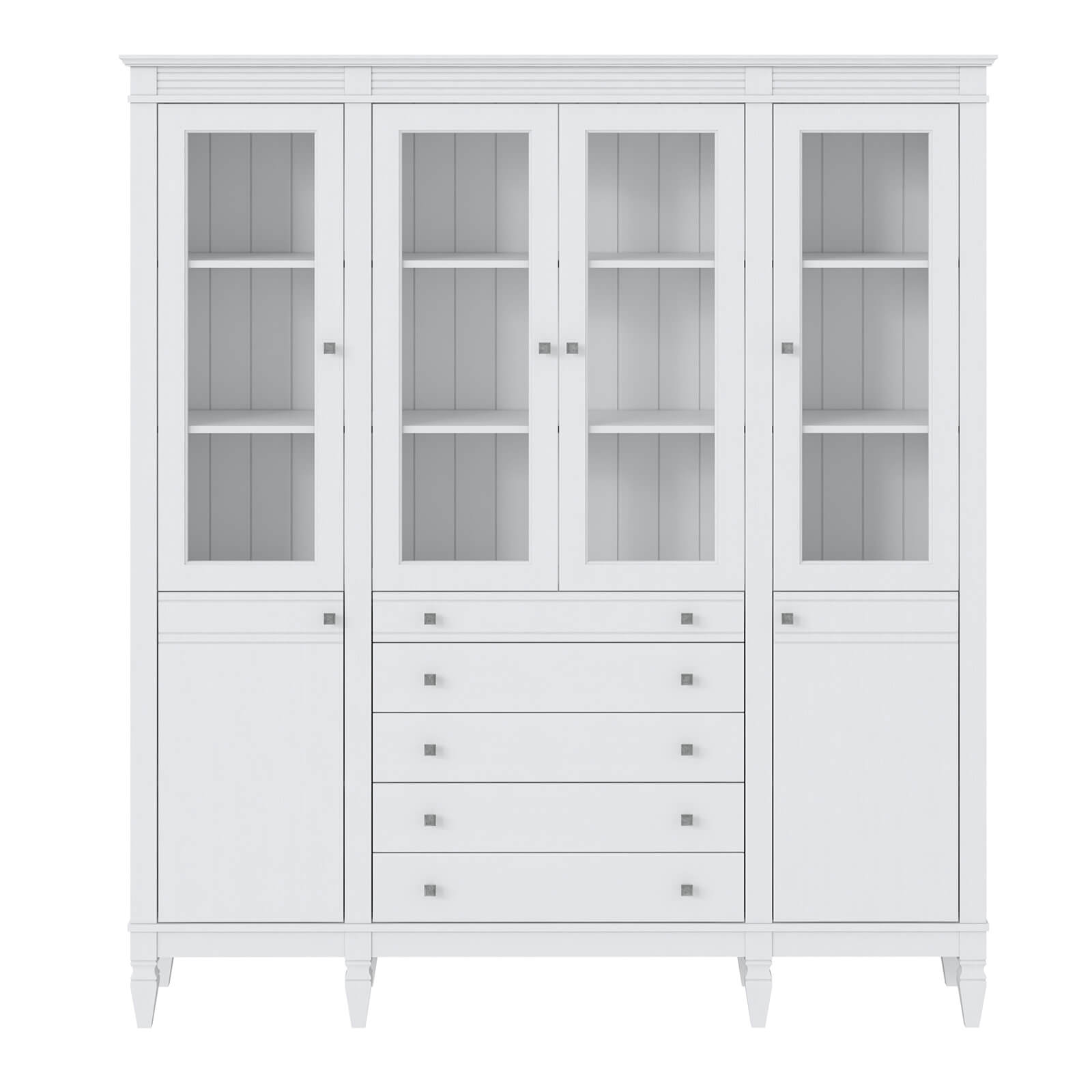 Деревянный стеллаж из сосны / кухонный буфет Ольса-404/214 Белый лак массив сосны, визуально разделен на три вертикальных секции, в каждой из  четыре полки,  4 стеклянных дверцы, 2 глухих дверцы  и 5 ящиков.
