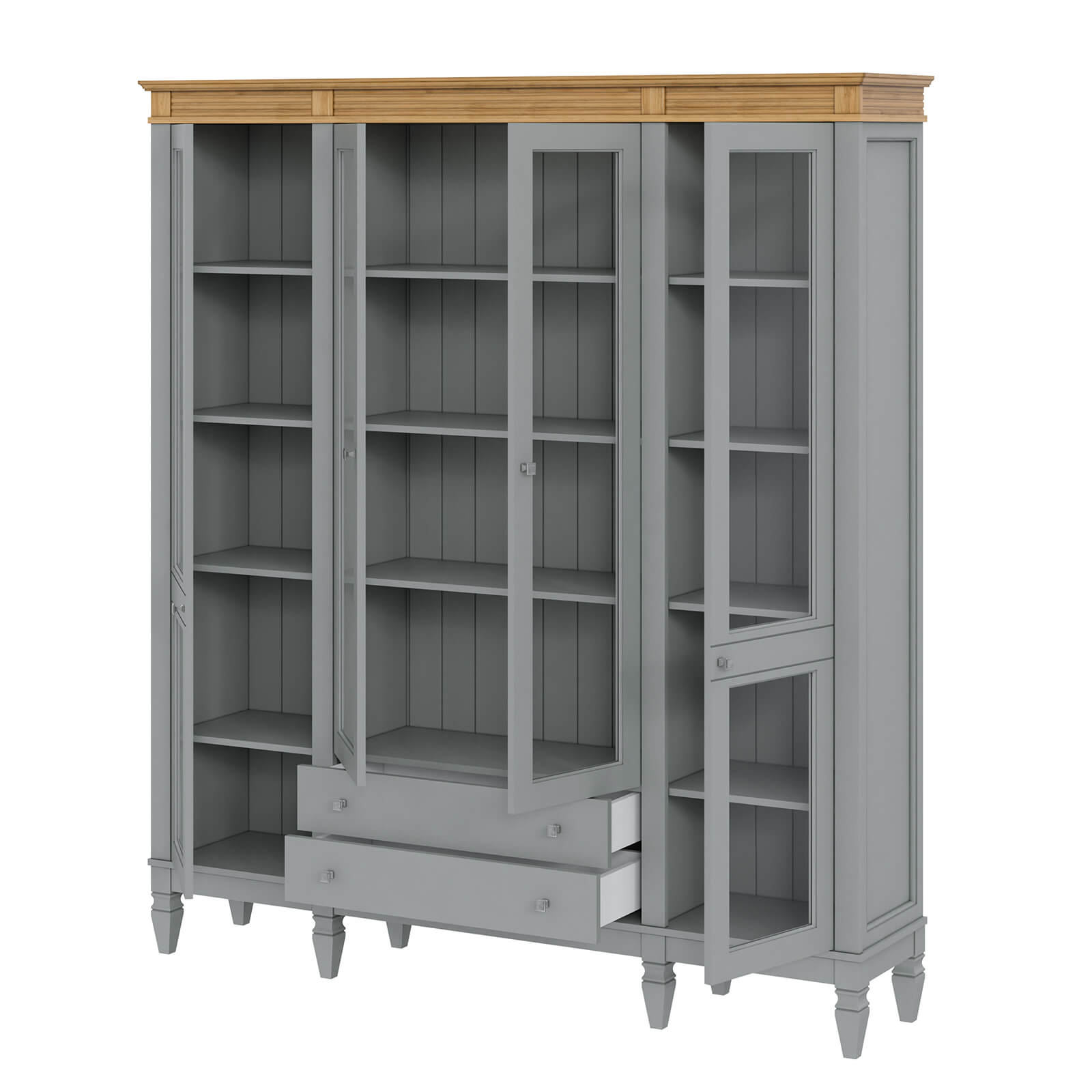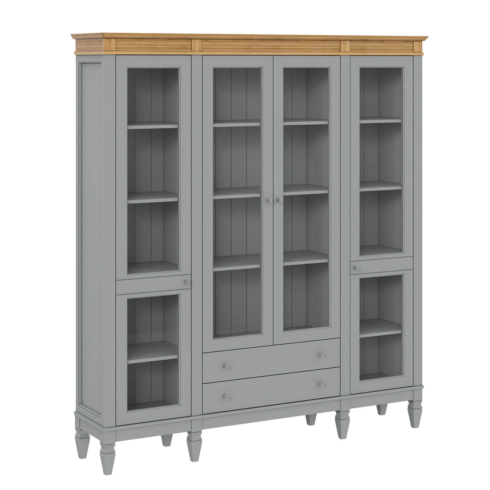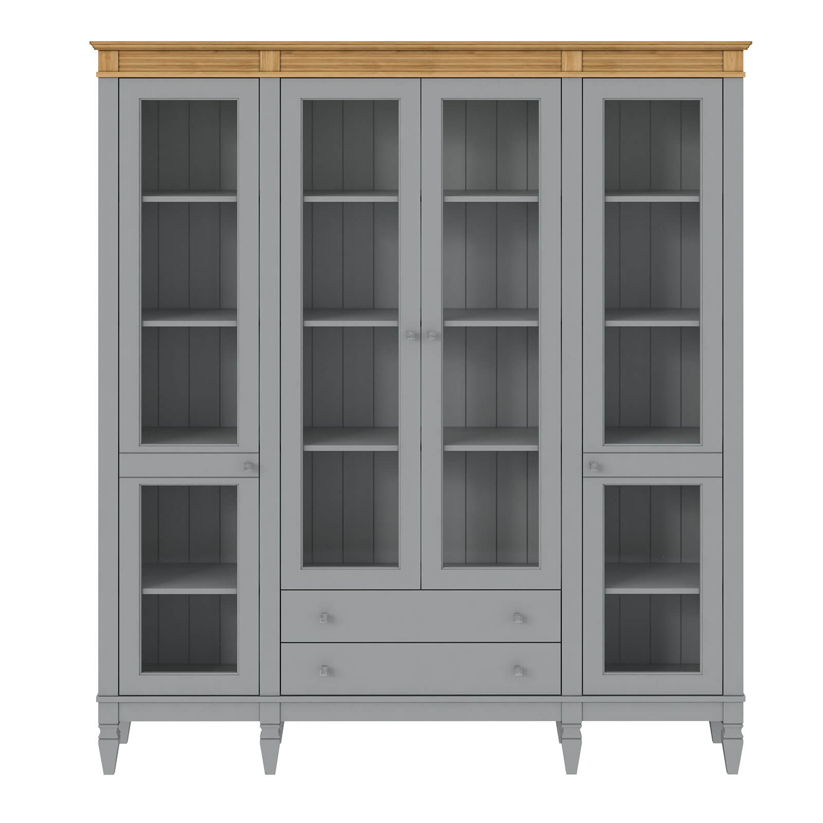 Деревянный стеллаж из сосны / кухонный буфет Ольса-422/002 серый №7042 + антик №24 массив сосны, визуально разделен на три вертикальных секции с 4 полками. Оснащен 4 распашными стеклянными дверцами и 2 ящиками.