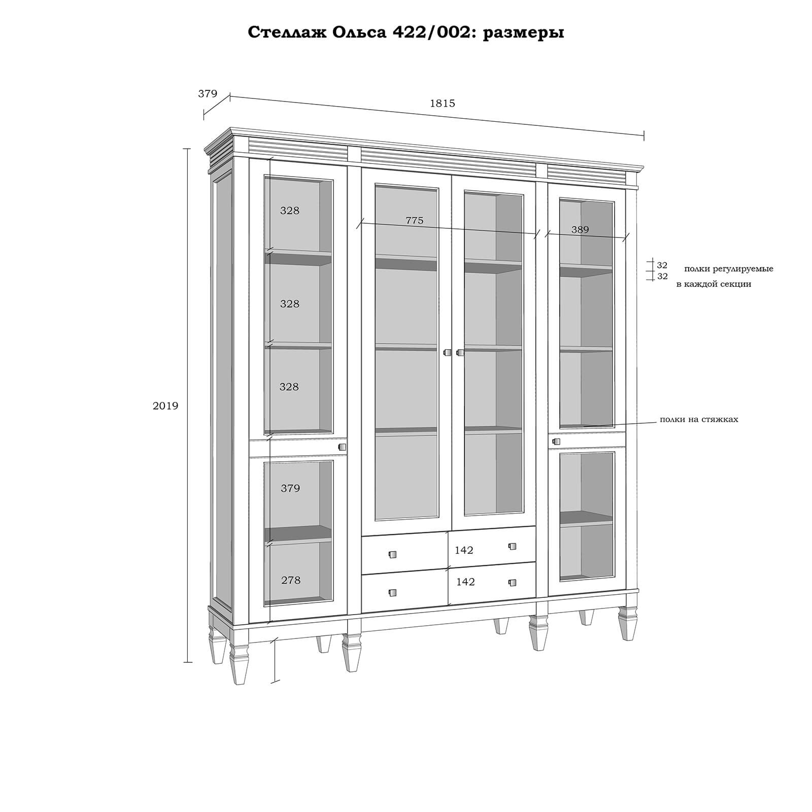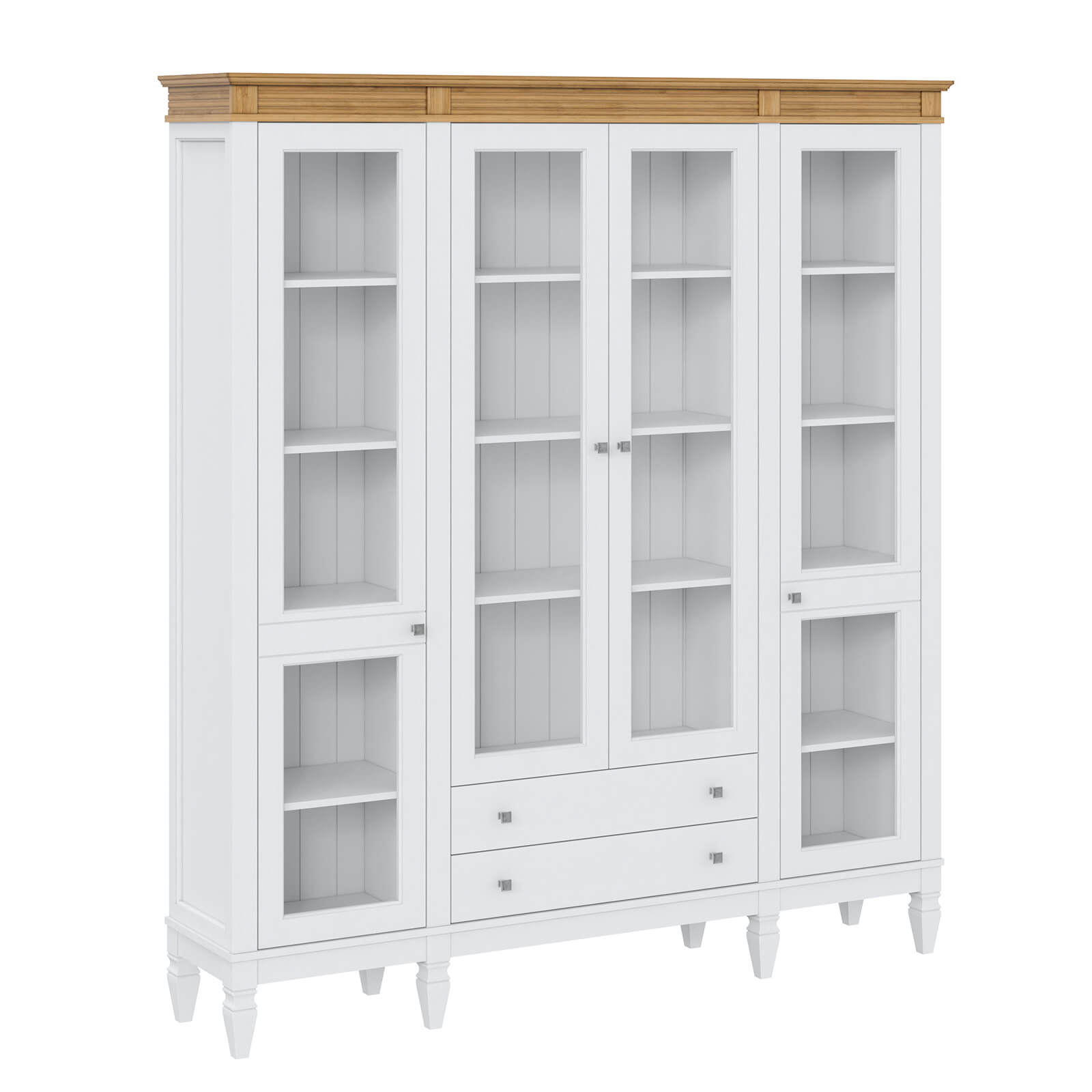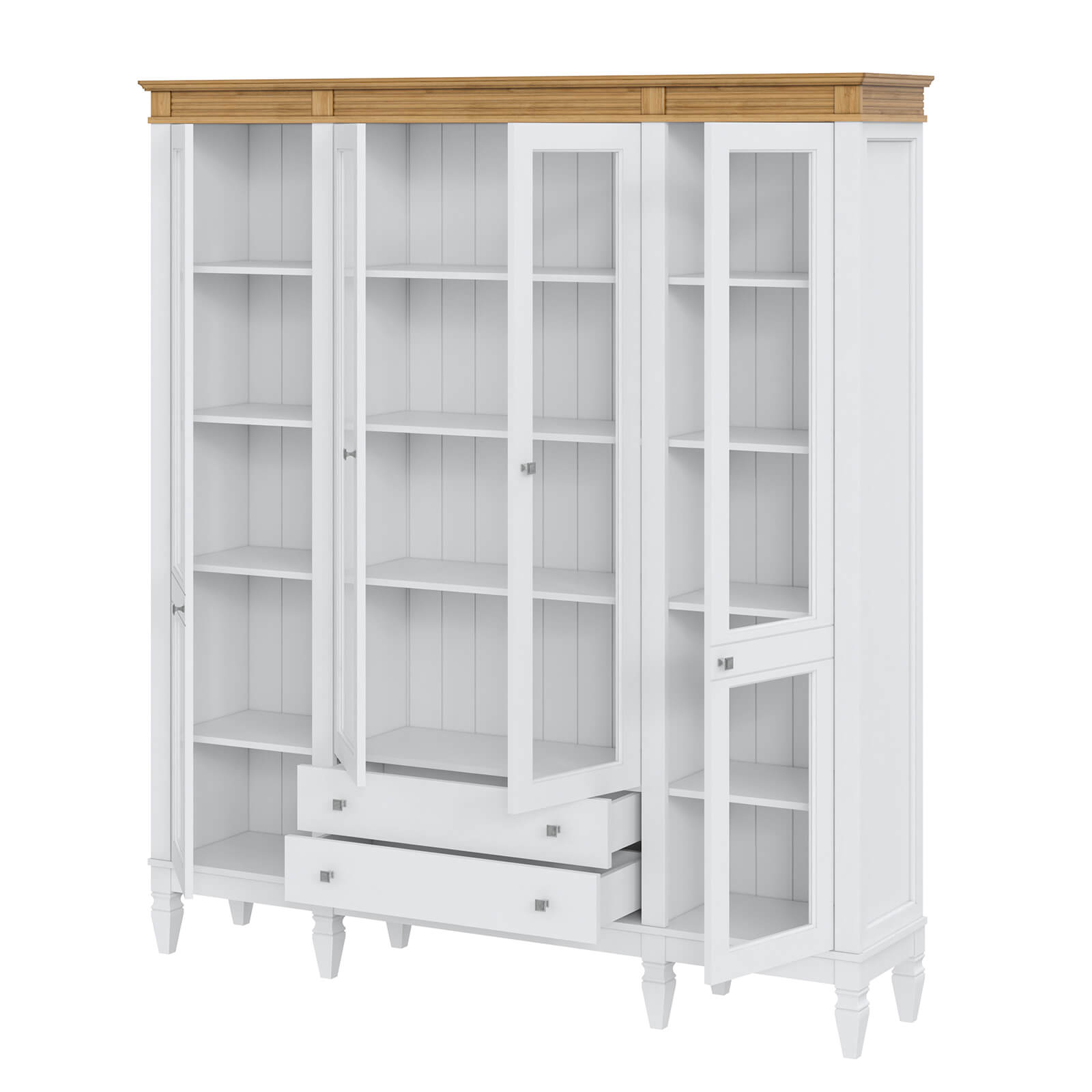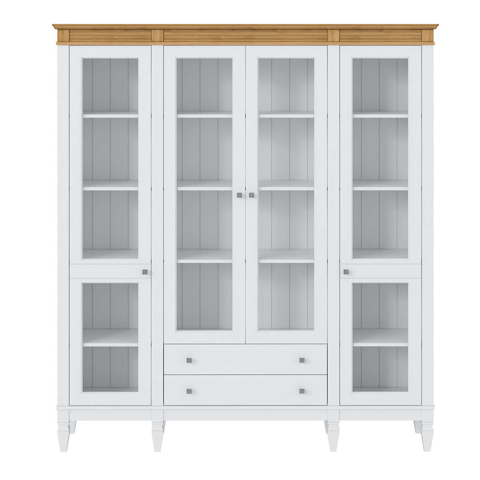 Деревянный стеллаж из сосны / кухонный буфет Ольса-422/002 Белый лак + антик №24 массив сосны, визуально разделен на три вертикальных секции с 4 полками. Оснащен 4 распашными стеклянными дверцами и 2 ящиками.