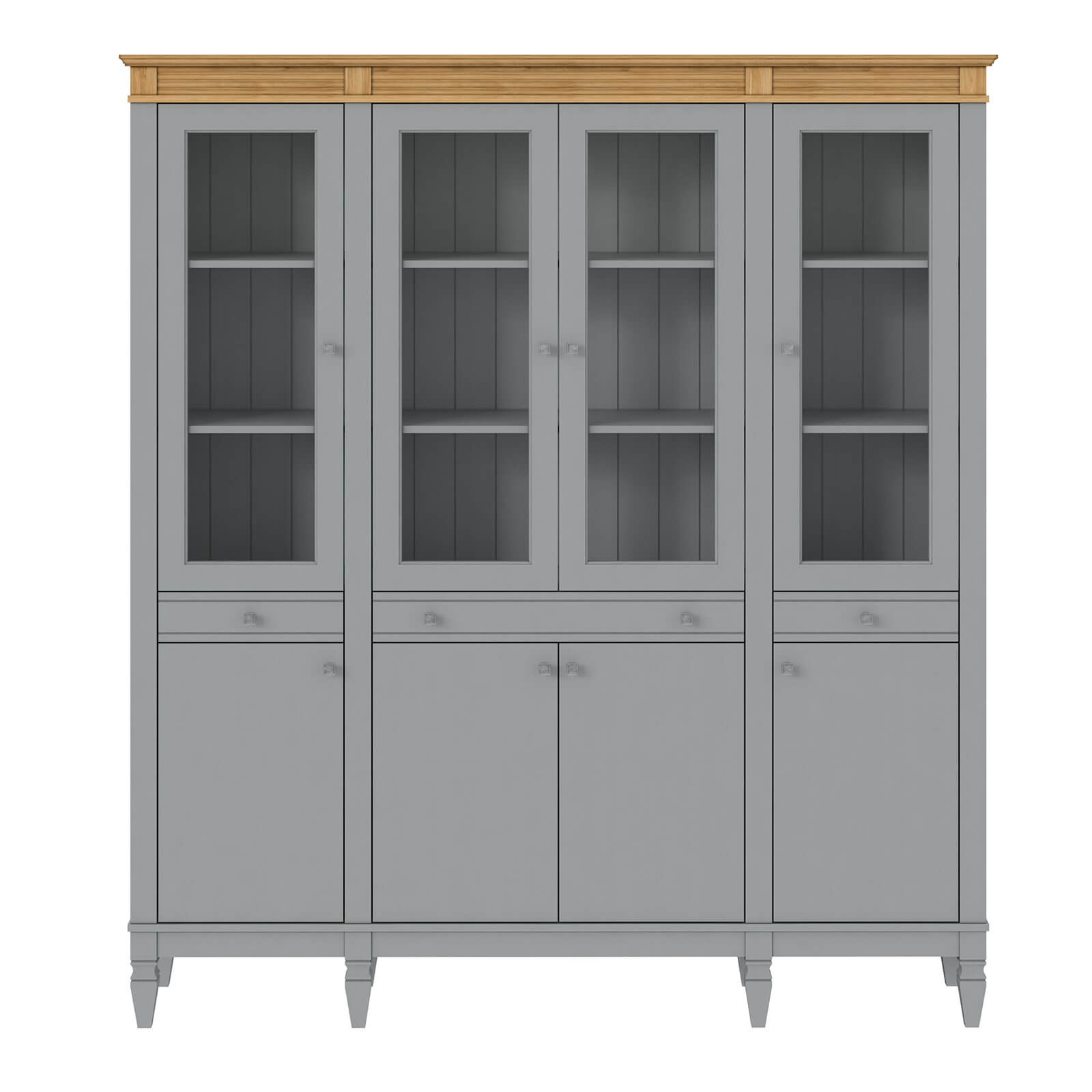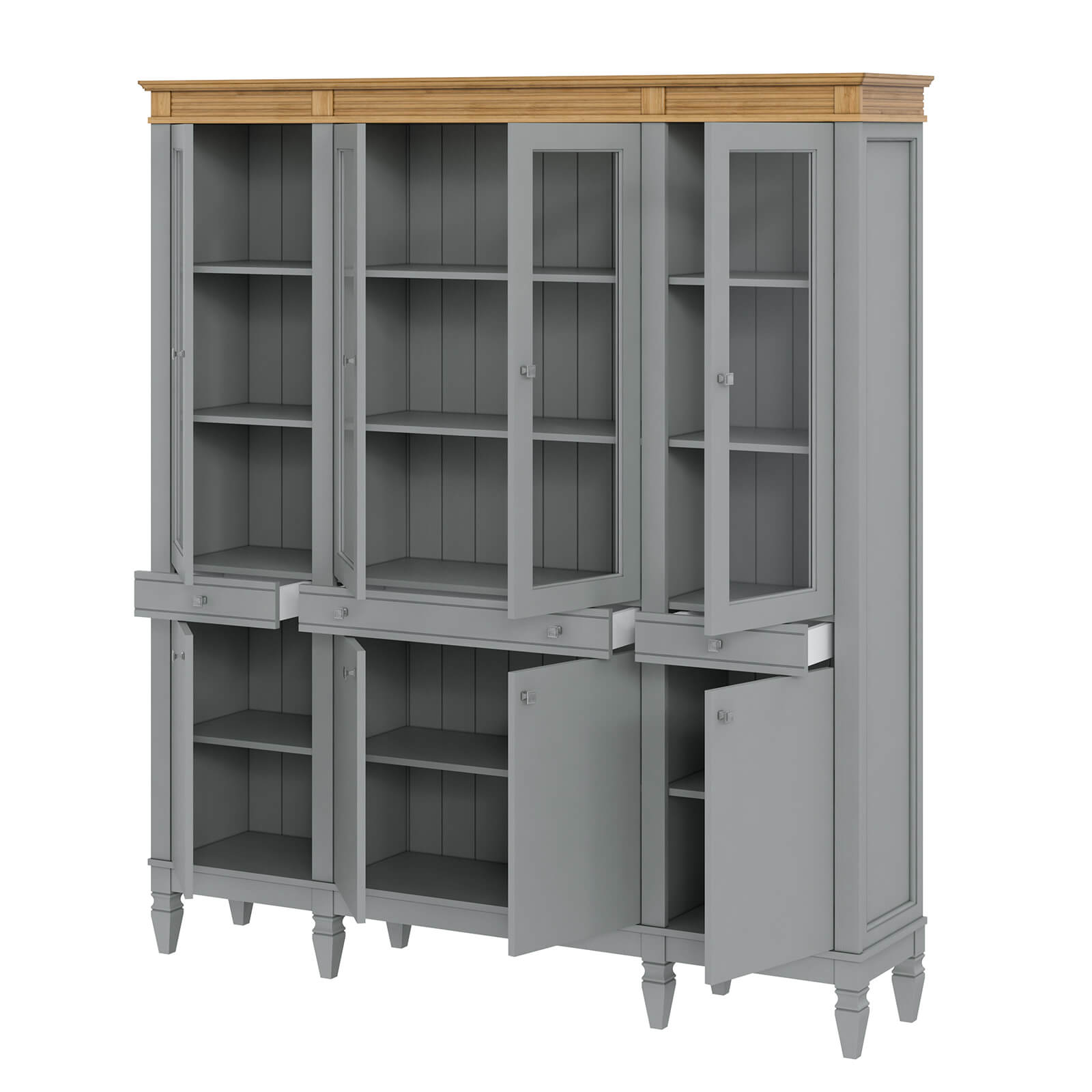 Деревянный стеллаж из сосны / кухонный буфет Ольса-404/430 серый №7042 + антик №24 массив сосны, визуально разделен на три вертикальных секции с 4 полками. Оснащен четырьмя стеклянными распашными стеклянными дверками, 4 глухие дверцы и 3 ящика.
