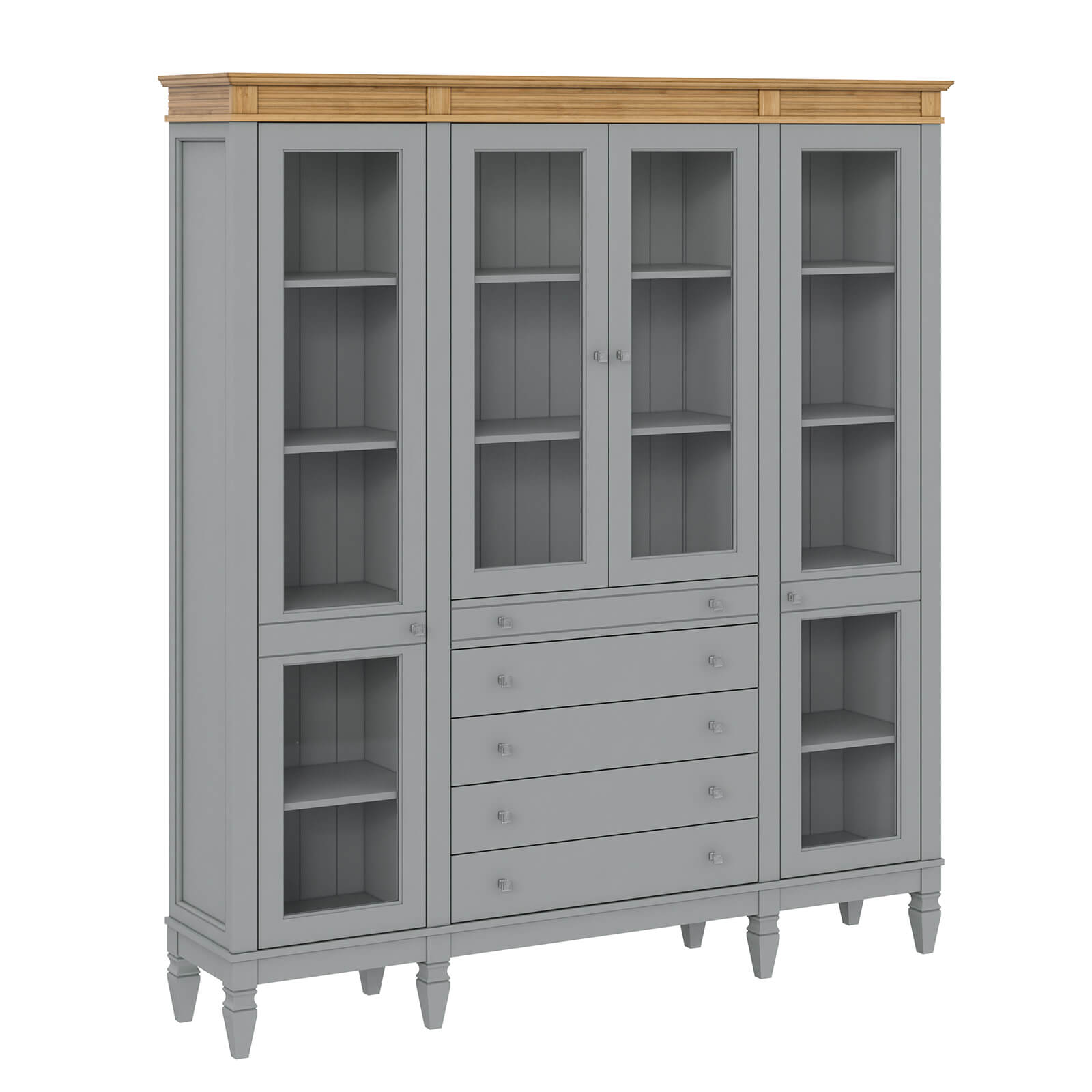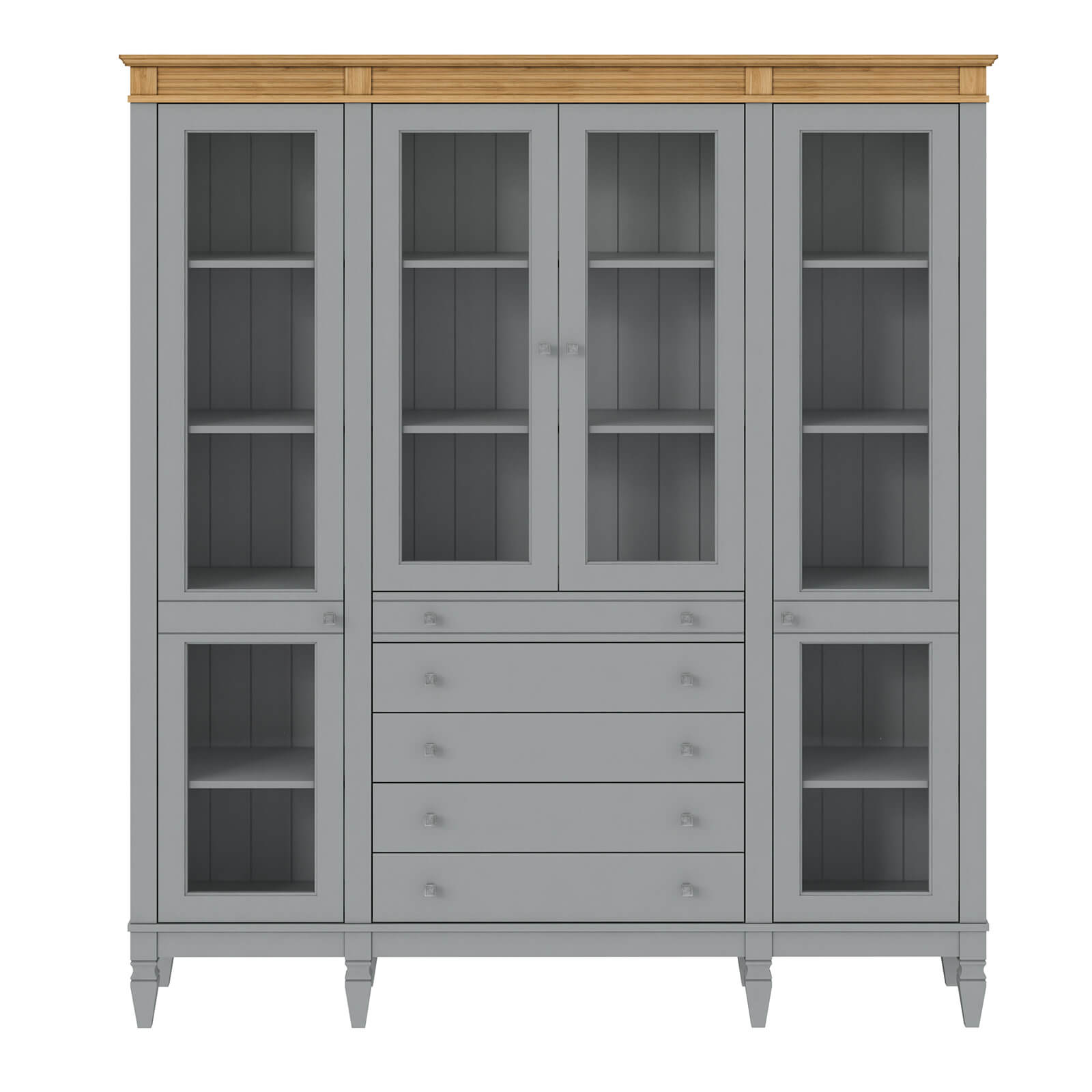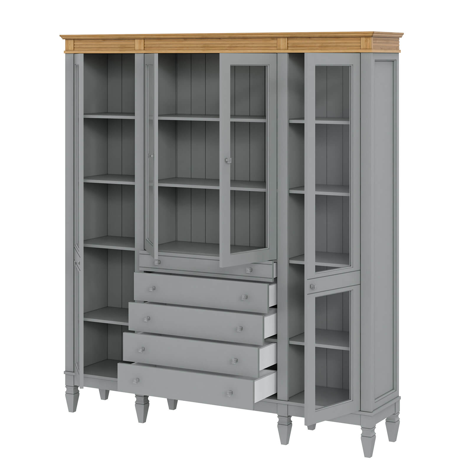 Деревянный стеллаж из сосны / кухонный буфет Ольса-422/014 серый №7042 + антик №24 массив сосны, визуально разделен на три вертикальных секции с 4 полками. Оснащен четырьмя стеклянными распашными стеклянными дверками и 5 ящиками.