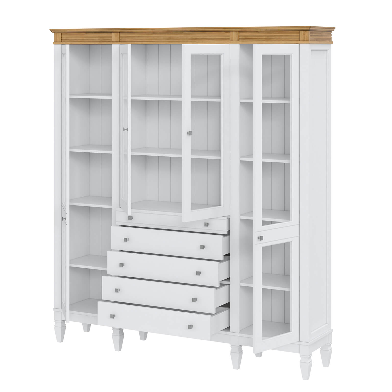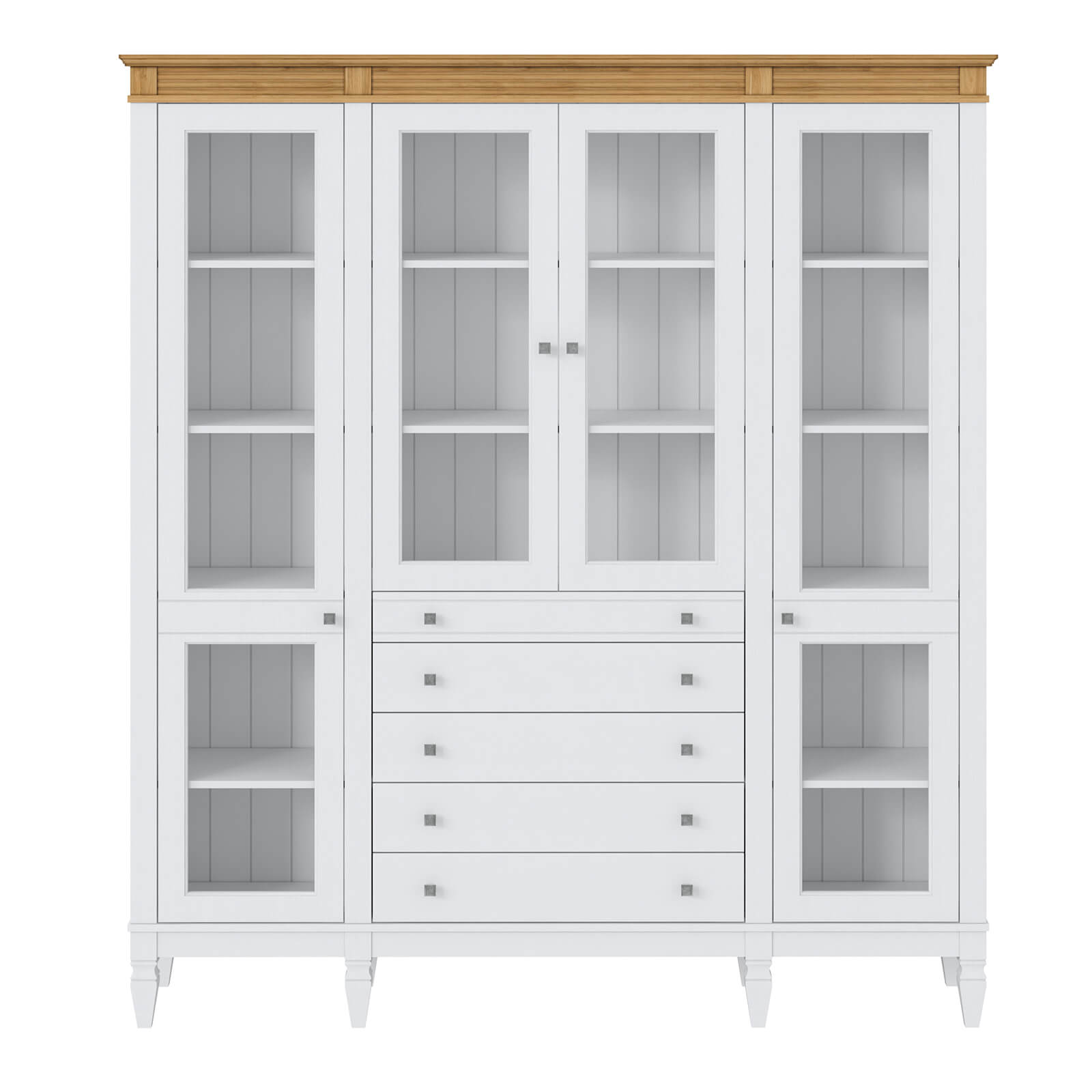 Деревянный стеллаж из сосны / кухонный буфет Ольса-422/014 Белый лак + антик №24 массив сосны, визуально разделен на три вертикальных секции с 4 полками. Оснащен четырьмя стеклянными распашными стеклянными дверками и 5 ящиками.