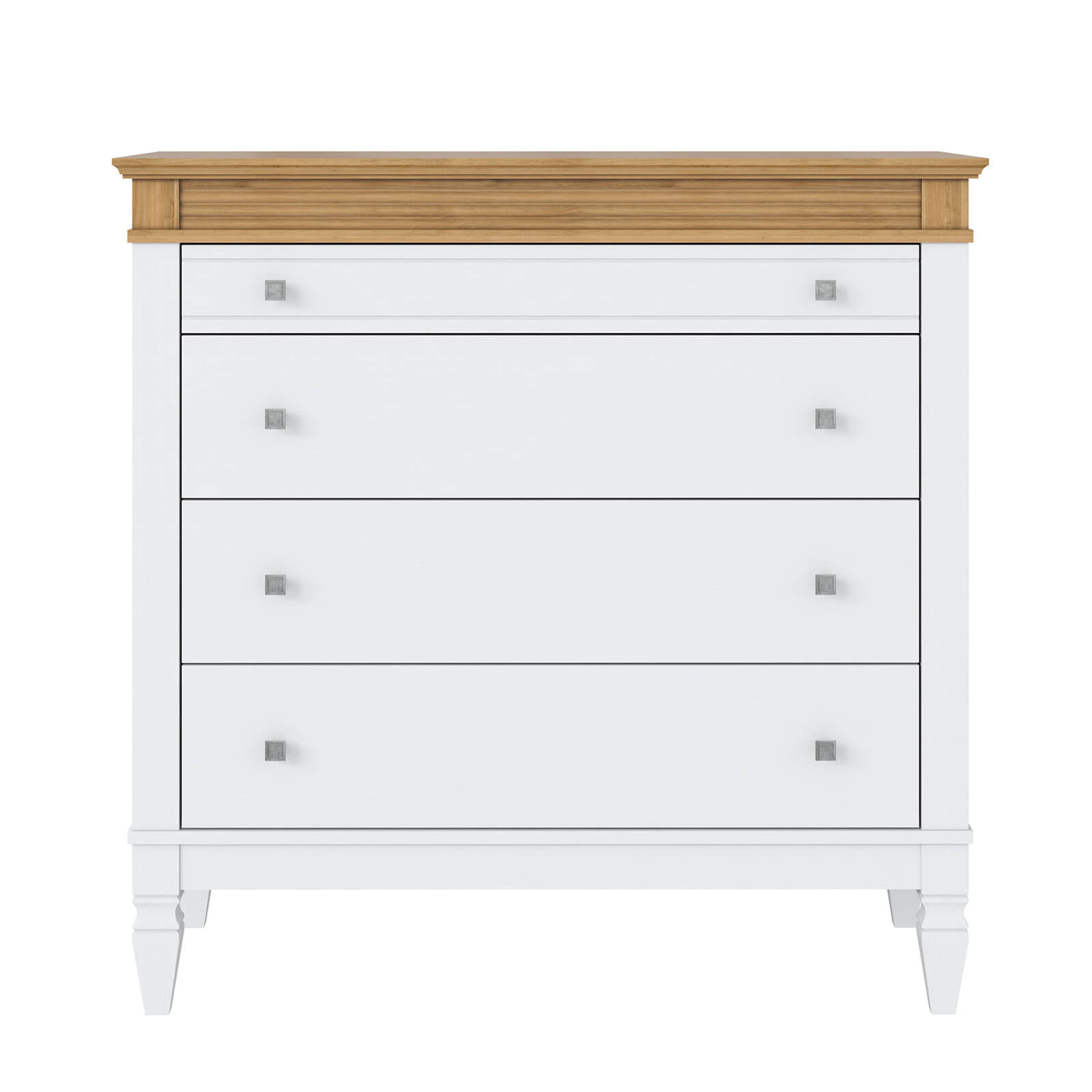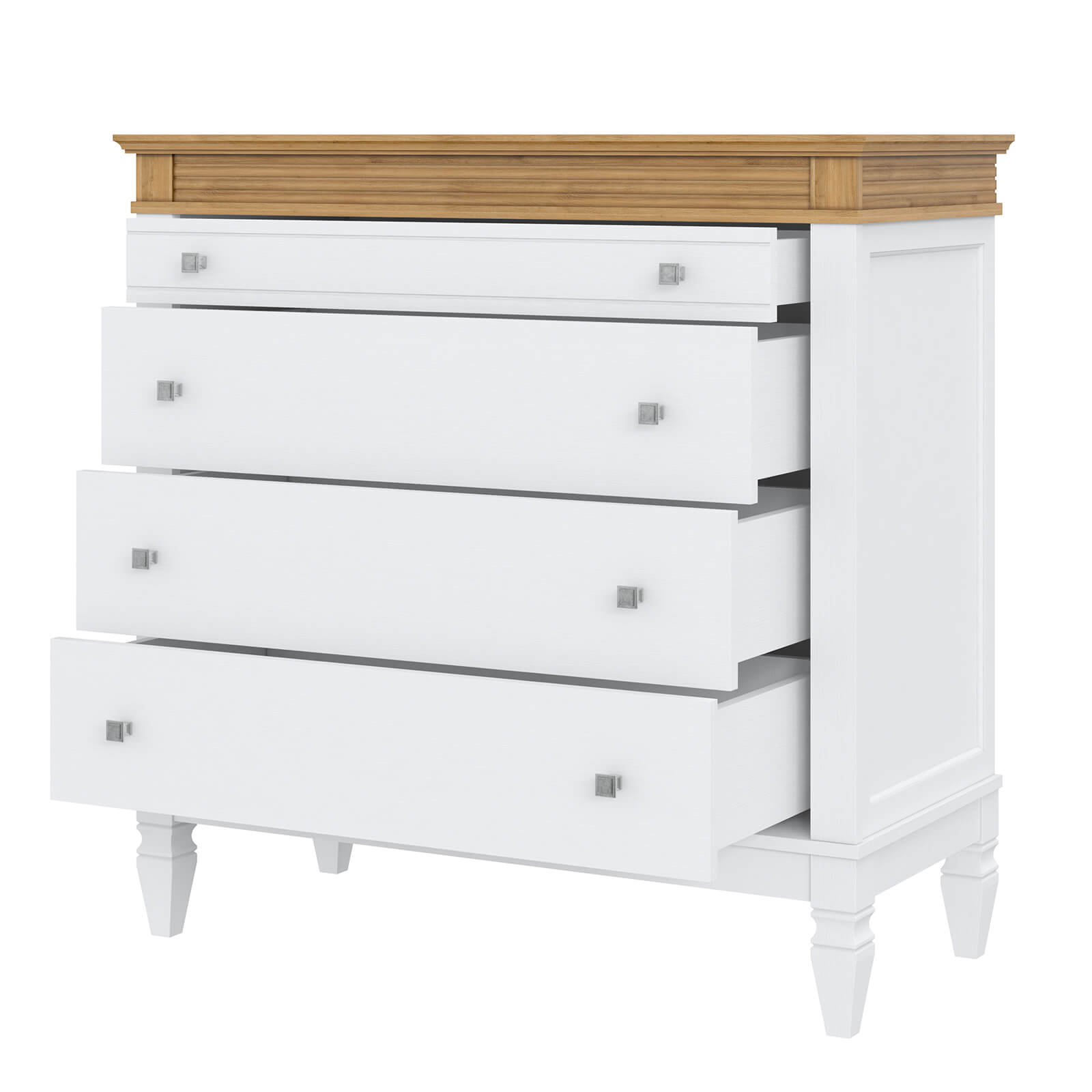 Комод Ольса 204 Белый лак + антик №24 с 4 ящиками, изготовлен из соснового массива.