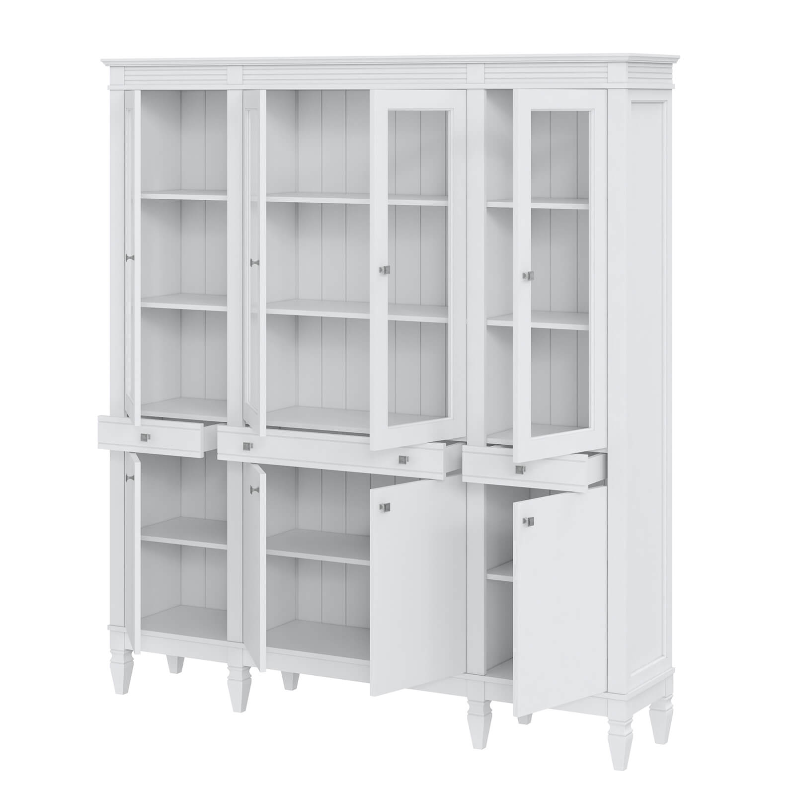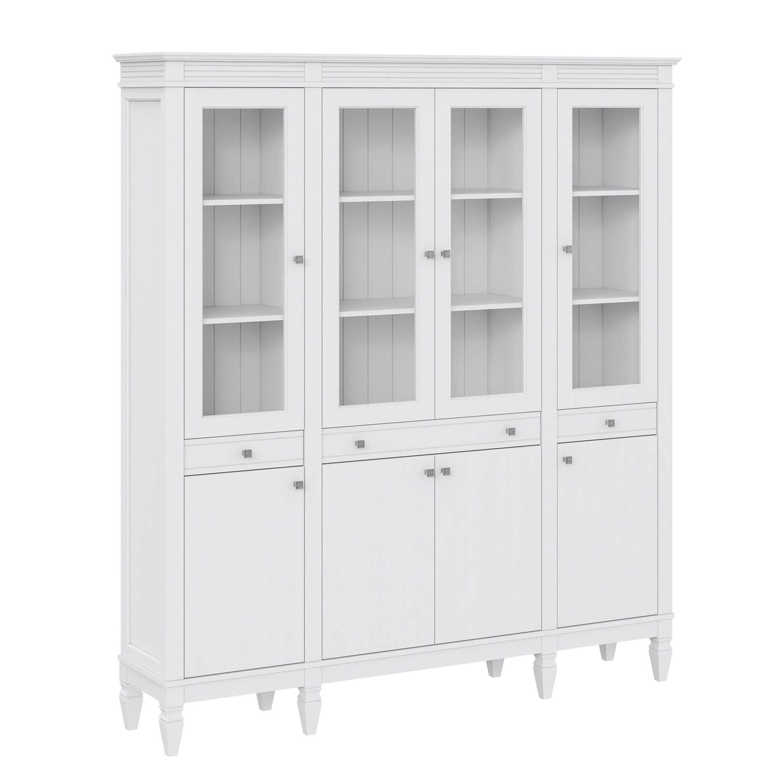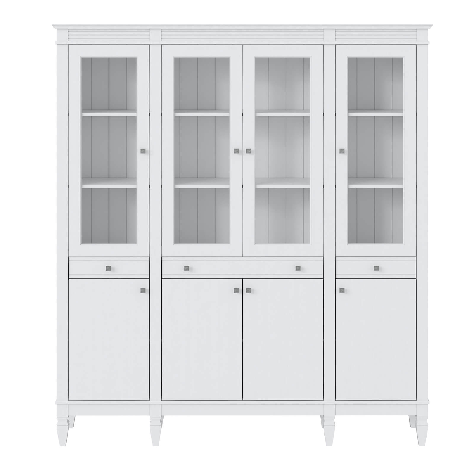 Деревянный стеллаж из сосны / кухонный буфет Ольса-404/430 Белый лак массив сосны, визуально разделен на три вертикальных секции с 4 полками. Оснащен четырьмя стеклянными распашными стеклянными дверками, 4 глухие дверцы и 3 ящика.