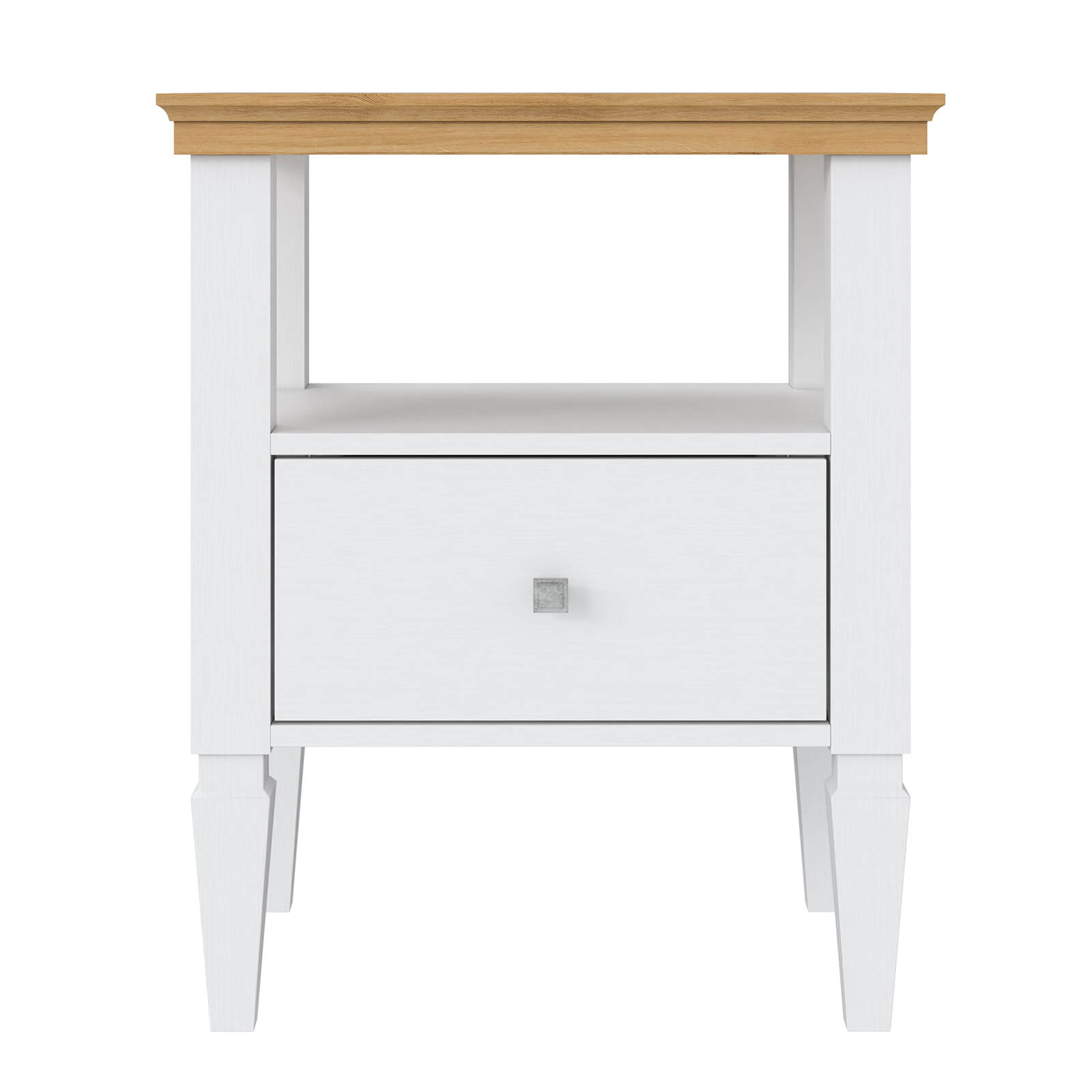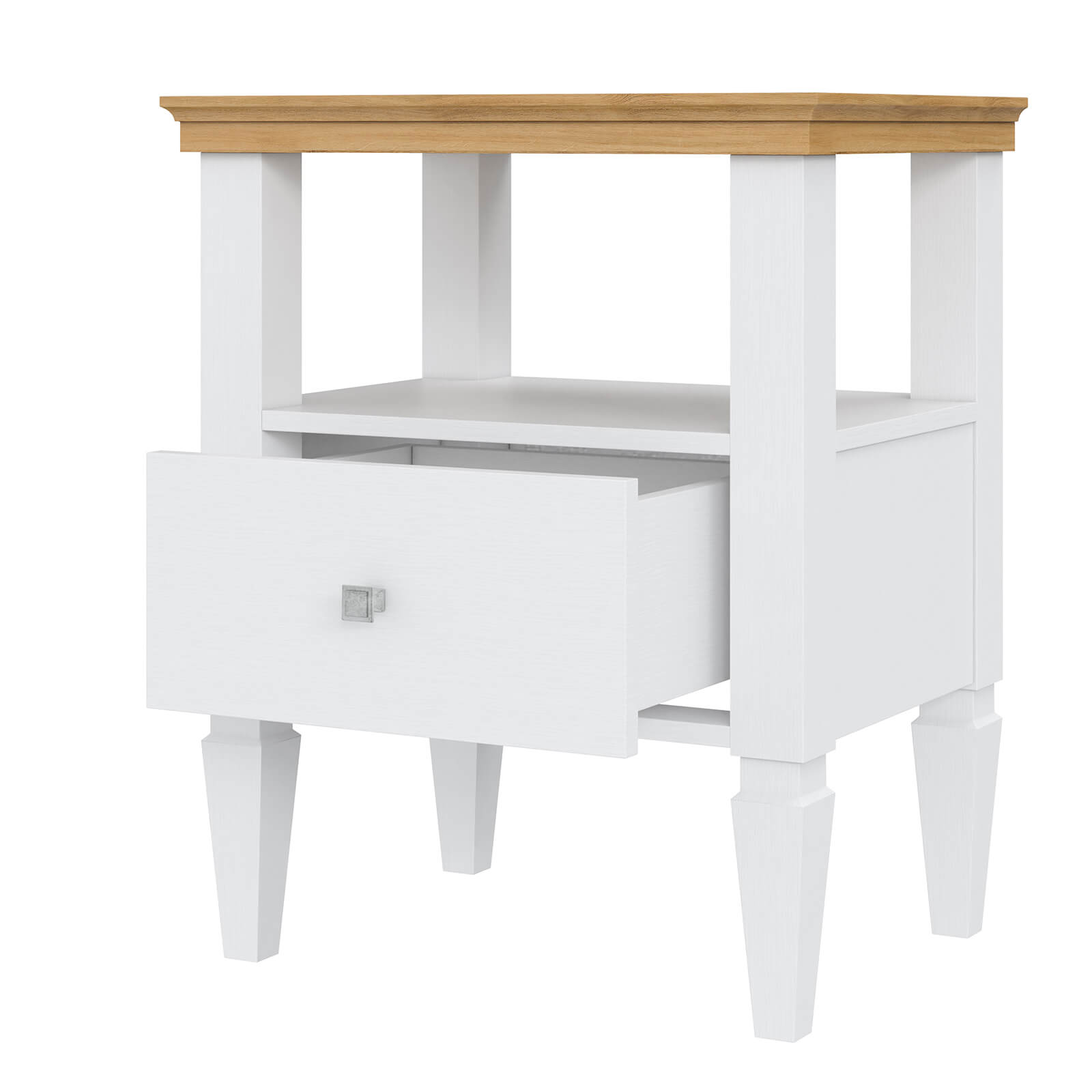 Тумба прикроватная Ольса-01 Белый лак + антик №24 с открытой верхней нишей и ящиком под ней, изготовлена из соснового массива.