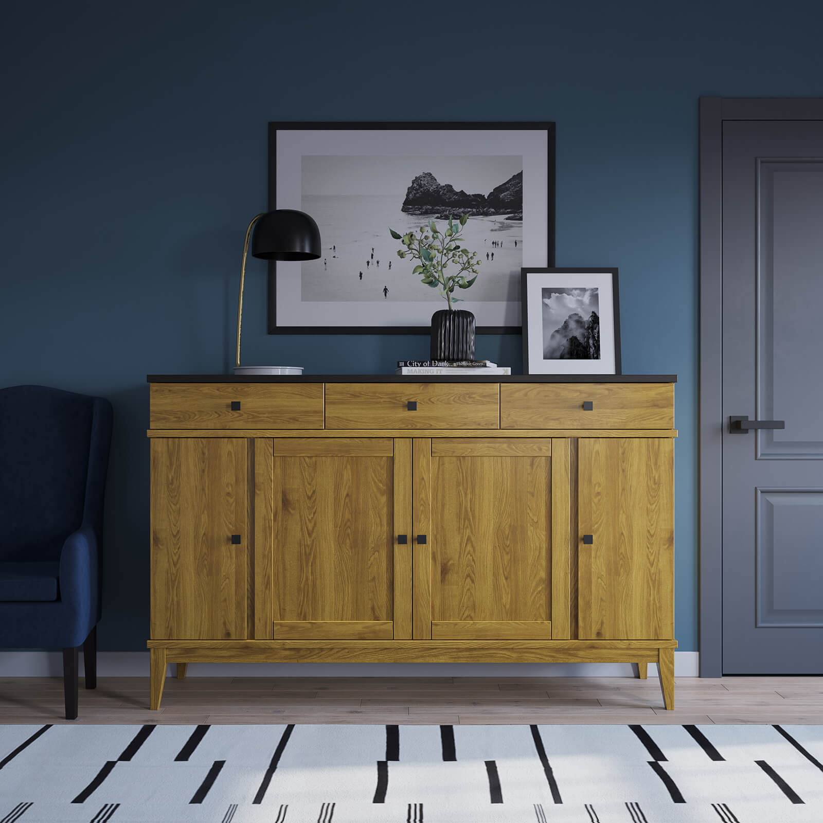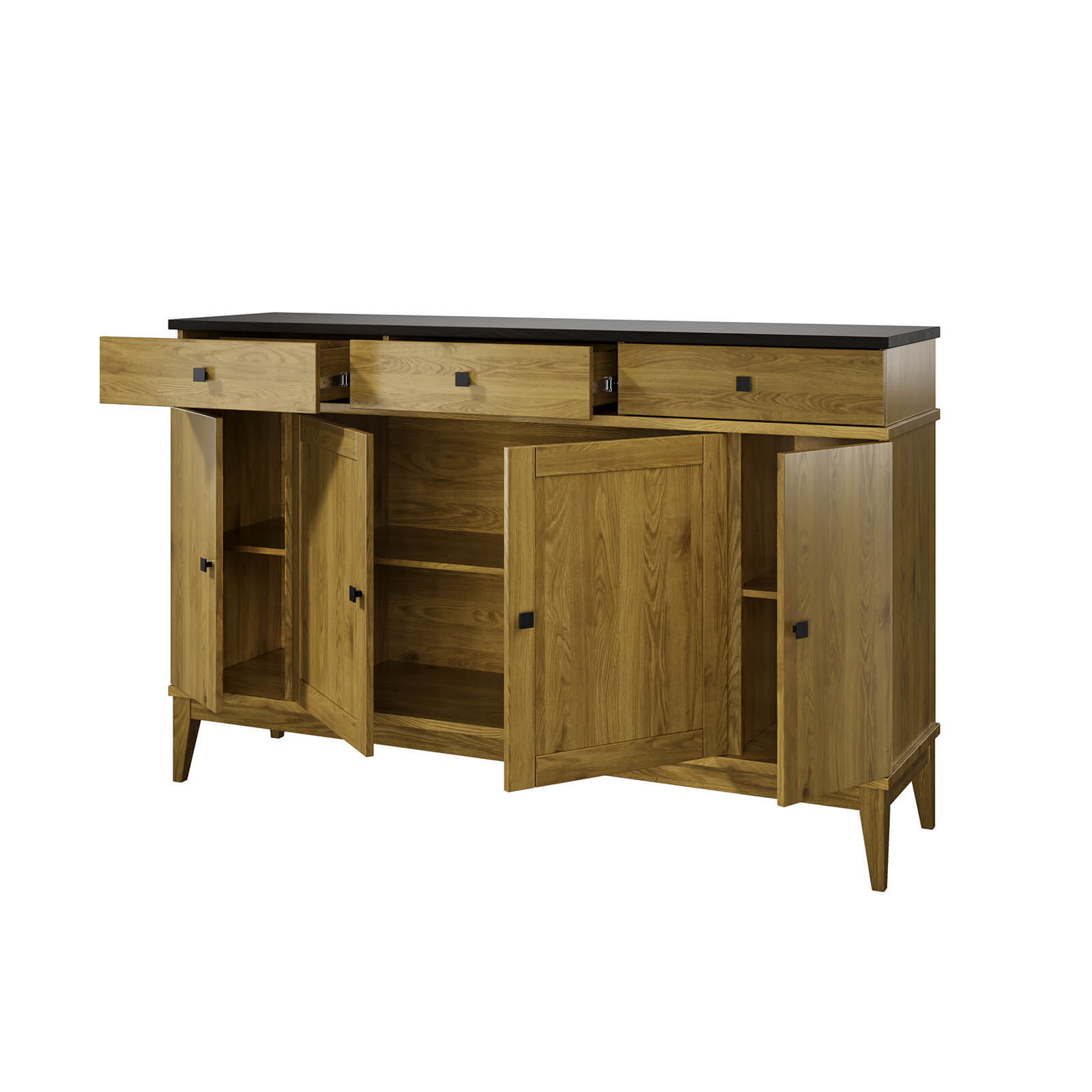 В верхней части тумбы - три ящика одинаковой вместимости, которые передвигаются на телескопических направляющих полного выдвижения