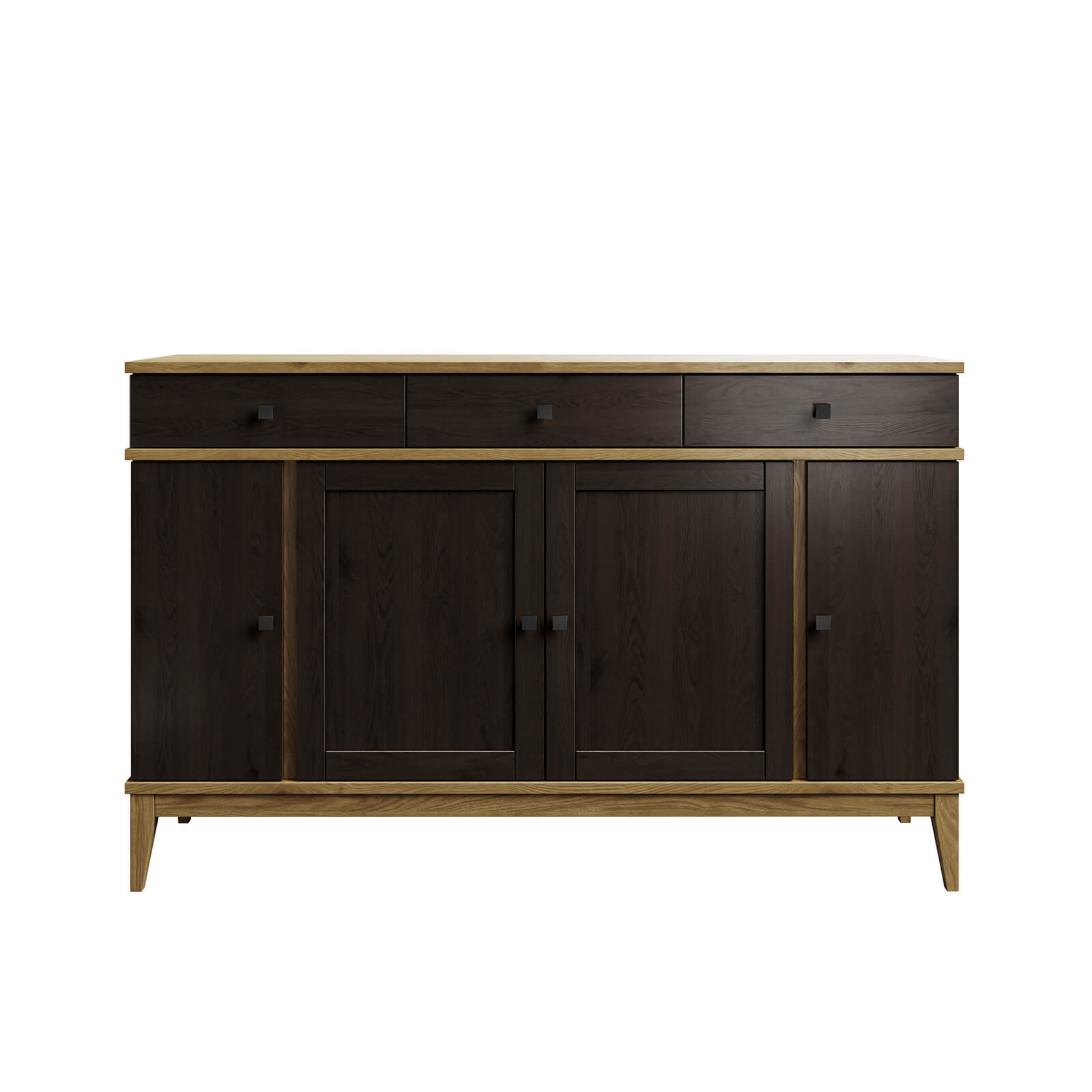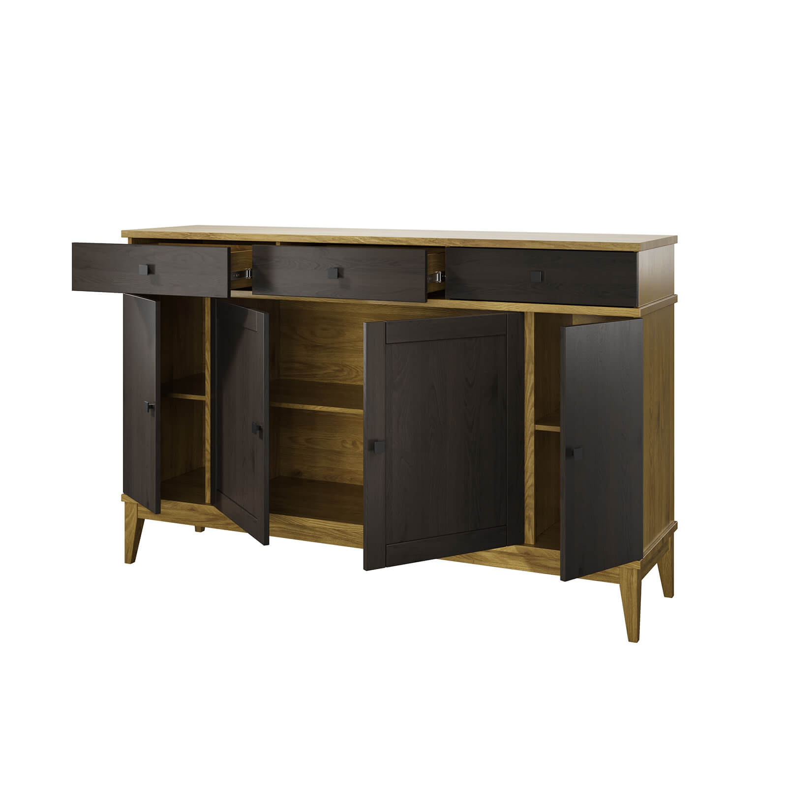 В верхней части тумбы - три ящика одинаковой вместимости, которые передвигаются на телескопических направляющих полного выдвижения