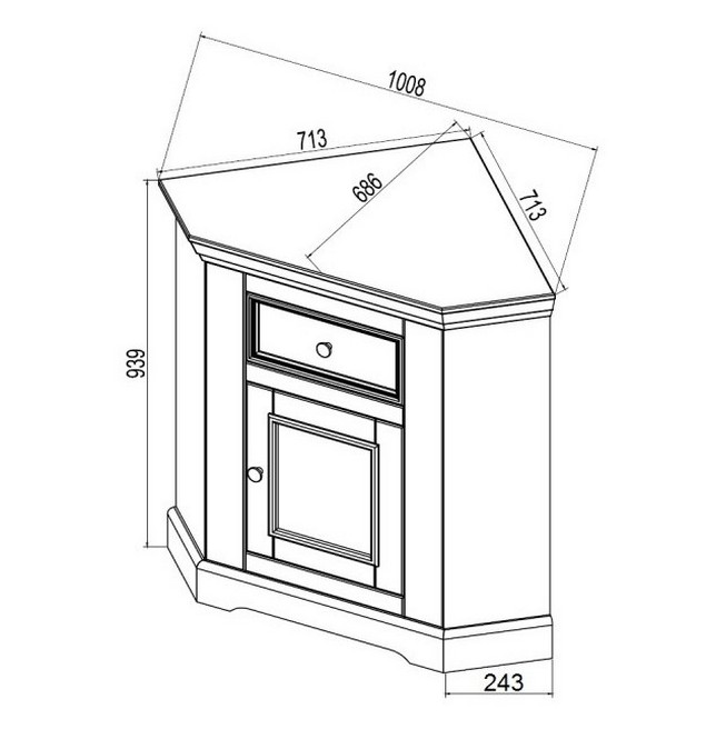 Комод имеет дверку и один выдвижной ящик на роликовых направляющих, за дверкой имеется деревянная полка. Глубина по боковым сторонам угла 713 мм
