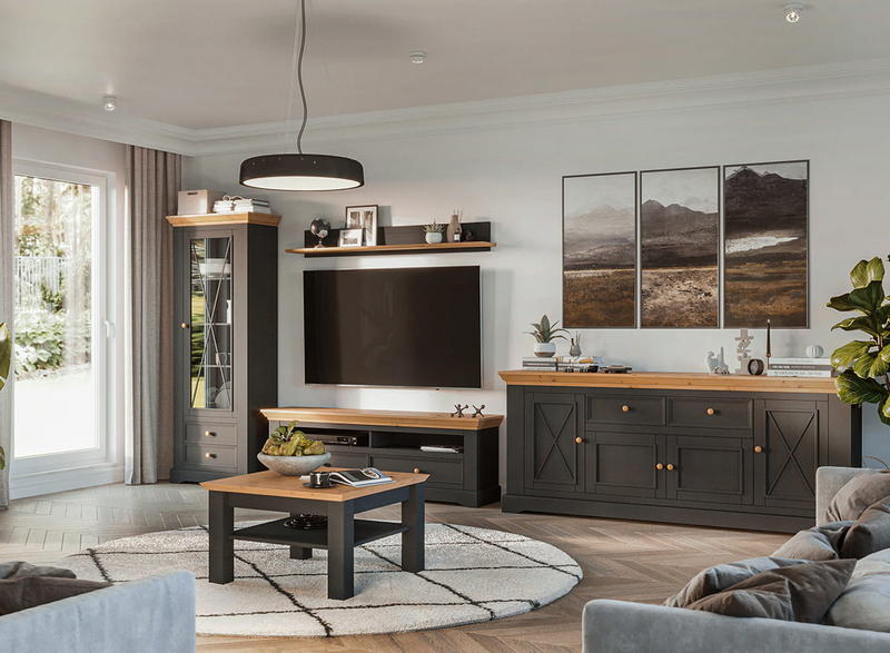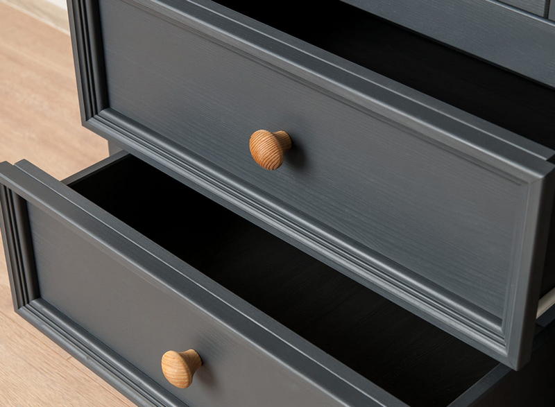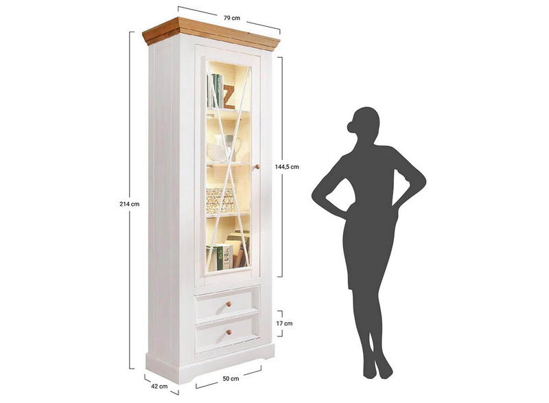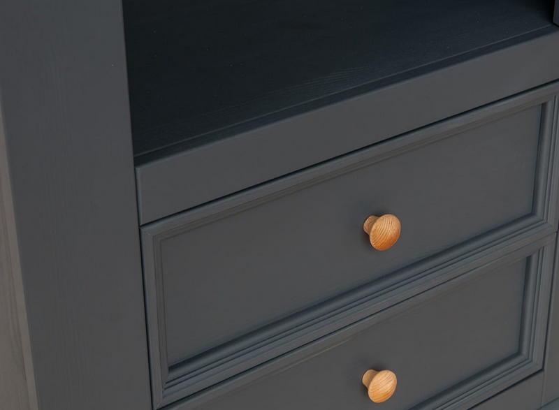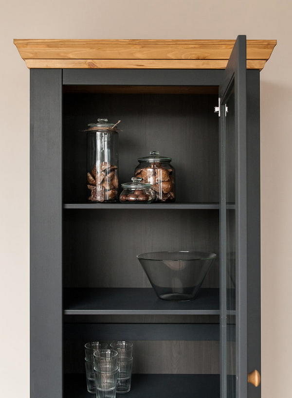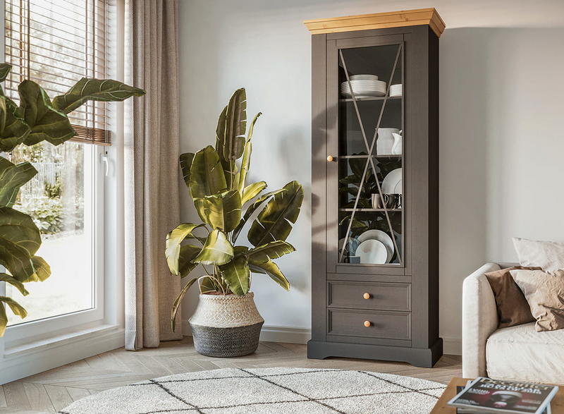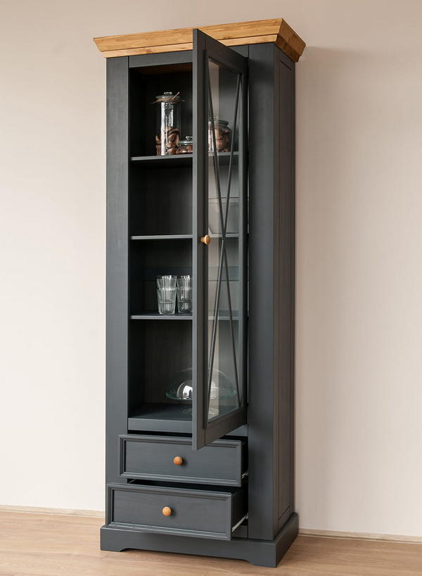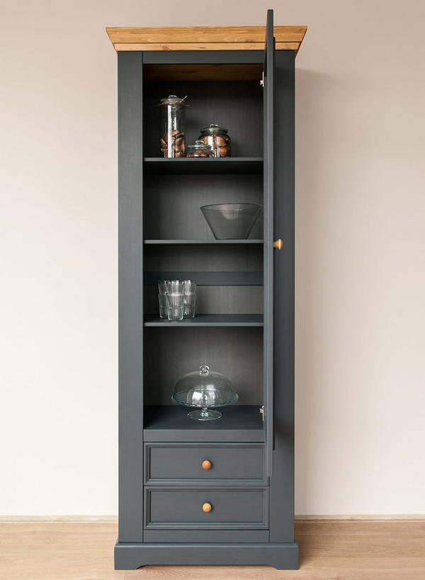 Однодверная модель - Шкаф Форест для посуды узкий серый 7012/бейц-масло изготовлена на фабрике из качественного соснового массива. Имеет высокую стеклянную дверку - внутри 3 полки, переставляемые по высоте, ниже – два плавно движущихся ящика на роликах.